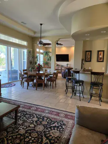 Spectacular vacation home with exceptional mountain views right on the golf course the 18th hole of Pete Dye. Open concept living with kitchen, dining area and living room one open space. The state-of-the-art kitchen is equipped with top-of-the-line appliances. Ideal for entertaining. The main bedroom offers, king size bed, ensuite bathroom, shower & tub, duels sinks and a walk-in closet, plus access to the back patio and pool. 2 guest bedrooms offer queen size beds, ensuite bathrooms and walk-in closets. The 4th bedroom is equipped with a full-twin stackable. The lush, landscaped backyard with pool and spa, includes a fabulous built-in barbecue for your al fresco dining. This home provides the best of desert living.