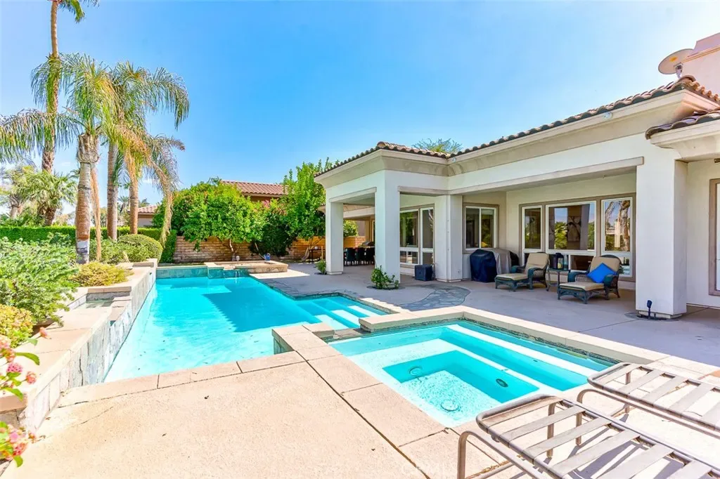 Enjoy the sweeping South Mountain and Fairway Views on the Arnold Palmer Private Golf Course at Mission Hills on this premium lot. The home has 4 bedrooms plus detached Casita, separate office/gym , 5 Baths and powder room. The Casita is fully furnished with a mini fridge and wet bar. The spacious primary suite with golf course views includes high ceilings and dual bath rooms with a large two custom walk in closet. The natural light flows through the multiple sliders and wall to wall windows. The step down open living room and dining room with wet bar create a cozy entertaining space. Step outside to discover a true paradise for you and your guests. The yard includes a sparkling heated pool and spa, a generous lawn area, and a covered patio that provides a perfect spot for additional seating minutes away from Palm Springs! The garage 2 car garage provides plenty of cabinets for storage in addition to a golf cart garage. The circular driveway adds both convenience and curb appeal. Don’t miss out the opportunity to make this remarkable home your own and enjoy the luxurious lifestyle it has to offer.
