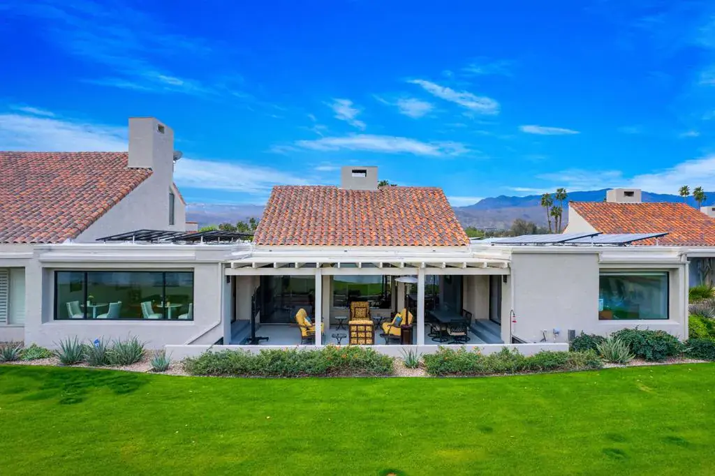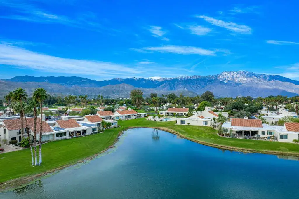 Experience true resort living in this spectacular lakefront residence overlooking the 18th hole of the famed Dinah Shore Tournament Course, the Mission Hills Country Club clubhouse, and the majestic mountains beyond. The private, covered outdoor living room is a showpiece–perfect for entertaining, relaxing, or enjoying peaceful mornings and unforgettable sunsets reflected across the water.A spacious, south-facing courtyard recently renovated offers an inviting setting for gatherings and seamless indoor-outdoor living. Inside, the light-filled living room features vaulted ceilings, stunning updated flooring, a custom built-in entertainment center, fireplace, motorized shades, and tranquil lake views.Designed for connection and comfort, the social kitchen includes a granite island with counter seating, stainless steel appliances, and opens effortlessly to the dining room/den/game room, all framed by forever lake views and motorized shades. The primary suite is a serene retreat with breathtaking lake views boasting a recently updated bath with double vanities, and a walk-in closet.Two spacious guest bedrooms, each with an updated en-suite bath, provide ideal accommodations for family, friends, or a home office. Additional highlights include owned solar and close proximity to the community pool and spa completing the ultimate Mission Hills resort lifestyle.Your private lakefront desert paradise awaits.