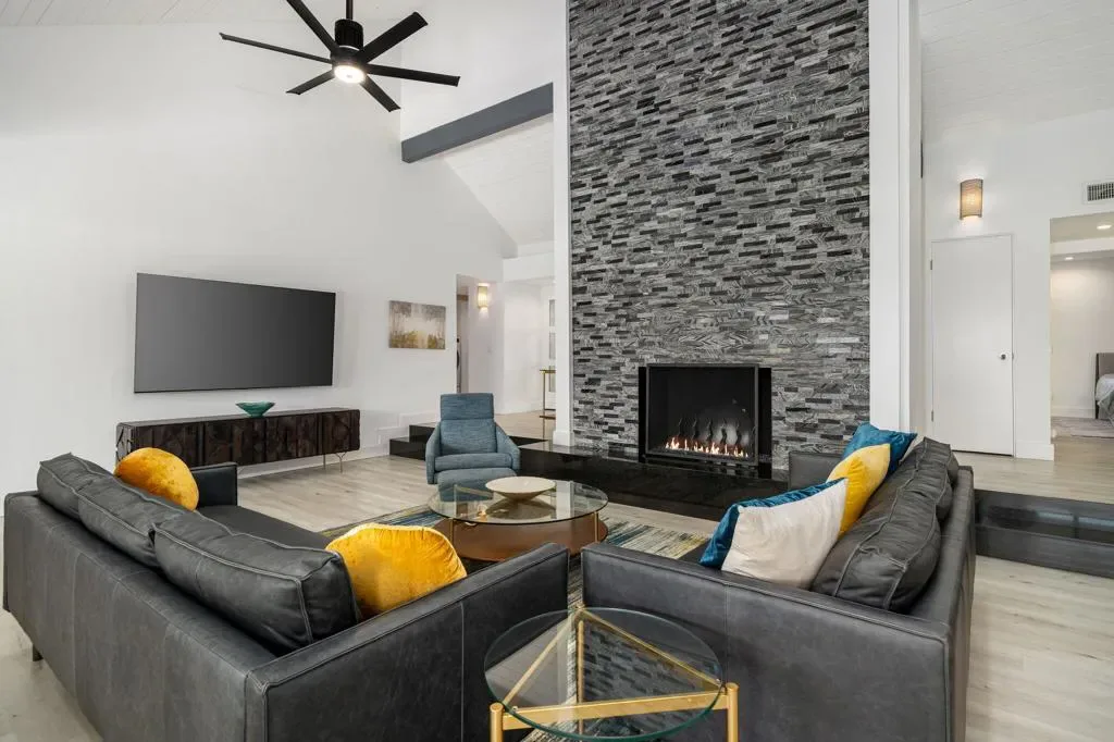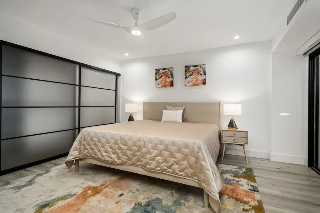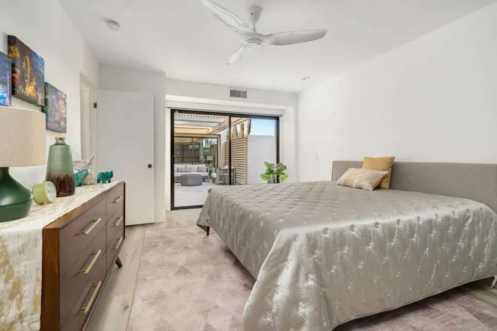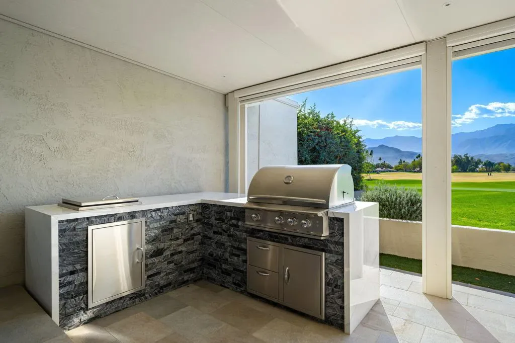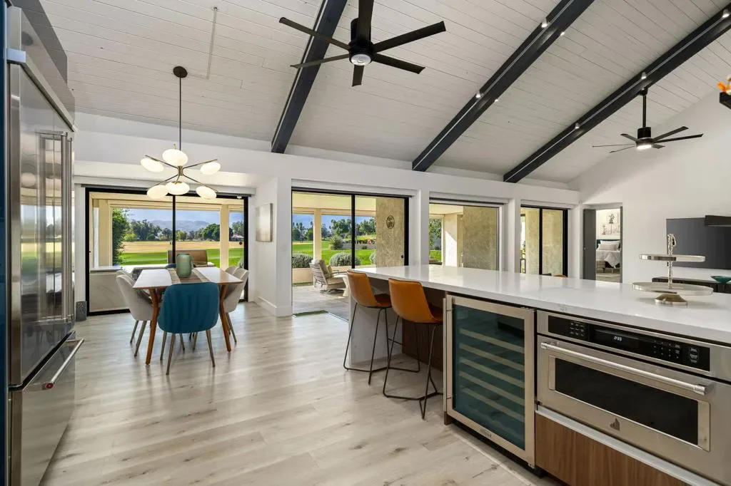 Welcome to Mission Hills Country Club living at its finest. This beautifully updated residence offers spectacular, unobstructed views of the San Jacinto Mountains and the sweeping fairways of the famed Dinah Shore Tournament Course an idyllic backdrop for desert luxury. Inside, the home has been reimagined with gorgeous custom cabinetry throughout, sleek quartz countertops, and a stunning waterfall-edge quartz island that anchors the contemporary kitchen. Newer windows and sliding glass doors frame the panoramic views while enhancing energy efficiency and natural light. Modern comfort continues with a newer HVAC system, updated water heater, and thoughtful contemporary finishes in every room. Motorized shades–both inside and on the rear patio–allow you to transition seamlessly from bright desert days to soft, ambient evenings. Step outside to an expansive patio designed for effortless indoor-outdoor living, perfect for morning coffee, sunset cocktails, or watching golfers play through.