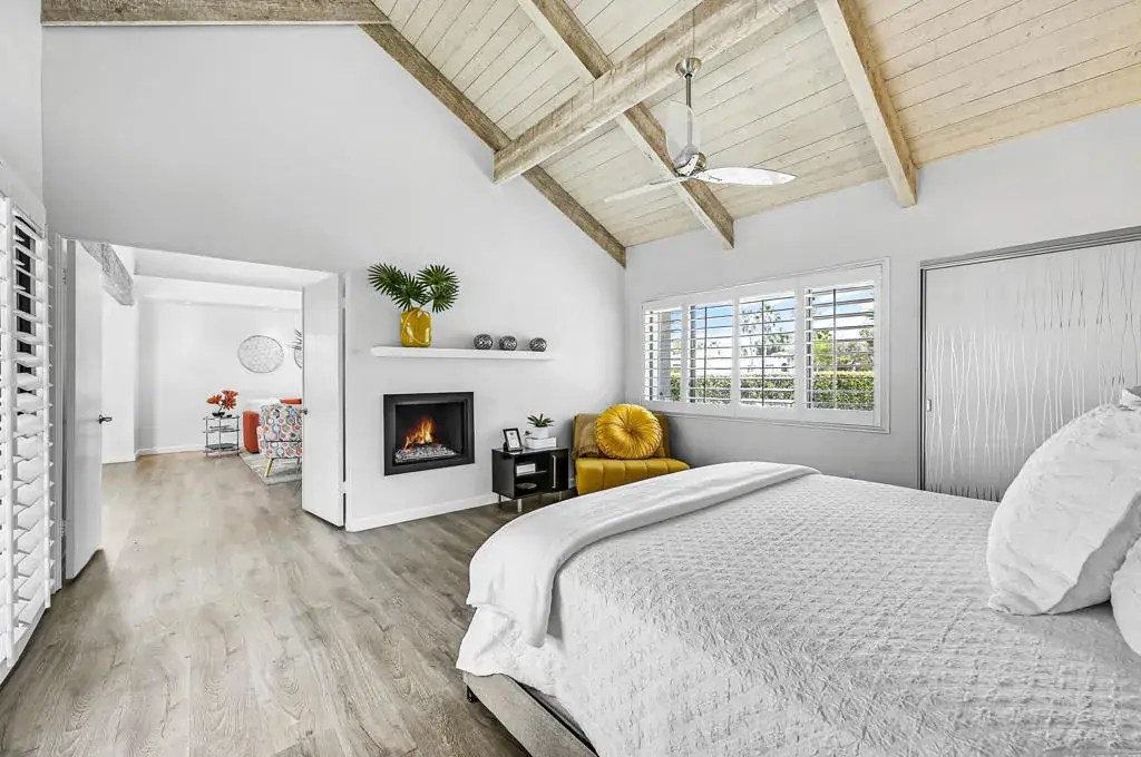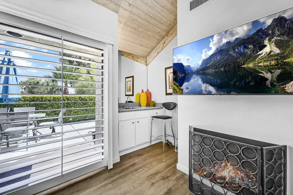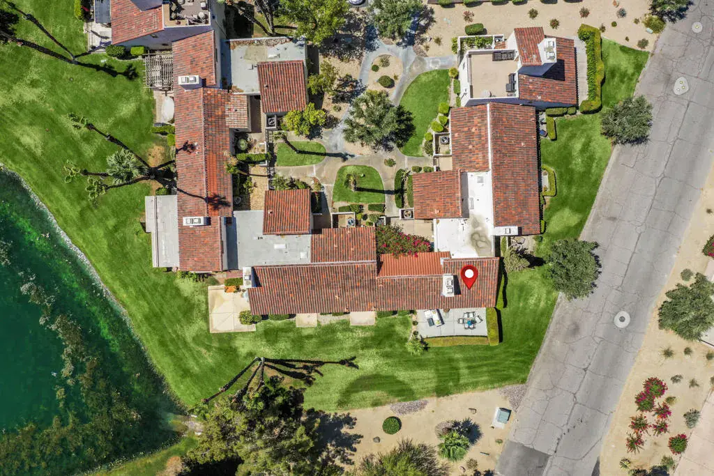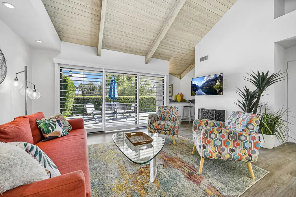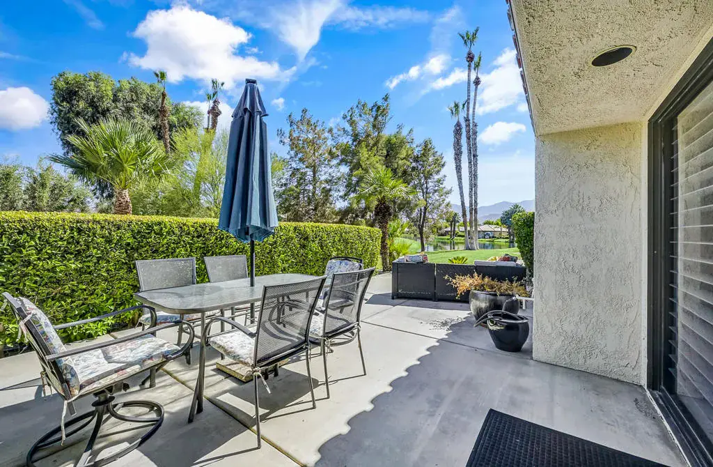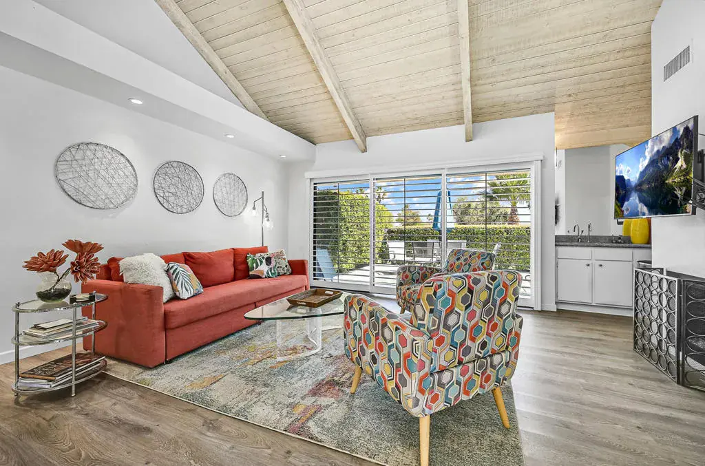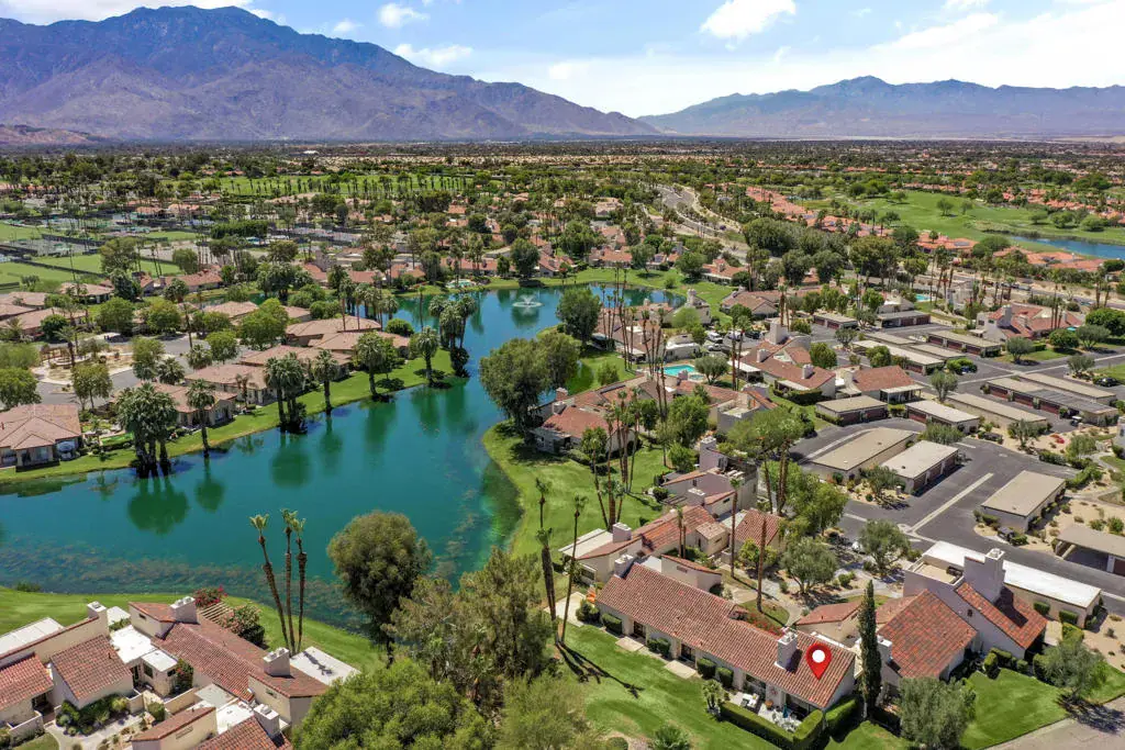 Welcome to a vibrant, turnkey-furnished retreat in the heart of Mission Hills Country Club. This beautifully updated 2-bedroom, 2-bathroom condo offers approximately 1,535 sq. ft. of stylish living designed for comfort, entertaining, and effortless desert living. Soaring wood-beamed vaulted ceilings, two sleek fireplaces, and luxury vinyl plank flooring throughout create a warm yet modern aesthetic. The open-concept living and dining spaces are filled with natural light from expansive sliders that open to a private patio with stunning lake and mountain views–an ideal setting for morning coffee, sunset dinners, or relaxed outdoor lounging. Thoughtful upgrades shine throughout the home, including updated bathrooms with quartz countertops, bold designer wallpaper, solid-surface shower wall panels, and curated decor that blends contemporary sophistication with playful charm. A truly unique detail is the custom pocket door with inset vintage glass, designed to minimize sound from the laundry area while adding character and style. The bright kitchen flows seamlessly into the dining area, and the wet bar makes entertaining effortless. Plantation shutters and vaulted ceilings further enhance the home’s airy, polished feel. The seller is motivated and open to negotiating the land lease renewal–bring your creativity. With a full-price offer, the seller will pay off the renewal fee. For land lease questions, please contact Susan Moua at (760) 883-1665, who manages the MHCC land lease department. Mission Hills Country Club offers a resort-style lifestyle with championship golf, tennis, pickleball, pools, spas, and a vibrant social scene, all set among picturesque citrus trees bearing grapefruit, oranges, and lemons. Ideally located just 15 minutes from Palm Springs International Airport, 45 minutes from Joshua Tree National Park, and two hours from Southern California’s beaches, this home is the perfect desert escape or full-time residence.