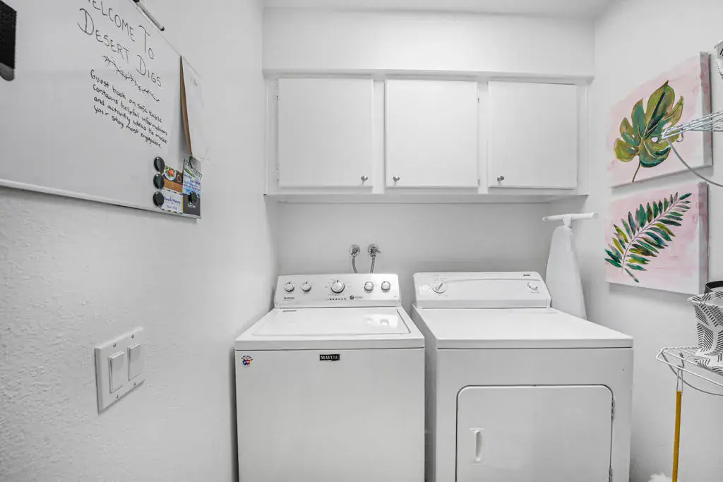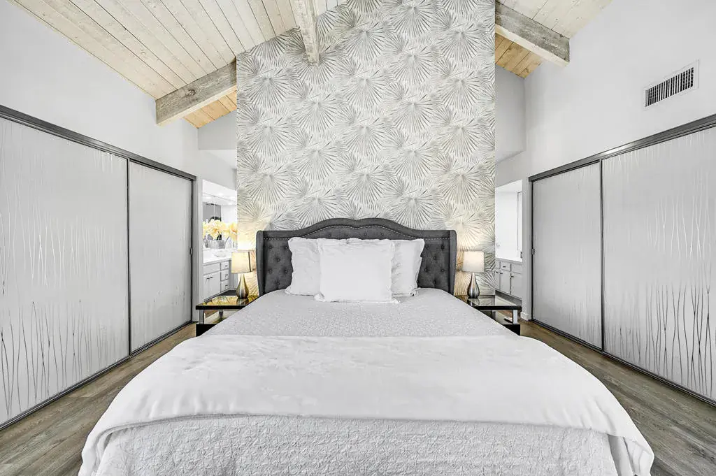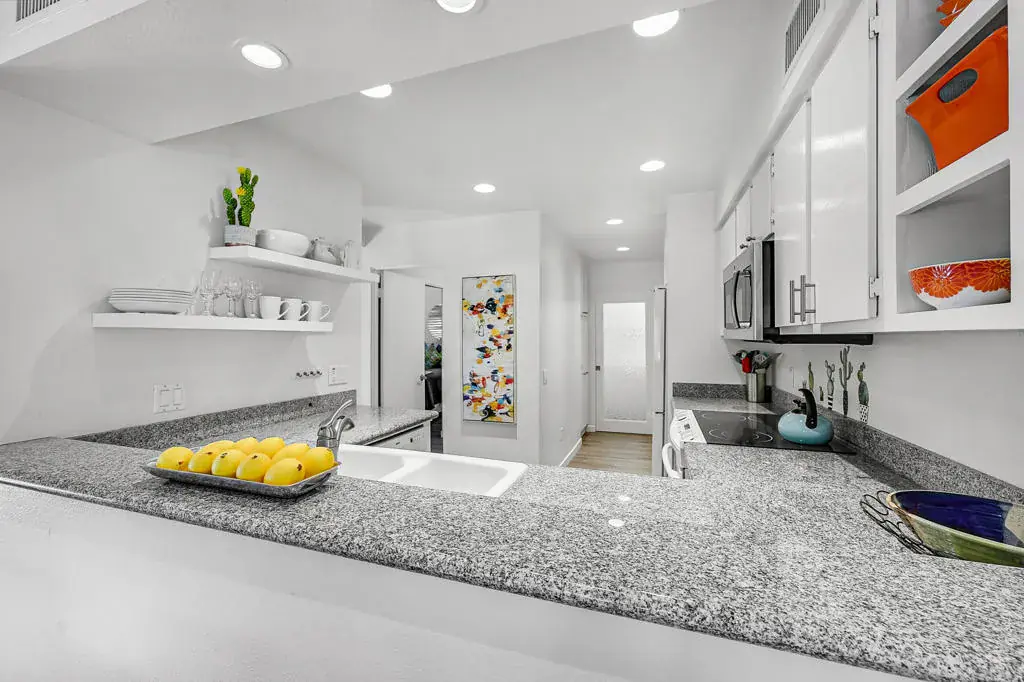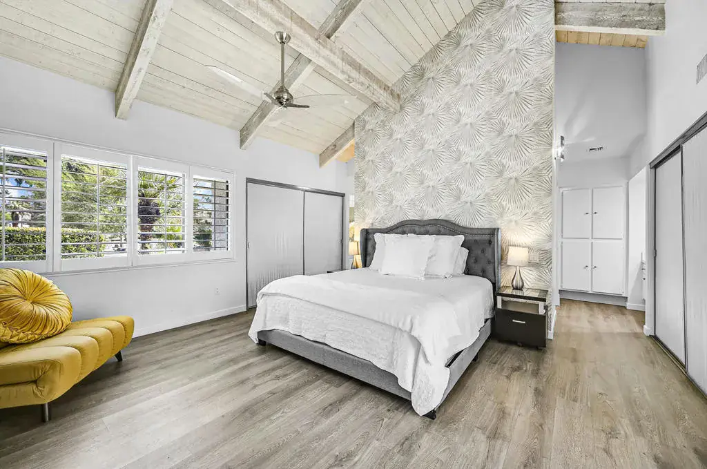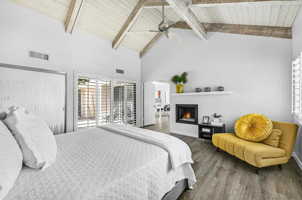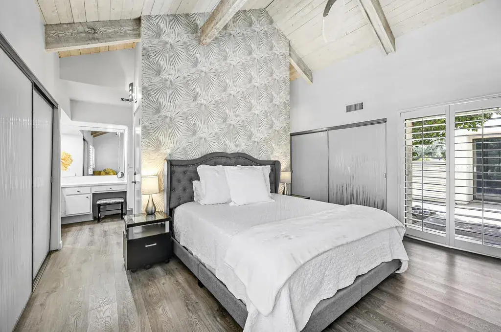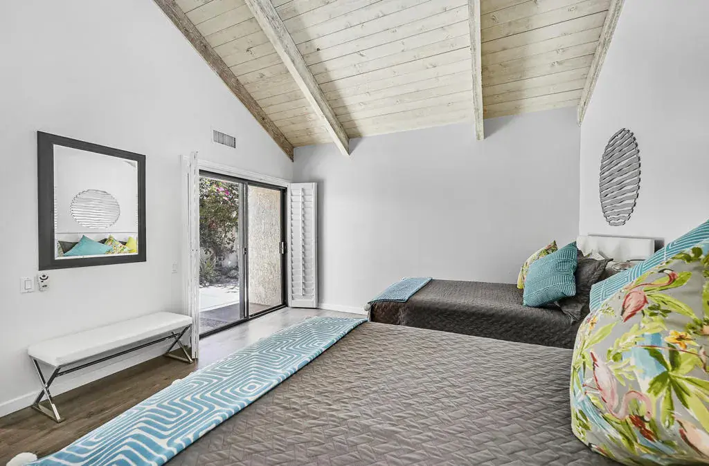 Welcome to a vibrant, turnkey-furnished retreat in the heart of Mission Hills Country Club. This beautifully updated 2-bedroom, 2-bathroom condo offers approximately 1,535 sq. ft. of stylish living designed for comfort, entertaining, and effortless desert living. Soaring wood-beamed vaulted ceilings, two sleek fireplaces, and luxury vinyl plank flooring throughout create a warm yet modern aesthetic. The open-concept living and dining spaces are filled with natural light from expansive sliders that open to a private patio with stunning lake and mountain views–an ideal setting for morning coffee, sunset dinners, or relaxed outdoor lounging. Thoughtful upgrades shine throughout the home, including updated bathrooms with quartz countertops, bold designer wallpaper, solid-surface shower wall panels, and curated decor that blends contemporary sophistication with playful charm. A truly unique detail is the custom pocket door with inset vintage glass, designed to minimize sound from the laundry area while adding character and style. The bright kitchen flows seamlessly into the dining area, and the wet bar makes entertaining effortless. Plantation shutters and vaulted ceilings further enhance the home’s airy, polished feel. The seller is motivated and open to negotiating the land lease renewal–bring your creativity. With a full-price offer, the seller will pay off the renewal fee. For land lease questions, please contact Susan Moua at (760) 883-1665, who manages the MHCC land lease department. Mission Hills Country Club offers a resort-style lifestyle with championship golf, tennis, pickleball, pools, spas, and a vibrant social scene, all set among picturesque citrus trees bearing grapefruit, oranges, and lemons. Ideally located just 15 minutes from Palm Springs International Airport, 45 minutes from Joshua Tree National Park, and two hours from Southern California’s beaches, this home is the perfect desert escape or full-time residence.