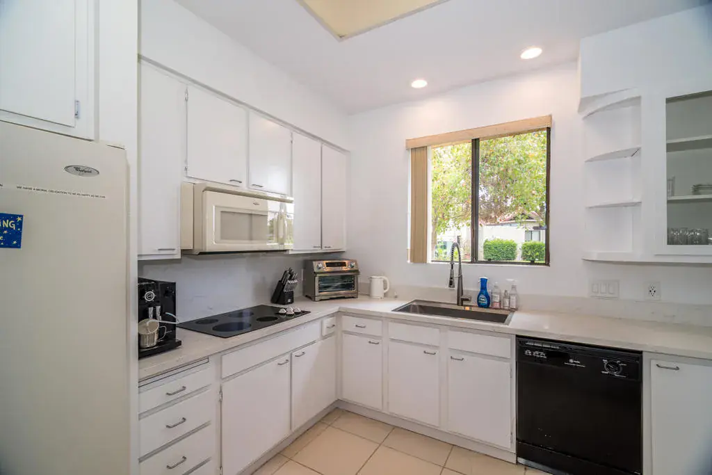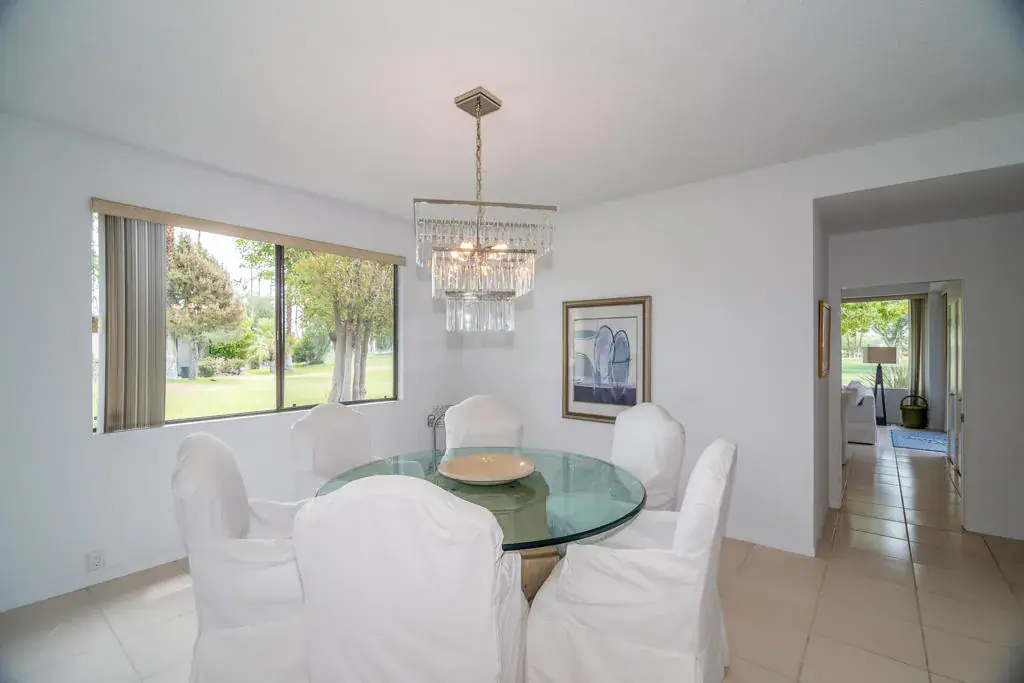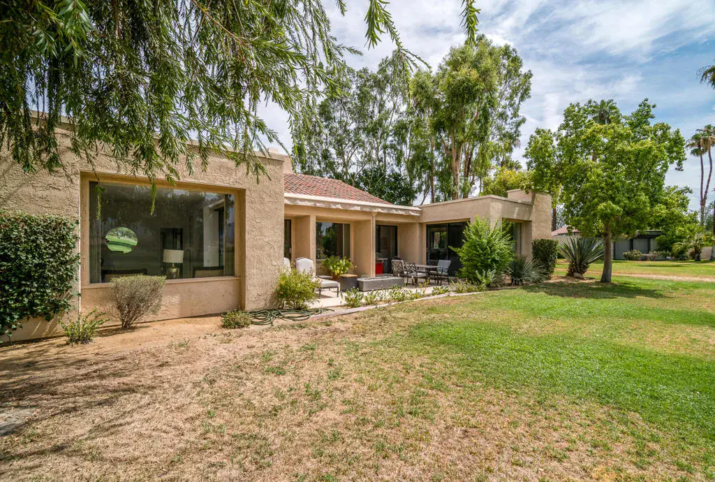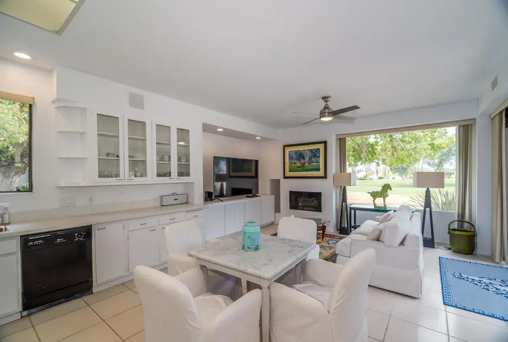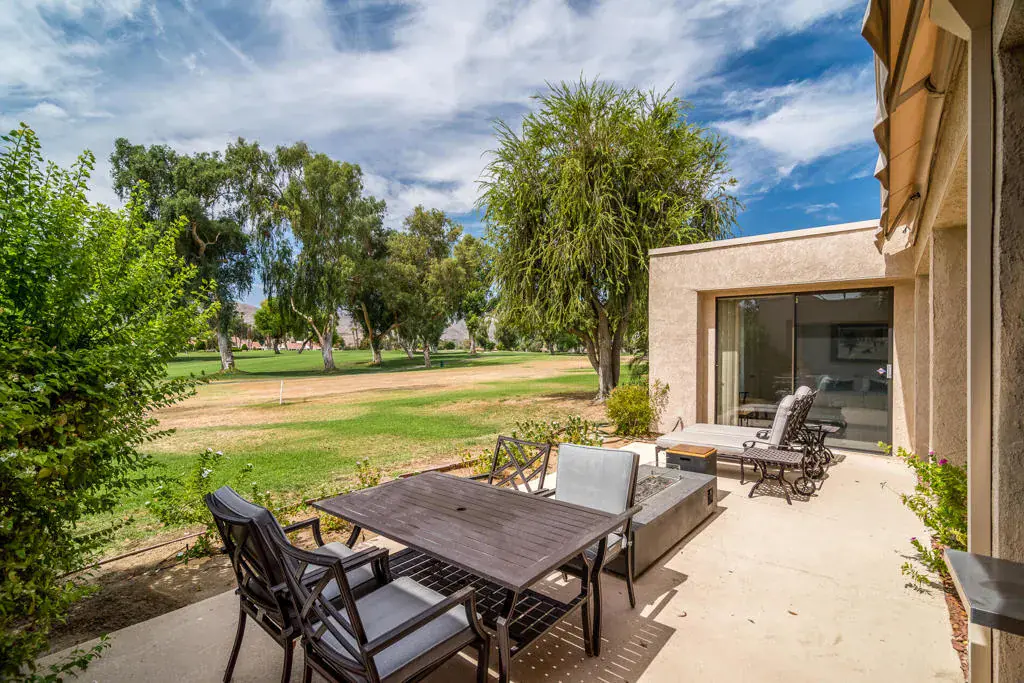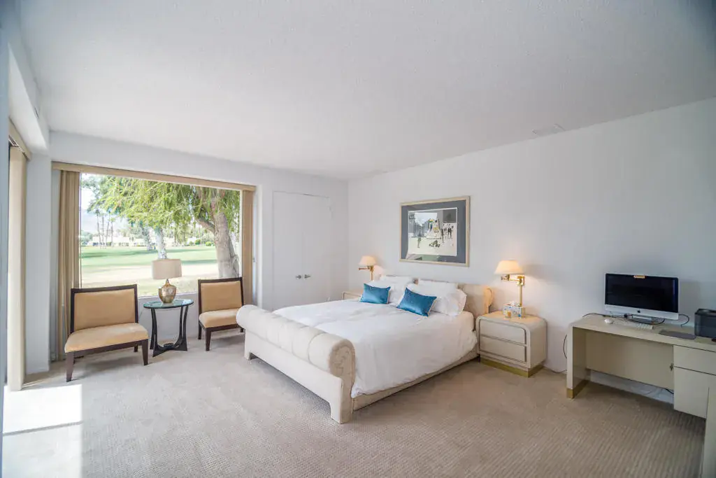 LONG TERM (12 months or more) Or short term available. Beautifully set on the 9th fairway of the Famous Dinah Shore Tournament course. This Unfurnished or furnished, 3 bed/3 bath unit is bright and airy with amazing views of the Southern mountains. Spacious open floor plan with wood plank high ceilings in great room, 2 large fireplaces in great living and family rooms views of the Southern mountains. Spacious bedrooms and baths, patio area and front enclosed courtyard. Large 2 car plus cart garage also includes additional storage space enclosed in separate room.