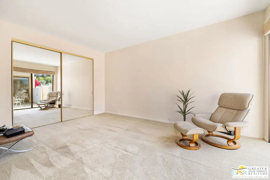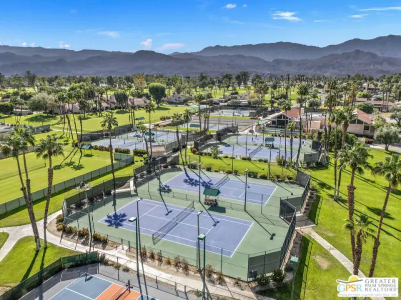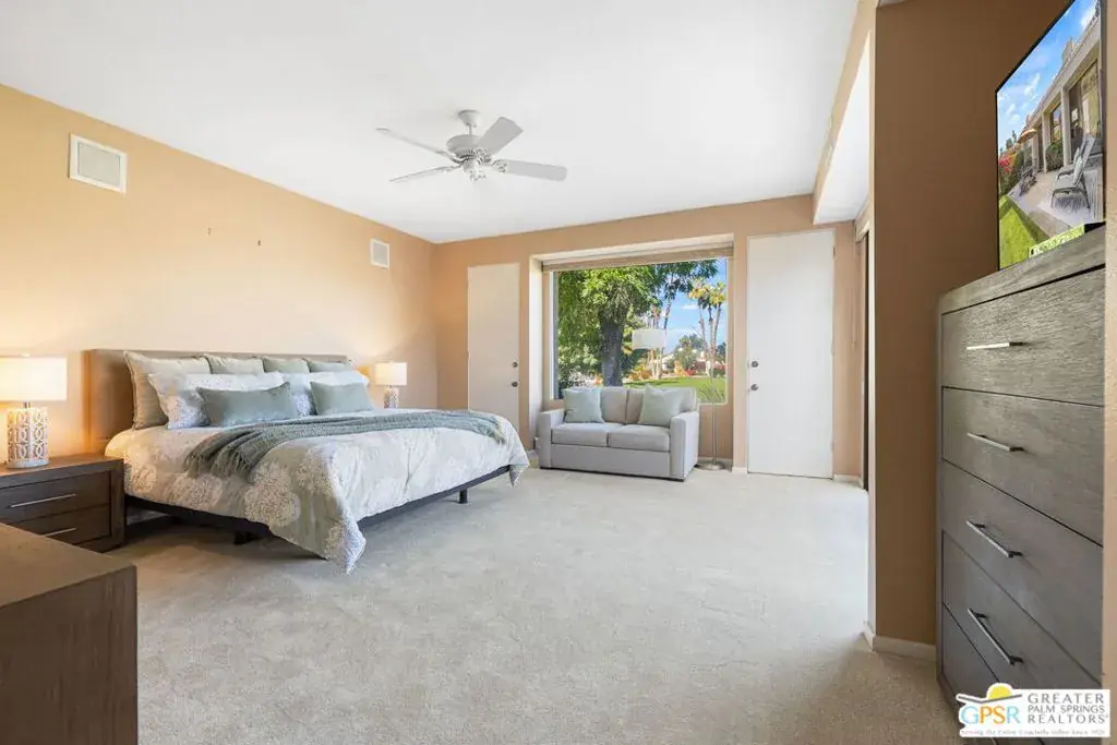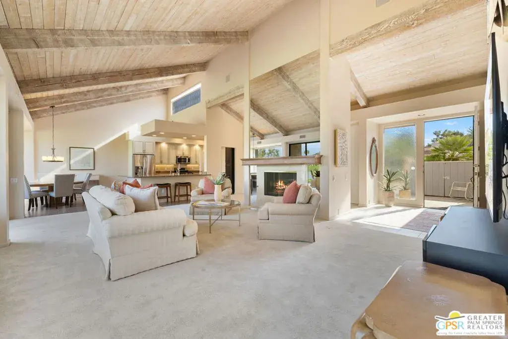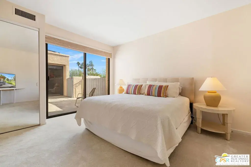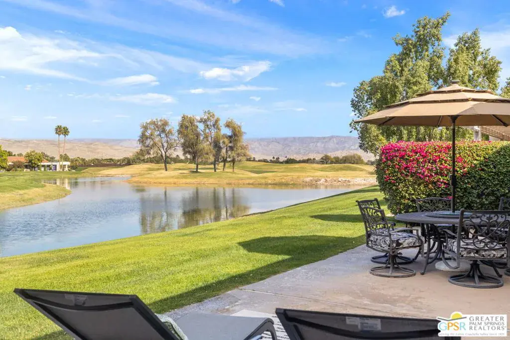 Location truly sets this one apart. Ideally positioned near the clubhouse at Mission Hills Country Club, this single-level, single-story 3 bedroom, 3 bathroom furnished condo captures panoramic lake, fairway, and mountain views across to the Pete Dye Course. Spanning approximately 2,400 square feet, the upgraded residence is thoughtfully designed to embrace its surroundings, with expansive windows and sliding glass doors creating seamless indoor-outdoor living. The main living area is both dramatic and inviting, highlighted by a vaulted wood-beam ceiling, gas fireplace, and open sightlines that frame the scenic backdrop. The open kitchen has been updated and features a clerestory window, counter seating, and an adjacent dining area filled with natural light ideal for everyday living and entertaining. The bedroom layout offers excellent separation and privacy. The Primary Ensuite includes a retreat area, direct patio access, sweeping views, and a private bath with dual vanities, expansive closet space, and both tub and shower. Junior Ensuite Two opens to the courtyard and enjoys its own full bath, while Bedroom Three is privately positioned on the opposite side of the condo with an adjacent bath and courtyard access – perfect for guests or flexible use. Additional highlights include rooftop solar, a two-car garage with attached golf cart storage, and close proximity to the community pool and spa as well as the member clubhouse.