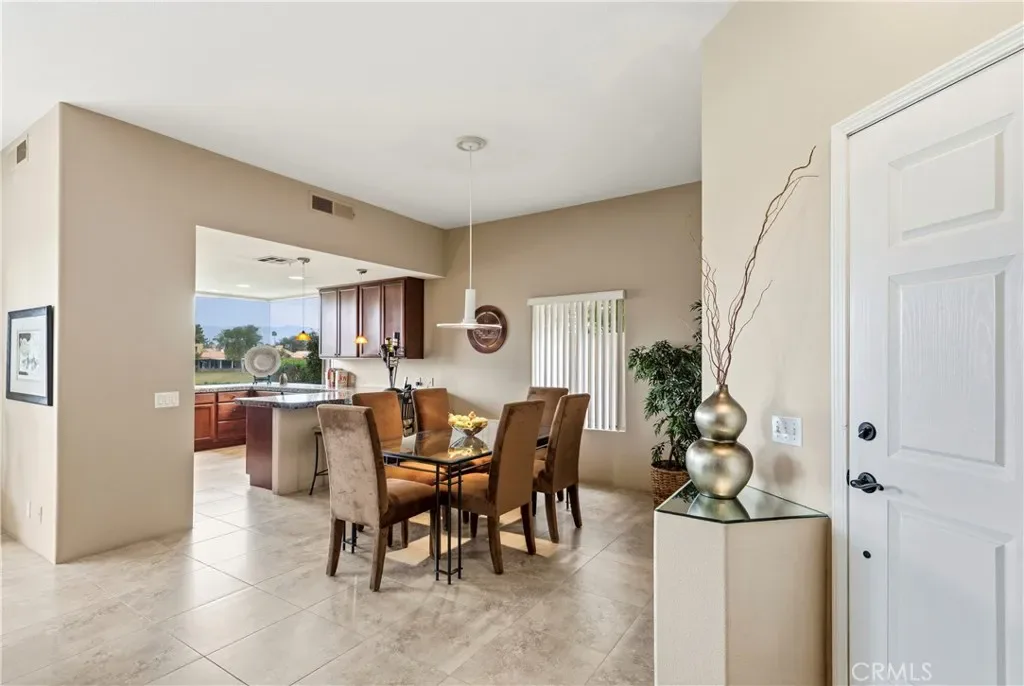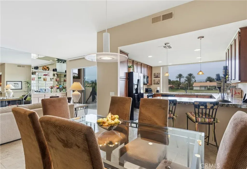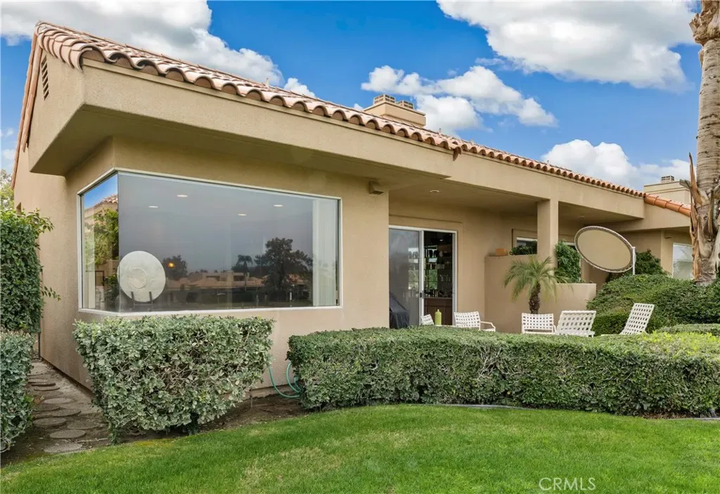 Panoramic Mountain & Golf Course Views situated in the highly sought-after Mission Hills East Country Club Community. This 3-bedroom, 2-bath FURNISHED home is located on an elevated lot overlooking the 7th hole of the Westin Pete Dye Course (fee simple- You own the land) Enter through the private gated courtyard with custom hard and soft landscape. Enjoy unrestricted breathtaking views through the frame-less Kitchen windows – featuring granite countertops, custom cabinetry and an open layout ideal for entertaining. Living room has gas fireplace and has easy access to backyard. Laundry located inside. A two-car garage plus dedicated golf cart garage offers ample storage and convenience.