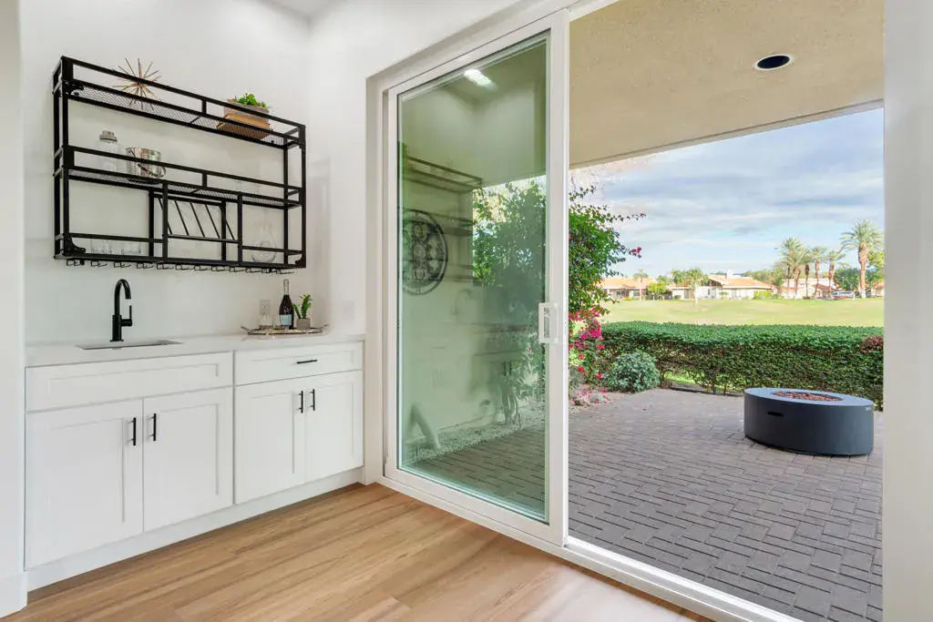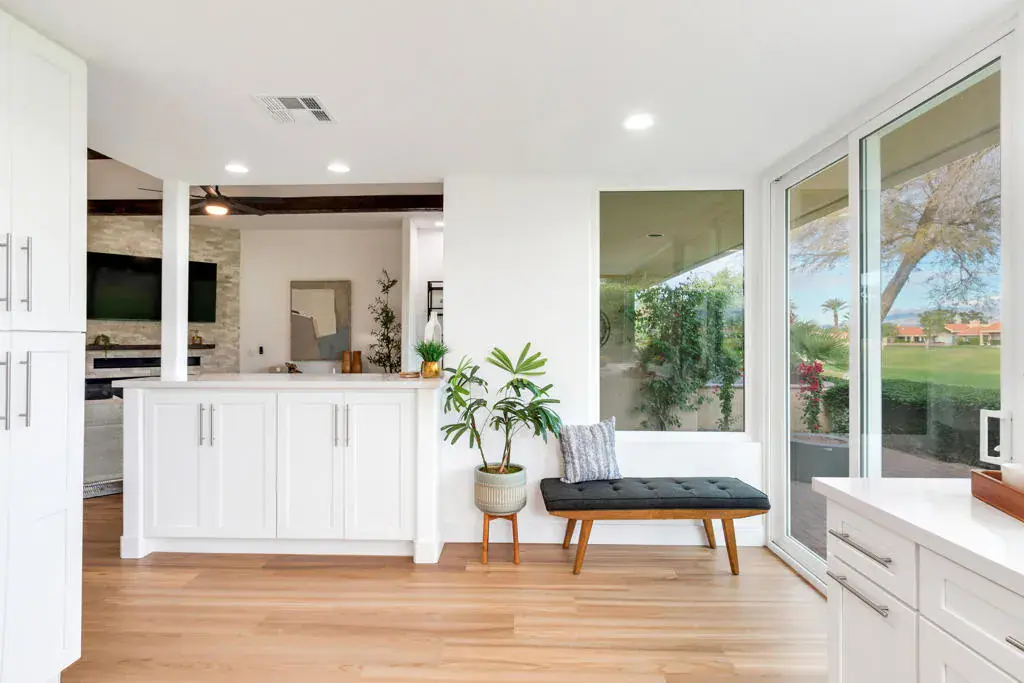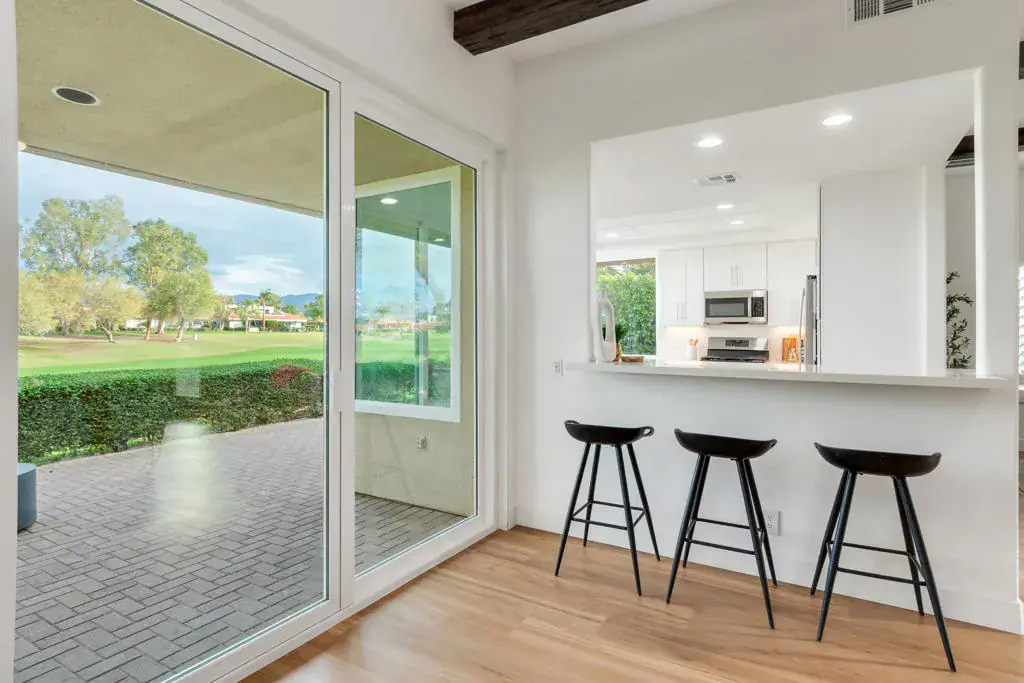 NEW, NEW, NEW with Golf Course View! Come home to the world renown Mission Hills Golf Club community. This 3 bed/3bath, 3 car garage newly remodeled home is gated and guarded and perfect for 2 families, with one Primary Bed/Bath downstairs and additional primary bedroom and bath upstairs. Dual sinks and lighted mirrors in both primary baths. The 3rd Bed/Bath is on main floor. Or, live on main floor with the other primary guestroom and bath upstairs. Situated on the Pete Dye Resort golf course, enjoy watching the golfers and the fabulous mountain view or relax by the firepit under the stars on the cool evenings. Gas BBQ hookup is available as well. New brick patio pavers. This home features a complete remodel with new GE appliances featuring; a gas stove/double oven, refrigerator, washer with gas dryer (electric hookup is available), dishwasher and micro oven. New Shaker style cabinets with soft close hinges, cabinet pantry with pull out drawers. Calcutta gold quartz countertops and back splashes accent to todays modern sleek, uncluttered yet warm atmosphere. The electric remote controlled fireplace in great room as well as the ceiling beams and ceiling fans add to the warmth. All new energy efficient dual glaze Anlin windows and sliding doors throughout with a transferable lifetime warranty have been installed. Included are new frameless view windows in Kitchen. Floors are all new Luxury Vinyl Tile (LVT) throughout with stairs and upstairs bedroom with new high grade carpet. A 70” Samsung TV is also included. HVAC system and water heater are reported to be less than 5 years old by previous owner. HOA amenities includes landscape maintenance, roofing, trash, sewer, cable TV and painting of exterior. Exterior is scheduled to be painted this summer. 4 pools and spas. The Weston Resort is a golf cart ride away. There are several golf options, from public course to memberships offered.