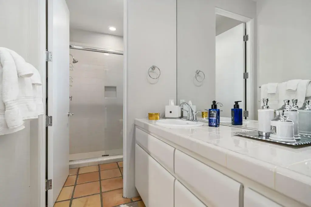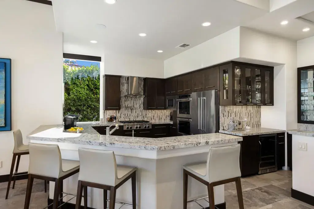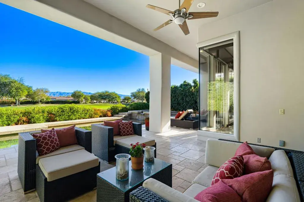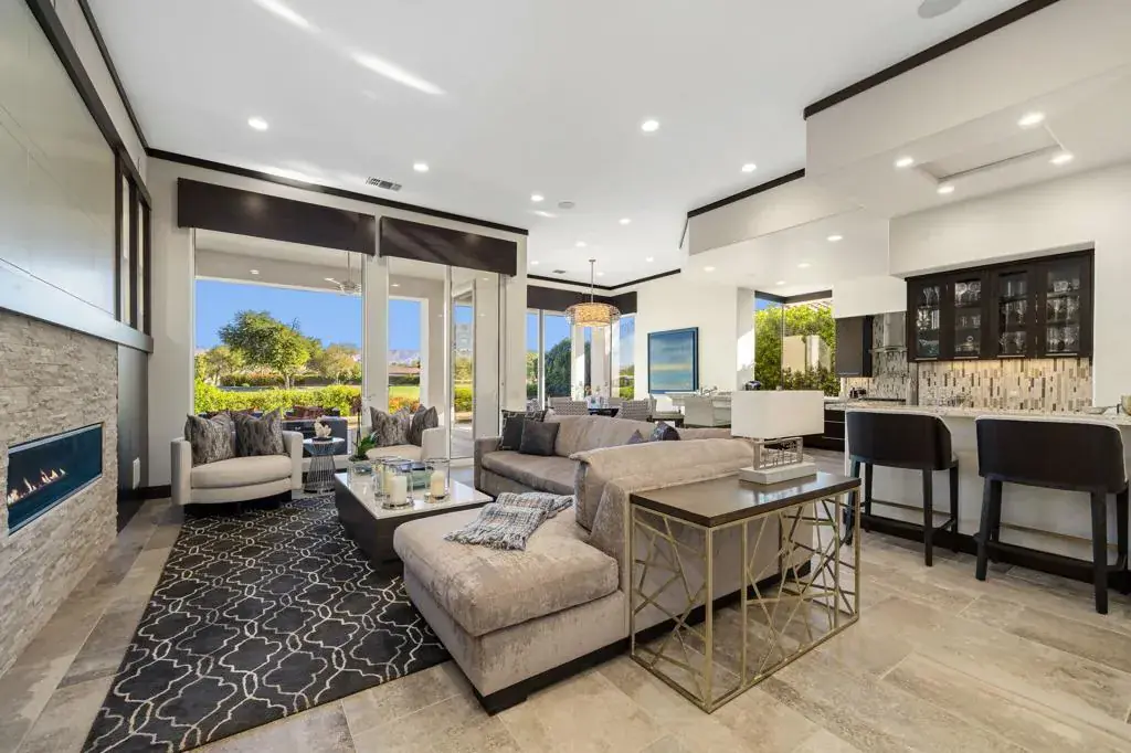 Stunning Contemporary Update of popular Legacy Open Great Room Floorplan with mountain, lake and fairway views and great outdoor living with lap pool. Enter a gated courtyard with outdoor living area and contemporary glass door entry. Open Great Room, Kitchen and Dining complete with entertainer’s wet bar, fireplace and walls of glass with amazing views. Social Kitchen features quartz countertops, stainless appliances, counter seating and Dining area with views. Interiors by noted designer including custom tile flooring. Primary Suite features access to pool and spa terrace and more views together with updated spa bath with quartz and marble finishes. One guest suite in house featuring ensuite bath and a Detached Casita are perfect for friends and family. Den/Office with french doors to the courtyard can be a second guest bedroom in house with custom powder room nearby. Outside is a covered outdoor living room, pool and spa, updated expansive terraces with stone flooring, fire pit, bbq area and views of the mountains, fairways and lake. Legacy HOA includes Mission Hills Country Club social/fitness membership. Furniture Negotiable, so could be ready for a season in the sun – Come home to your desert retreat!
