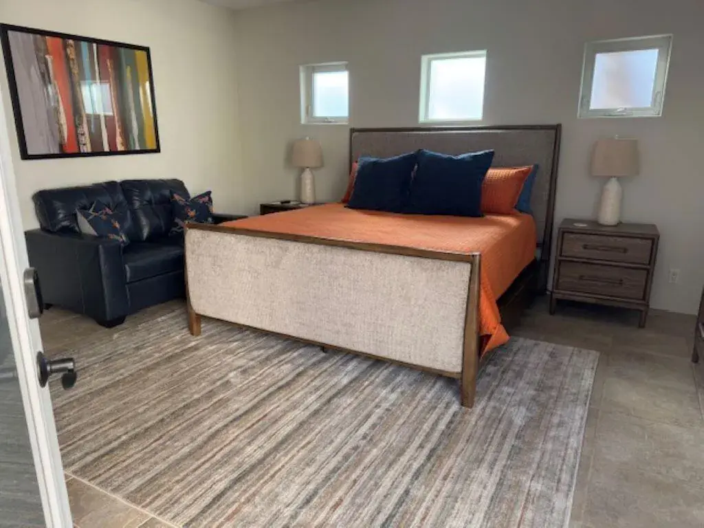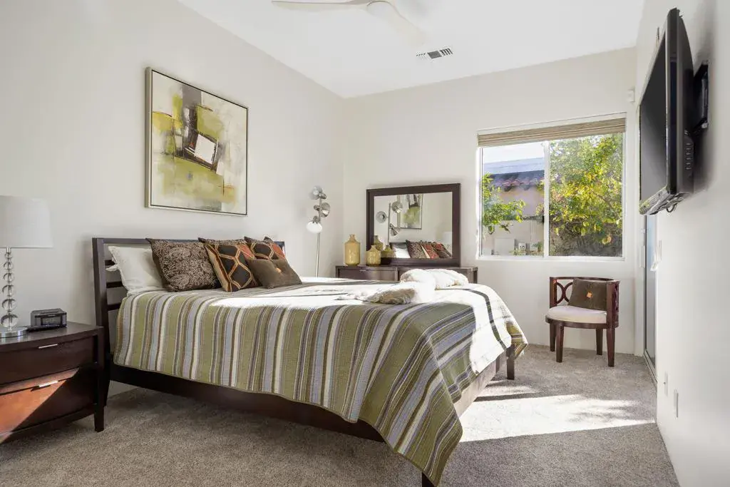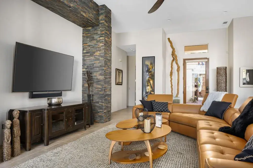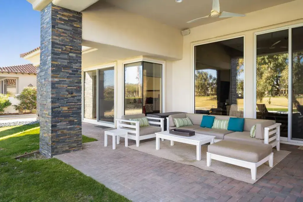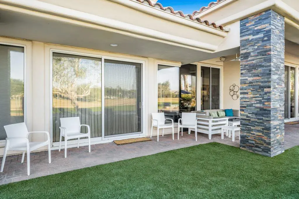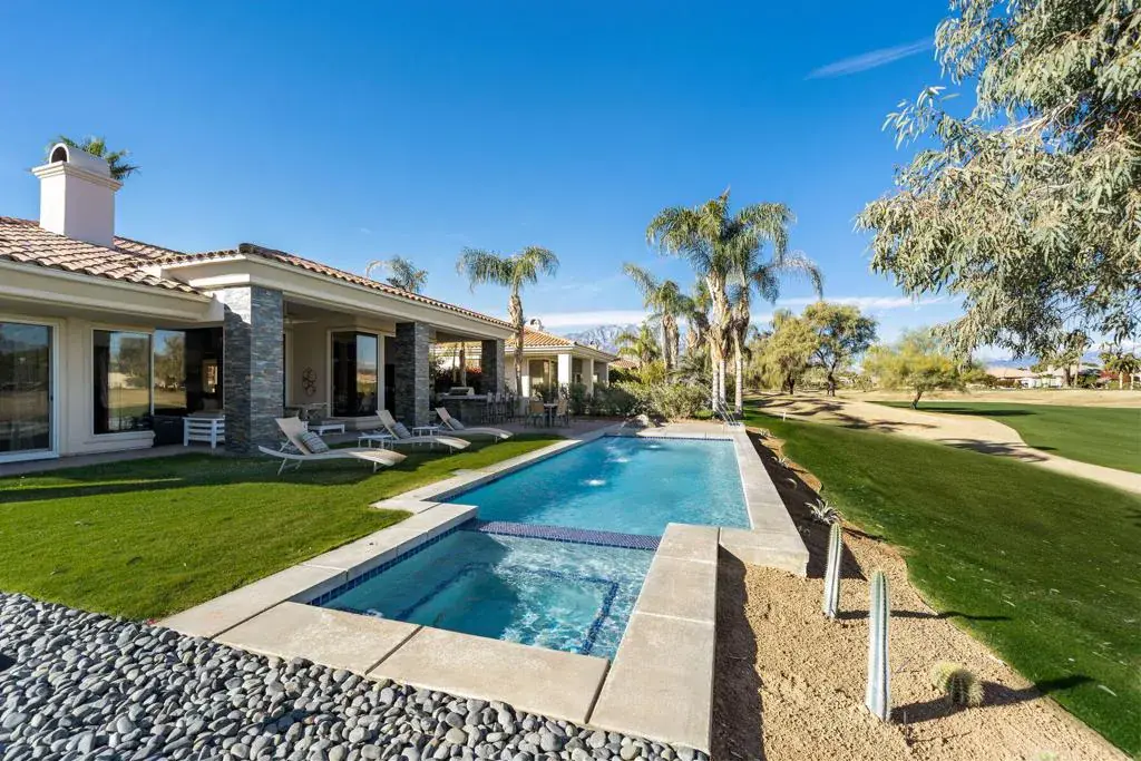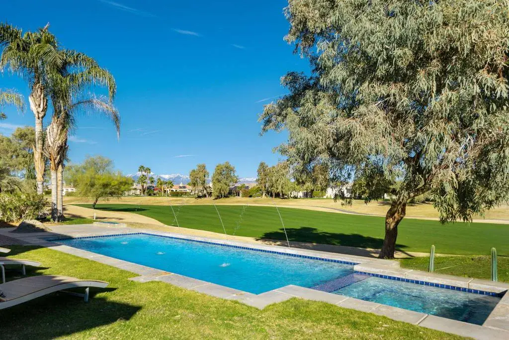 Just became available for February & April 2026. SPECTACULAR LUXURY HOME BEHIND THE GATES OF MISSION HILLS CC-3 BR + Den (can be 4th BR) includes DETACHED huge beautifully appointed CASITA on the Gary Player Course, 17th hole, private pool/spa, Fire Pit, Bocce Ball Court, Outdoor BBQ/entertainment area, Chef’s Kitchen, Wet Bar, Great Room w/custom stack stone around fireplace & walls, contemporary high-end furnishings. All 3 beds are California Kings. Main home has 2 En-Suite bedrooms + Den w/foldout bed & closet & Extra Bath which can act as 4th Bedroom. HUGE detached comfy and elegant CASITA is 3rd BR. Sit in the private front courtyard with a ZEN-like water feature. 2022 Aetrix Golf cart for rent at extra fee (4 seater, lithium ion battery, tops out at 25 mph, Bluetooth sound bar, headlights, blinkers, horn & digital dashboard. Can carry 2 golf bags). Bicycles available at no charge. Dine al fresco & enjoy the serene views or be entertained by golfers as they pass by. Pay to Play golf at Mission Hills North Country Club but is not required. Sorry, no pets. Includes internet, cable, water. SOLAR! . AVAILABLE: February $12500, April $10,000, May $8000, July-Aug $7,000, Sept $8,000, Oct $9,000.Nov $10,000, Dec $10,000,
