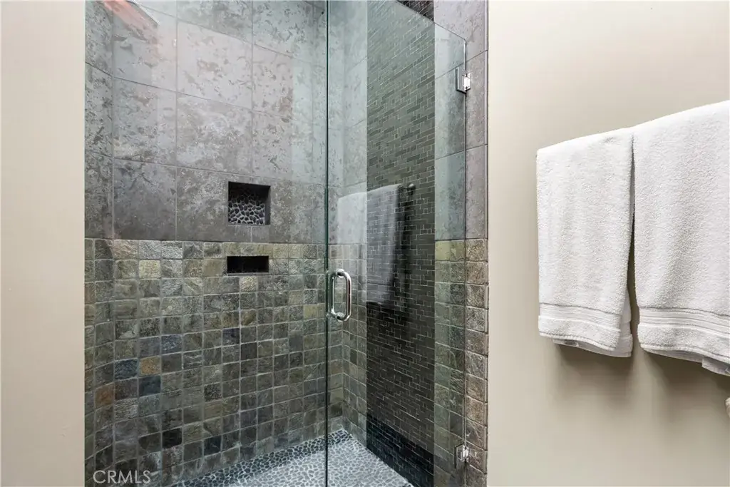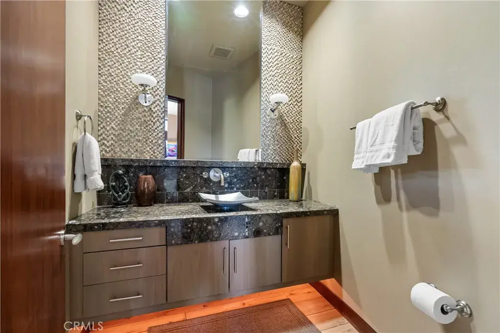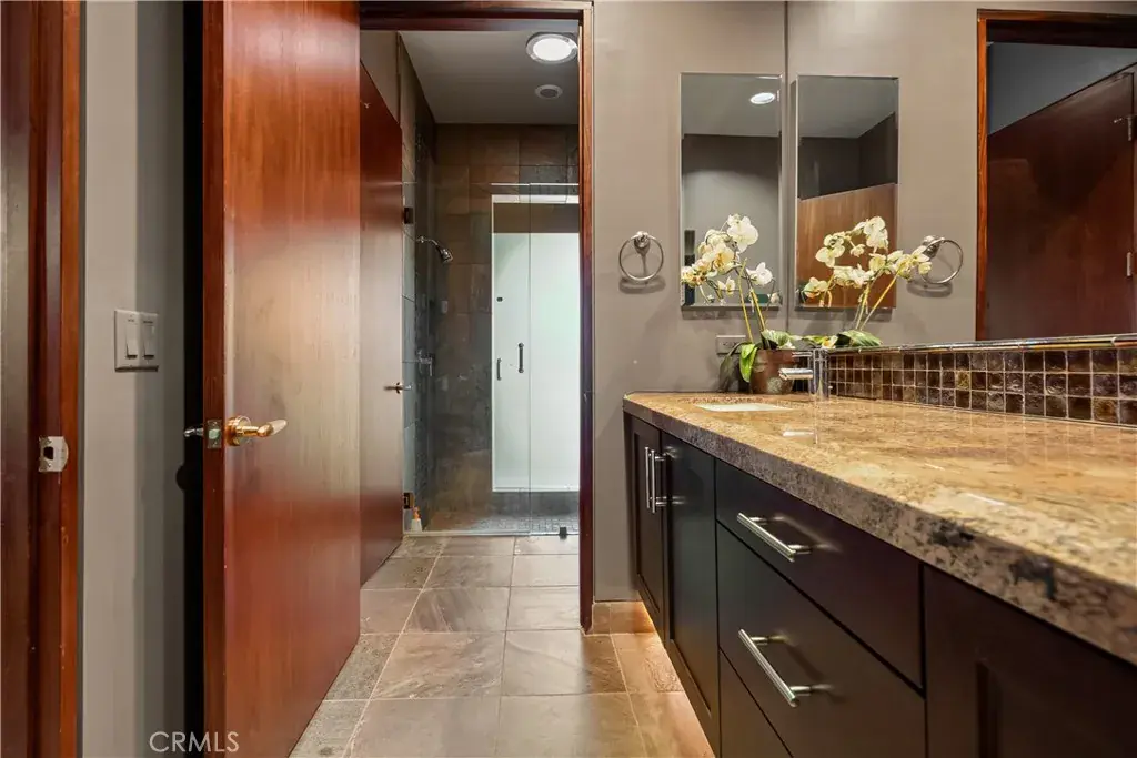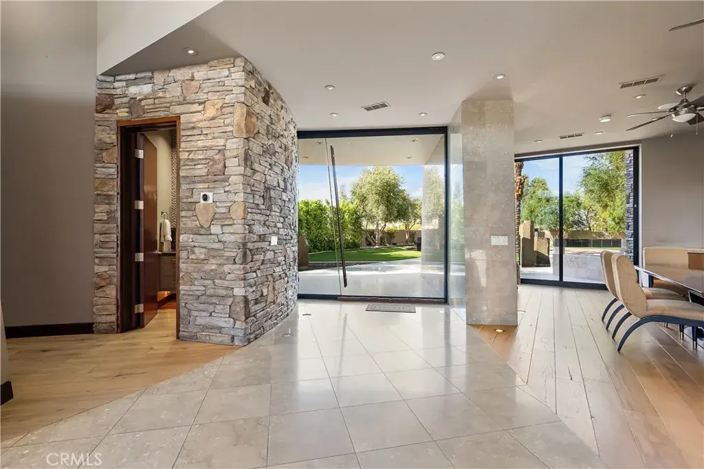 You’ll arrive via the estate’s private, circular motor court, outfitted with tall Basalt column sculptures, cascading water features, and glass bridges from the motor court to the front door. The entryway is reminiscent of a five-star resort — and the five-star experience doesn’t stop there.