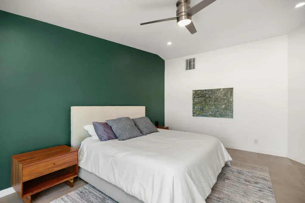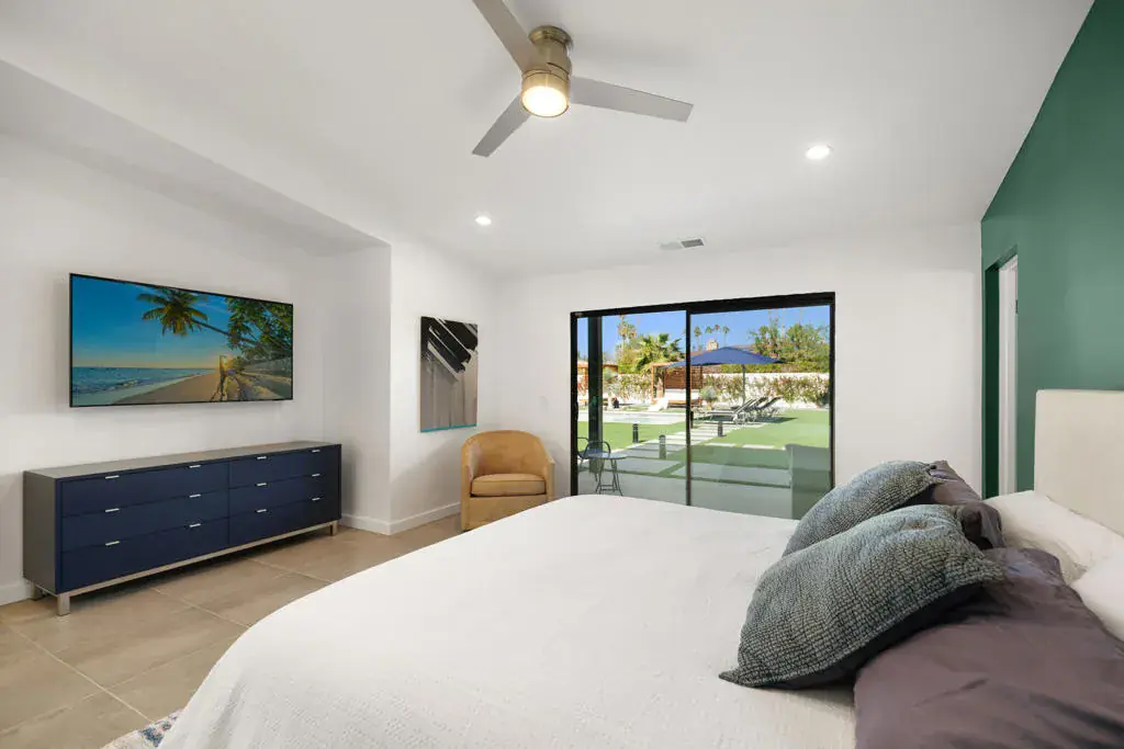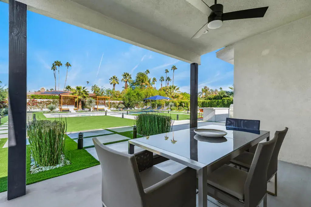 Welcome to a beautiful modern retreat in Rancho Mirage, where luxury and timeless design meet. This 4-bedroom, 3-bathroom home, set on a private .42-acre lot, captures the essence of resort-like living with sweeping mountain views and sophisticated indoor-outdoor spaces. The light-filled Great Room greets you with floor-to-ceiling windows, vaulted wood plank ceilings, and contemporary light fixtures. Concrete-look porcelain tile flooring and a sleek electric fireplace add a touch of refined elegance. The gourmet kitchen features Viking appliances, a wine fridge, waterfall quartz countertops, and a spacious breakfast bar. The primary suite is a true sanctuary with custom finishes, a walk-in shower, dual sinks, and a well-organized closet. An additional suite with a private entrance and kitchenette offers a versatile casita option. A leased solar system ensures energy efficiency. Outside, this home is an entertainer’s dream. Privacy walls surround the backyard’s custom pool, spa, tanning shelf, two luxury cabanas, a fire pit, a bocce ball court, and BBQ. Landscape lighting enhances the space, creating a stunning desert oasis. Situated in the heart of Rancho Mirage, this property is minutes from Palm Springs, Palm Desert, and the famed El Paseo shopping district, with easy access to golf courses, hiking, and top dining. This home offers a blend of privacy, elegance, and modern desert living in one of the Coachella Valley’s most desirable locations.