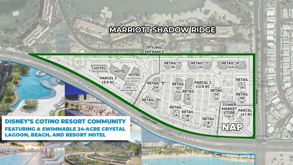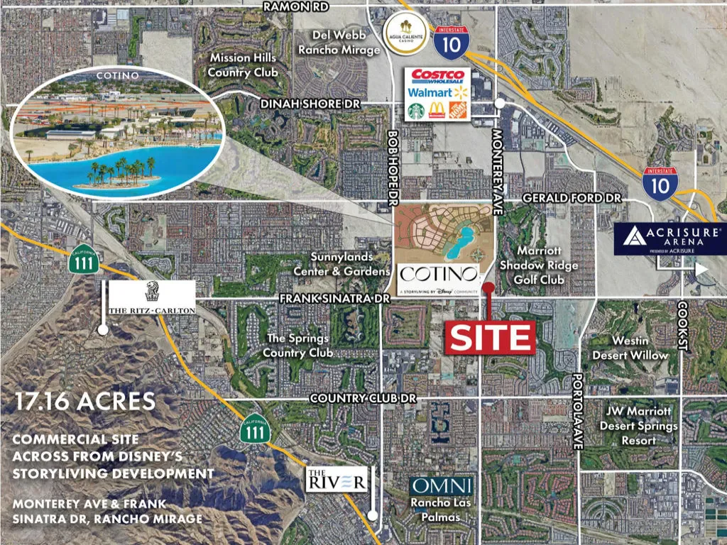 Across from Cotino, a Disney Storyliving luxury mixed use community development with homes, hotel, shopping, dining, entertainment and a 24-acre Crystal Lagoon. Adjacent to Marriott Shadow Ridge Golf Resort with 424 units plus 93 recently approved single family homes. Infill Commercial Development Site in the heart of the Coachella Valley adjacent to Marriott Shadow Ridge Golf Resort. Exposure with nearly 1/2 mile of frontage on Monterey, one of the most traveled thoroughfares in the Coachella Valley. Located near Sunnylands, the renowned Presidential Retreat and Cultural Center, and Mission Hills Country Club, home of the Dinah Shore LPGA Golf Tournament. *Brochures can be downloadable in the ‘Document’ tab.