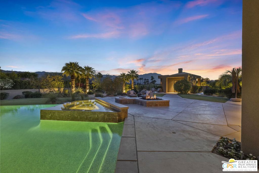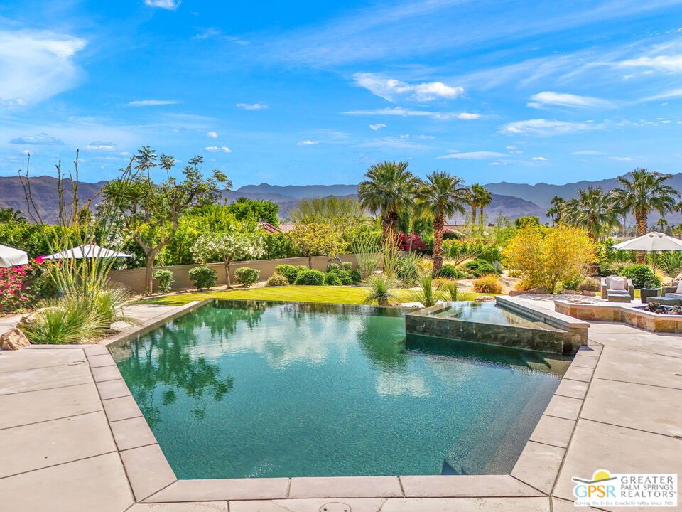 A SHOWCASE of scale, style, and spectacular indoor/outdoor living in Rancho Mirage, this 5-bedroom, 5.5-bath desert contemporary estate with a detached casita sits on 1.12 acres and features tall ceilings, floor-to-ceiling glass, and panoramic mountain views from nearly every room, with multiple outdoor living areas including a south-facing infinity pool and spa, outdoor kitchen and bar, covered patio, and spacious pool terrace designed for effortless entertaining. Art collectors will appreciate the soaring ceilings and gallery-style walls, entertainers will love the seamless indoor/outdoor flow, car enthusiasts will enjoy the gated motor court and three-car garage, and everyone benefits from the 63-panel solar system offering impressive energy efficiency. A formal entry framed by elegant fountains sets the tone and leads to a dramatic living room with a striking fireplace, destination-style wet bar, and folding glass walls that open completely to the outdoors. Adjacent dining room, with its oversized wine refrigerator, sits beside the chef’s kitchen featuring a sous-chef sink, dual refrigerators and dishwashers, two convection ovens, a warming drawer, counter seating, and a casual dining area that opens to a large great room with panoramic views and sliding glass doors creating a true indoor/outdoor experience. The Primary Ensuite offers high ceilings, mountain views, direct pool terrace access, dual walk-in closets, and an oversized spa-like bath with split vanities, soaking tub, and walk-in shower, plus an adjoining executive office with custom built-ins, fireplace, and outdoor access. Junior Ensuite Two sits off the main hall with generous bath and walk-in closet, Junior Ensuites Three and Four are privately positioned in their own wing, and the detached casita (Junior Ensuite Five) enjoys grounds views along with two entrances, private patio, kitchen, spa-style bath, and walk-in closet.