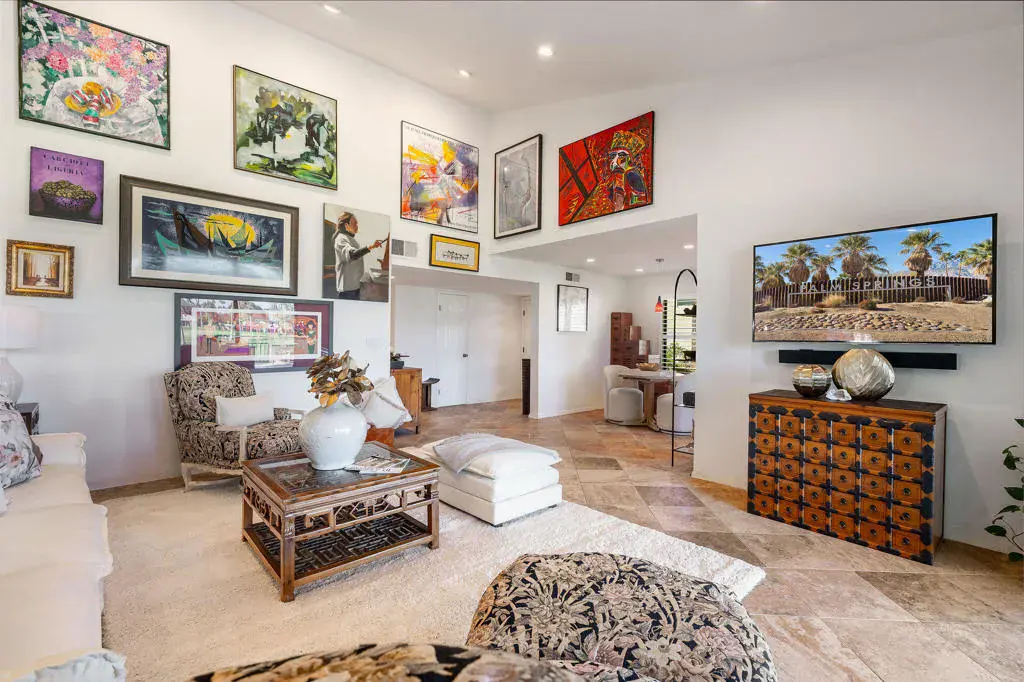 Exceptional opportunity in Rancho Las Palmas Country Club. This east-facing end-unit condominium is ideally located near the Bob Hope Gatehouse and offers expansive, unobstructed views across a double fairway with lake and mountain ‘views.The home has undergone a comprehensive, high-quality remodel completed by licensed professionals using premium materials. Popcorn ceilings have been removed, interior pocket doors added, and the front and patio doors replaced, including a patio door with an integrated privacy blind and a separately installed Phantom screen. Milgard dual-paned, energy-efficient bronze anodized aluminum windows and sliders were installed in 2020.Interior finishes include stone and porcelain flooring in main living areas, with waterproof, cork-backed vinyl flooring in bedrooms and the primary bath. Custom basswood shutters accent select windows. Recessed LED lighting with dimmers is featured throughout.The kitchen is thoughtfully designed with quartz countertops, glass tile backsplash, custom wood cabinetry with pull-outs, pantry and carousel storage, under-cabinet LED lighting, and GFI-protected outlets. Built-in stainless appliances include a wall oven/convection oven, microwave/steamer, dishwasher, induction cooktop, vent hood, double sink, and instant hot water with filtration.Both bathrooms have been extensively upgraded. The primary bath features custom cabinetry, quartz countertops, dual sinks, premium fixtures, porcelain tile walls with niche, safety glass partition, and non-slip pebble flooring. The guest bath includes updated fixtures, porcelain tile shower walls, recessed lighting, enhanced ventilation, and GFI outlets.Additional improvements include a newer two-stage HVAC system, newer water heater, California Closets systems throughout, cedar-lined storage, ceiling fans with remotes, updated laundry room electrical and plumbing, LiftMaster garage opener, and a private tiled patio with gated entry, power outlets, and gas connection.This is a well-executed remodel in one of Rancho Las Palmas’ most desirable locations, offering exceptional value based on orientation, proximity, and long-term view protection.