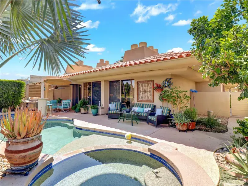 Step outside to your own private backyard oasis with a sparkling pool and spa, framed by palm trees and golf course scenery—perfect for entertaining or relaxing after a round.