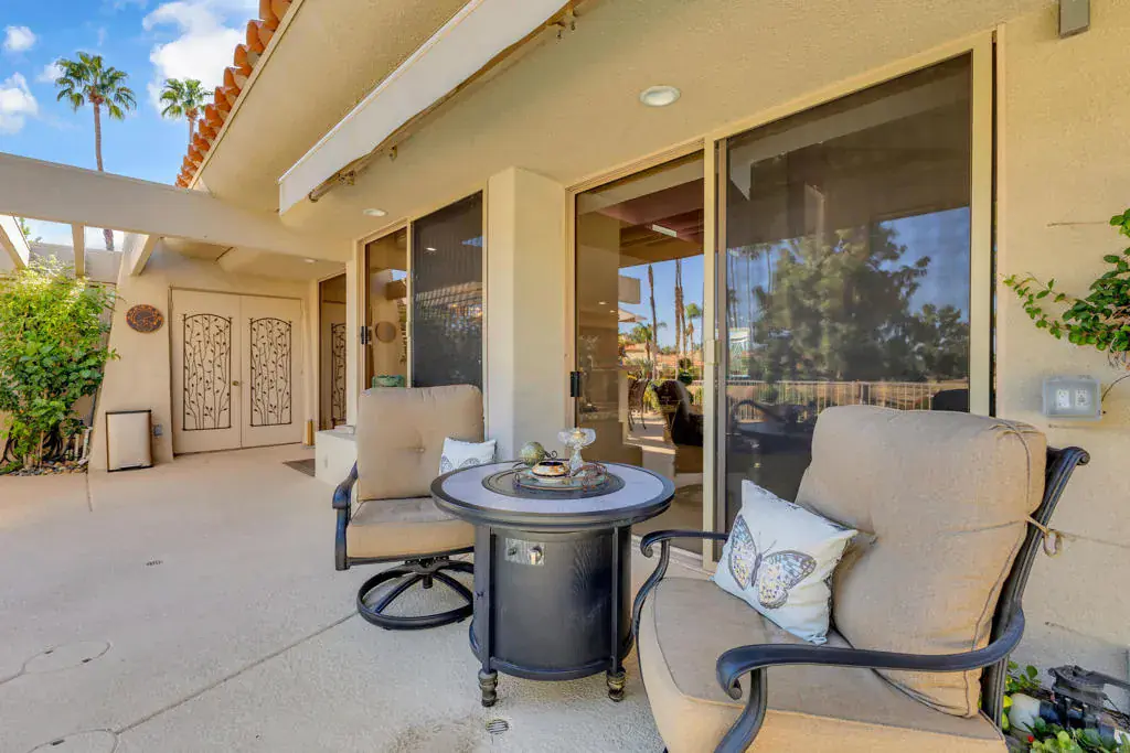 Available season 2026! Rates vary length of stay and dates. This spacious 3-bedroom, 4-bath home showcases high vaulted ceilings, Travertine floors, and updated kitchen and bathrooms. With 3,246 sq. ft., it’s one of the largest floor plans in RMCC and even includes an elevator.The living room offers beautiful views, a fireplace, bar for entertaining, and an inviting dining area. Step outside to a sparkling Pebble Tec pool and spa overlooking a peaceful greenbelt and lake setting.The gourmet kitchen features custom cabinetry, granite countertops, a center island, and a high-end Dacor oven and range. There are two spacious primary suites and a third guest bedroom currently used as a den. One of the primary suites includes a fireplace, private balcony, and an oversized walk-in closet.Conveniently located near Eisenhower Hospital, fine dining, shopping, and entertainment–with Palm Springs and El Paseo just minutes away.