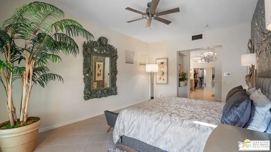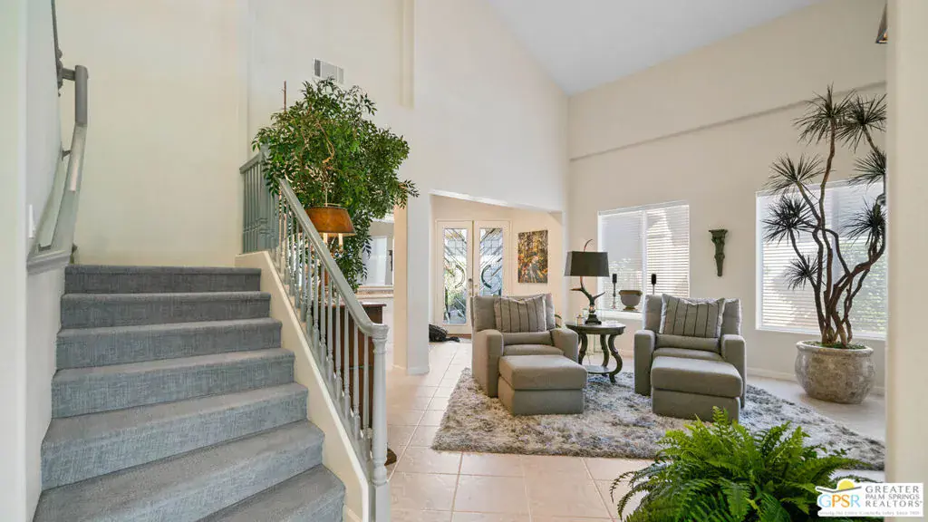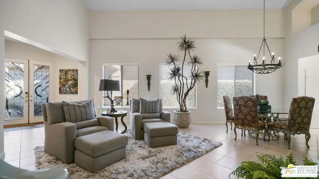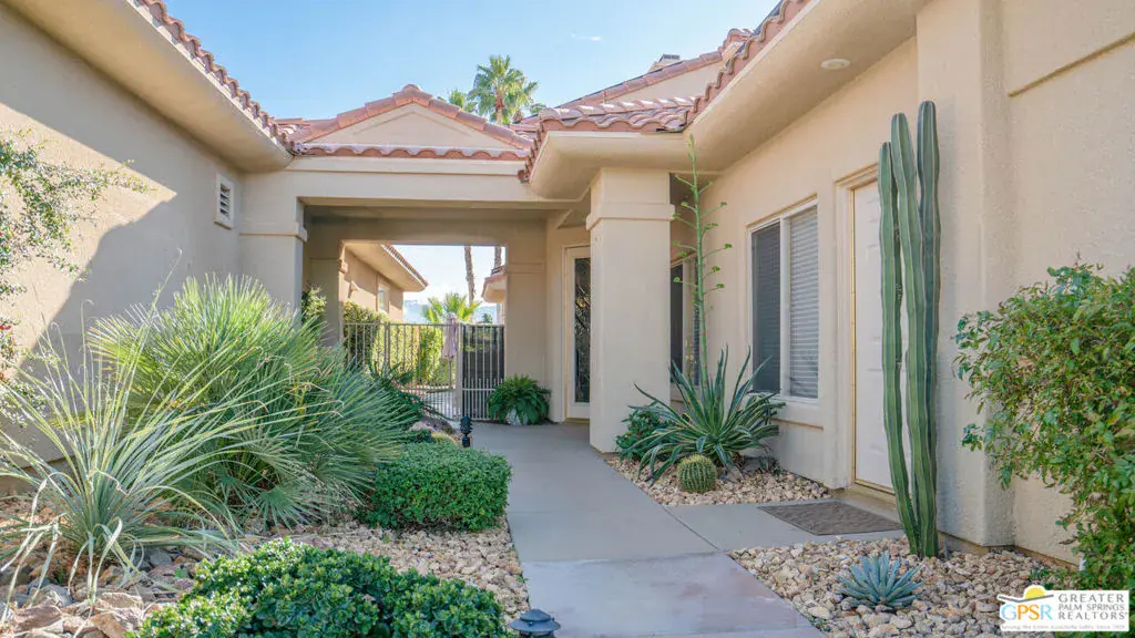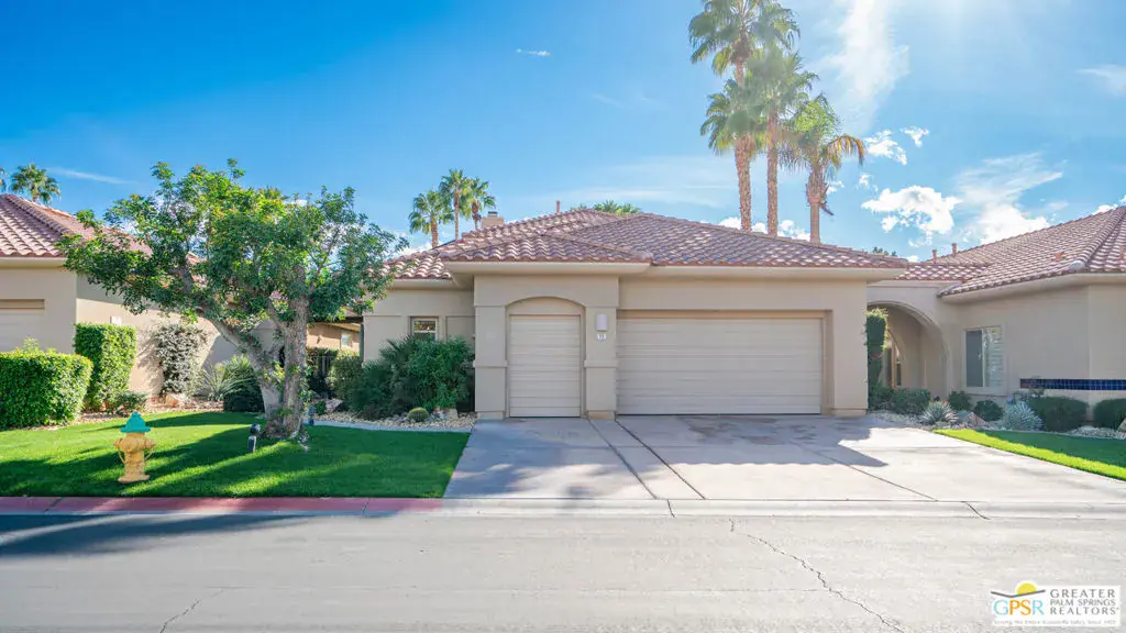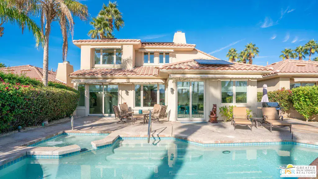 72 Kavenish. Located within Rancho Mirage Country Club, this rare four-bedroom residence offers a balanced combination of space, thoughtful updates, and modern systems within a meticulously maintained gated community. The home has been updated with a focus on efficiency and long-term comfort. A fully owned 47-panel Hyundai solar array, producing approximately 14.1 kW, supports lower energy costs, while two American Standard HVAC systems provide reliable climate control. Pella windows and doors enhance natural light and overall energy performance. The garage is air-conditioned via a Mitsubishi split system, adding flexibility for temperature-sensitive use, storage, or workspace needs. Interior spaces are clean and functional, featuring updated lighting and fixtures, refreshed railings, vaulted ceilings, and a redesigned fireplace in the main living area. The den includes a surround sound system, and the kitchen cabinetry has been professionally resurfaced, offering a refreshed, modern look. The home is hardwired for a security system, allowing owner-selected monitoring. Outdoor features include a newly resurfaced pool supported by a Pentair high-efficiency smart pool pump, designed for dependable, low-maintenance operation. Power-operated retractable awnings provide added sun control and usability of the outdoor living areas. Additional improvements include a point-of-use reverse osmosis system, full-house water conditioning, a LiftMaster garage system, a renovated downstairs bathroom, and new carpeting on the staircase. Located within an established country club community, the property offers controlled access, maintained grounds, and proximity to golf and club amenities, supported by a $950 monthly HOA. This home presents a well-rounded opportunity for buyers seeking a four-bedroom residence with modern systems and thoughtful upgrades in a private, resort-style setting. Easy to show.