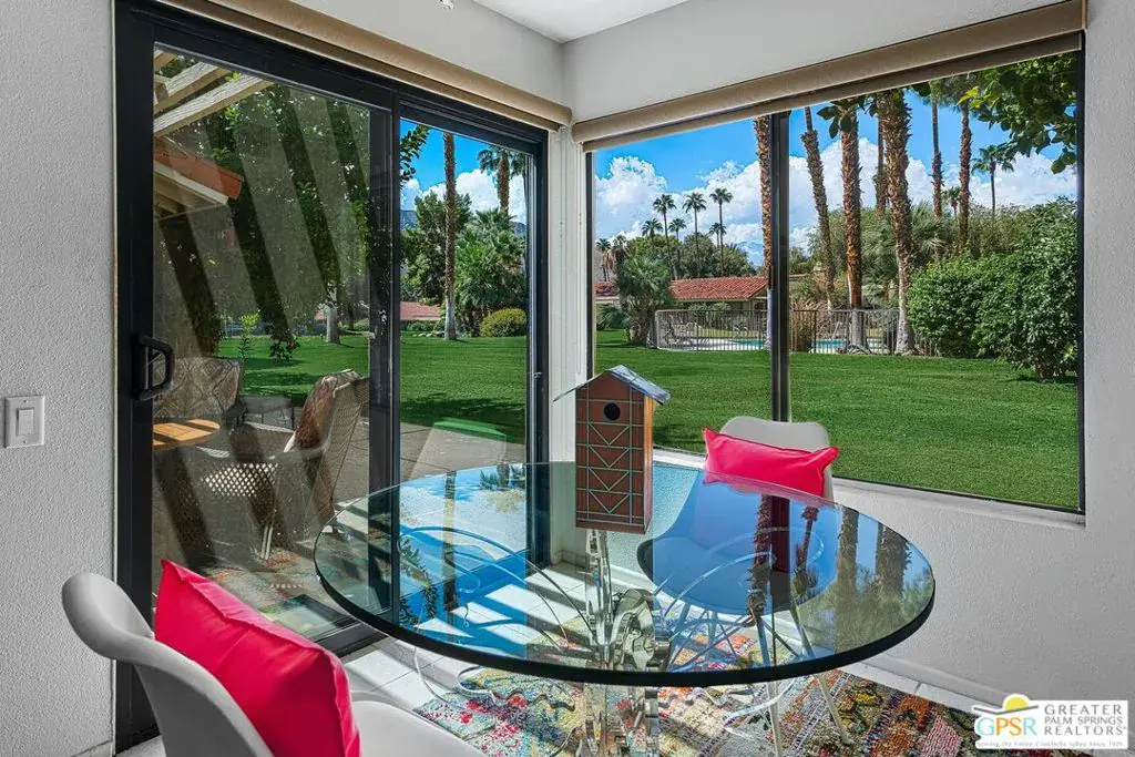 Located in the gated community of Rancho Mirage Racquet Club, this single-level home welcomes you with bright, open living spaces designed for both everyday comfort and entertaining. Vaulted ceilings, abundant natural light, and a fireplace create a sense of volume and warmth in the main living areas, while a wet bar off the kitchen makes gatherings effortless. The breakfast nook captures views across the community greenbelt, pool, and mountains, bringing the outdoors into daily life. Two primary suites offer privacy and convenience, each with its own ensuite bath. A third bedroom provides flexibility for guests or a home office, with an adjacent hall bath that also serves as a powder room. Outdoor living is equally inviting, with multiple patios that extend the interiors outside. A private walled courtyard offers an intimate retreat, while the south-facing patio is shaded by a pergola and framed by mature fruit trees, creating a lush and fragrant backdrop for dining or relaxation. Residents of Rancho Mirage Racquet Club enjoy five pools, five spas, tennis and pickleball courts, a fitness center, racquetball court, and a clubhouse with kitchen and bar. Landscaped grounds, lakes and walking paths complete the setting. Only minutes from Rancho Mirage dining, shopping, and recreation.