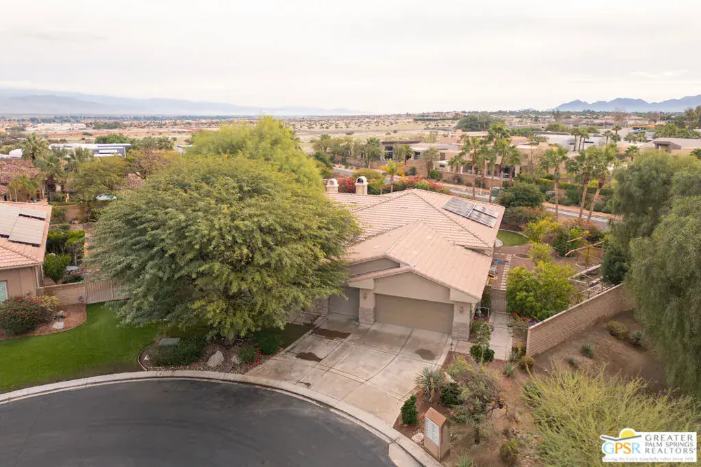 Welcome to your private escape within this contemporary Mediterranean oasis. One of just ten homes in a gated community, this professionally designed residence offers three bedrooms plus a den/office, three bathrooms, and sits on an expansive lot of over 16,000 square feet at the end of the cul-de-sac.From the moment you arrive, you are welcomed through a gated front courtyard adorned with lush landscaping and a tranquil bubbling fountain. Inside, the foyer showcases soaring ceilings and generous wall spaceideal for displaying art and treasured collections. The open living areas are both gracious and well defined, featuring a breakfast nook with bay windows, a formal dining area, and a comfortable living room anchored by a fireplace.The open kitchen is perfectly suited for both everyday living and entertaining, offering guest seating and a spacious pantry. French doors off the south-facing living area open wide to invite natural light and breezes, leading to a private lanai and BBQ, surrounded by verdant backyard complete with a custom salt water pebble tech pool and slate rock waterfall spa.The oversized lot provides ample room for a future ADU and includes a generous garden area with mature fruit treesincluding Lemon, Mexican Lime, Pomegranate, and Fig. Ideal for those with a green thumb. Back inside, the primary bedroom is a true retreat, featuring French doors that open to a seating area and a spa-inspired bath, large walk-in closet, and a fireplace. With direct access to the backyard, the suite offers seamless enjoyment of the outdoor spa on relaxing evenings.Just across the hall one will find a flexible room (listed on records as the fourth bedroom) that opens to the front courtyard and serves beautifully as an office, media room, or creative space.Continuing down the hall, you’ll find a convenient powder room with nearby linen storage, along with two additional bedrooms that share a full bathroom. Additional amenities include a three-car garage, a spacious laundry room with extra storage, paid-for solar panels (installed but not connected), and a dual-zone HVAC system.This sophisticated home offers remarkable versatility ideal as a full-time residence, weekend retreat, work-from-home haven, or peaceful escape from the bustle just beyond. Conveniently located near Mission Hills Country Club and a short drive to shopping and dining, this quiet, well-maintained community offers a truly special desert lifestyle.