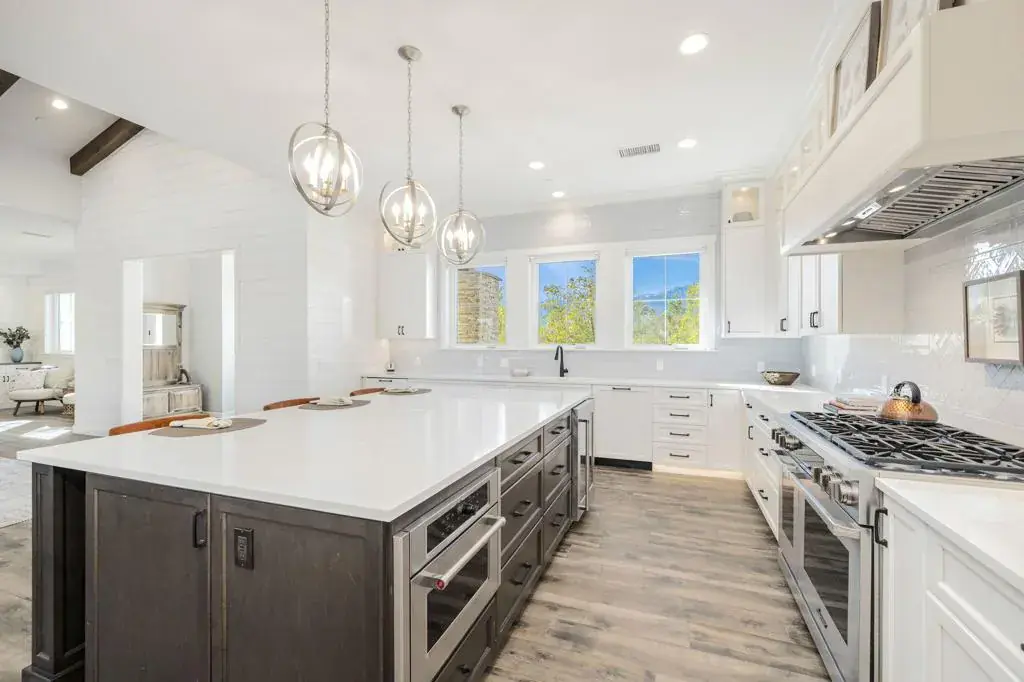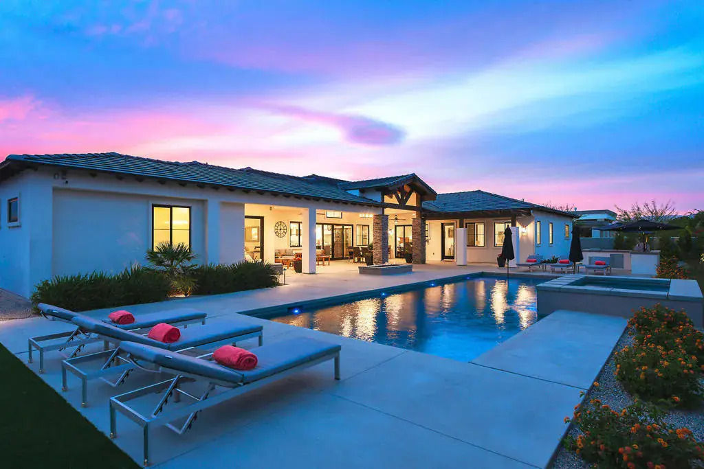 Completed in 2021, this custom estate offers 5 bedrooms and 4.5 baths across two distinct wings: a luxurious primary suite and a private guest wing. Versatile by design, the guest quarters feature a kitchenette and dedicated laundry, functioning as a lock-off 1, 2, or 4-bedroom Casita–ideal for extended stays in Rancho Mirage. Expansive windows flood the home with light, while dark exposed beams and white wood paneling create a sophisticated, high-contrast aesthetic. The chef’s kitchen–boasting oversized appliances and a large walk-in pantry–features customizable lighting to set the perfect mood. Transition seamlessly to a 1,149 sq. ft. covered patio perfect for lounging and entertaining. The spectacular 44-ft. LED-lit pool is the centerpiece, flanked by dual lounge areas, a built-in BBQ bar, fire pit, bocce court, and sweeping south-facing mountain views. From the integrated smart-home technology to the low-maintenance landscaping, this estate is designed for ease. Enjoy the significant utility savings provided by IID all while perfectly situated in a prime location between Palm Desert and Palm Springs.