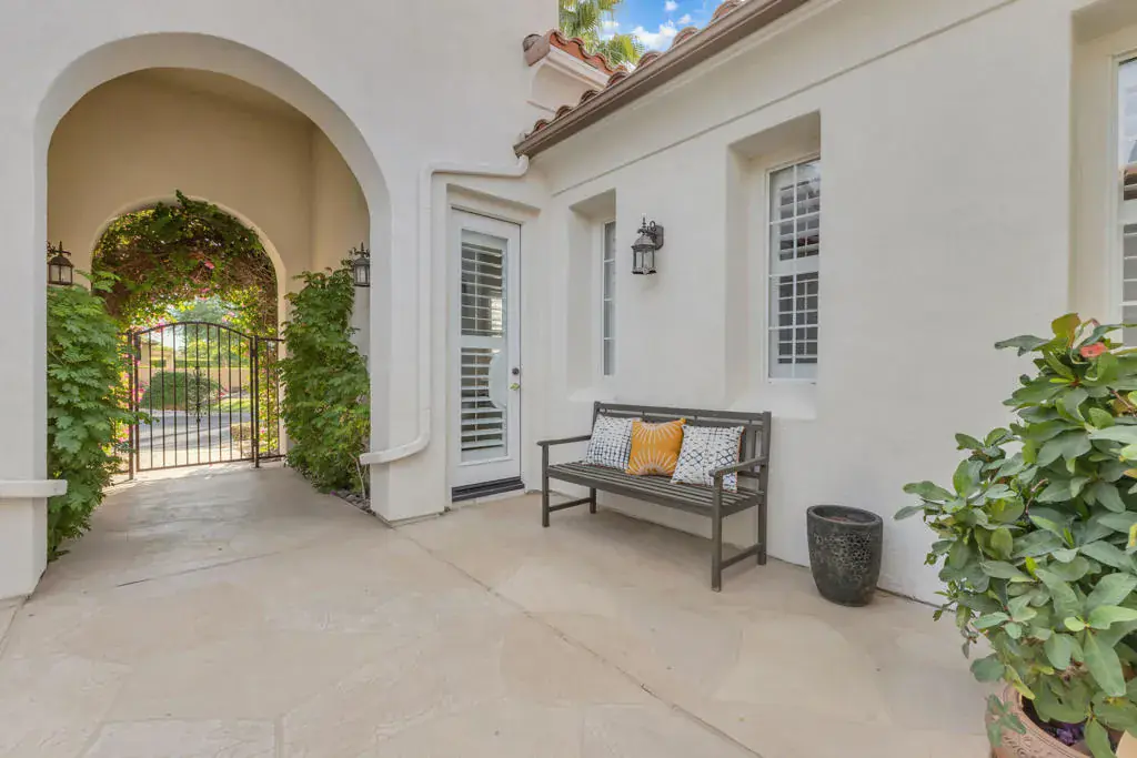 Back on market at reduced price. The spectacular San Jacinto mountain views from both inside and out are the first of the many features in this gorgeous St. Augustine home. By the numbers, this is a 3 BR, office/den, 2.5 BA, 3650 sq ft home with a two car garage, and, a separate single car garage currently being used for storage and a workspace. Done in an early California style architecture, this home is a ”plan 4”, built by Ashbrook. The interior provides a spacious great room with a sparkling kitchen with a large island, a walk-in and a butler’s pantry and multiple dining areas. Porcelain tile, stylish carpetry, ten foot ceilings, and custom lighting are some of the interior flourishes. Outdoors, the grandness continues with a misting system, a salt, pebble style pool and spa, spillway and, a built-in BBQ which is nestled just under the spacious covered patio. The master bedroom suite has a large walk-in closet with built-ins, dual vanities, spa tub & separate shower. Did I mention the owned solar for both the house electric AND to heat the pool, and the newer HVACs (3 yo). This is a bright, yet cozy home, with custom lighting and large mirrors in the baths. There is mature landscaping with palm and citrus trees, and ground cover. Additional features include a front courtyard, double oven, 8 ft doorways, and 10 ft ceilings. The perfect home for entertaining! St Augustine is a gated community with a 7 acre park & tennis courts. Low ($400/month) HOA’s & no land lease.