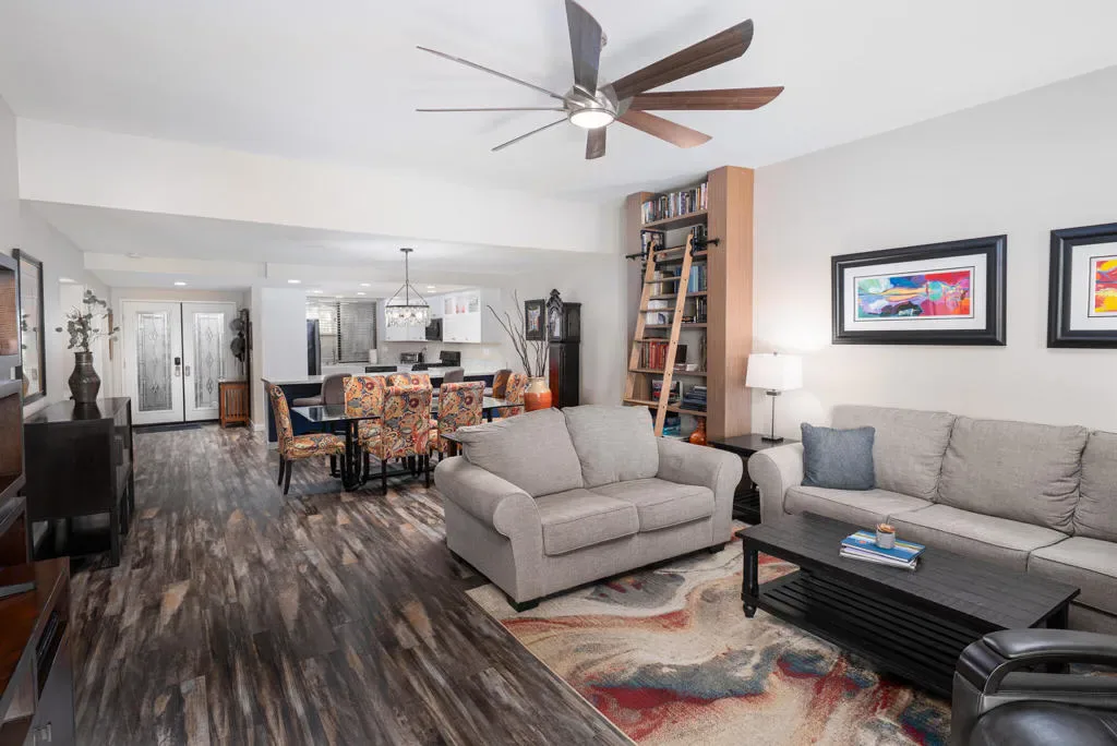New Price, and Motivated Sellers. Take advantage of this fully updated, partially furnished home at an excellent price, enjoying fantastic views of both the 9th fairway and the mountains beyond at Sunrise Country Club. Desirably located within walking distance to the Club House with full restaurant and bar, there are numerous amenities such as golf, tennis, pickle ball, and more.Entering this 2 bd, 2 ba condo you find a fully upgraded kitchen with custom tasteful cabinetry and countertops, ample storage including a pantry and utility closet, and a wide breakfast bar with seating. For the entertainer among you, there is an adjacent bar and beverage cooler with view of the front courtyard and water fountain and a large patio facing the golf course. From here your eye follows the open floor plan, to the spacious dining area for six, a custom built-in library, and onward through the warmly appointed living room through to the patio with view of the golf course. The bedrooms are thoughtfully upgraded, with the primary suite having direct access to the well furnished patio, and the en suite benefits from an enlarged and redone shower, jacuzzi tub, and walk-in closet. The second bedroom is a flex room which can work as an office, and has access directly to the front lanai. Additional upgrades include Aluma wood cover and heat-absorbing tile on the front and back patio, and in the garage, LED lighting, epoxy flooring, insulated ceiling and custom cabinets. Take this opportunity to reside in a beautifully remodeled condo within a truly social country club, and enjoy with friends and neighbors alike 21 swimming pools, championship golf, and much more. Offered partially furnished with exceptions.