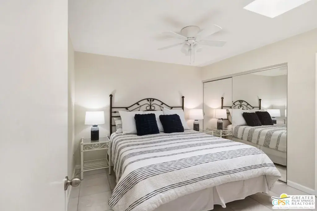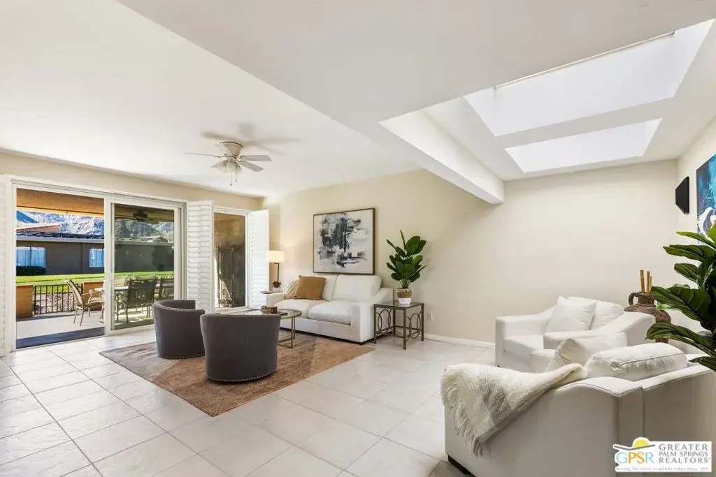 Welcome to effortless desert living in the heart of Sunrise Country Club in Rancho Mirage. This home-like 3-bedroom condo is ideally positioned in a quiet, interior location, facing a lush greenbelt with gorgeous panoramic mountain views, a setting that delivers both privacy and wow-factor. Inside, the residence is filled with natural light and thoughtfully updated throughout. The remodeled kitchen, featuring quartz countertops and mountain views, pairs beautifully with the updated finishes, while the remodeled bathrooms blend style and function. Ceramic tile flooring flows through the main living areas for a clean, cohesive look. Generous room sizes and a smart floorplan give the home a true single-family feel, enhanced by a remarkable amount of storage rarely found in condo living. In addition to a large primary suite and spacious guest bedroom, the third bedroom offers outstanding versatility with a custom built-in Murphy bed, integrated storage, and an additional built-in desk, ideal for guests, a home office, or flex space. An oversized rear patio creates an exceptional indoor-outdoor living experience, perfectly positioned to capture the lush greenbelt and sweeping panoramic mountain views. It’s an ideal setting for entertaining, dining al fresco, or simply enjoying the serenity of this quiet, tucked-away location. A private two-car garage adds everyday convenience and features abundant built-in storage cabinetry, providing exceptional space for organization, hobbies, or seasonal itemsan uncommon bonus in condo living. Practical upgrades include newer windows, newer A/C, and a newer water heater, offering comfort and peace of mind. Set within the guard-gated Sunrise Country Club, residents enjoy access to golf, pools and spas, tennis, pickleball, a clubhouse, and an active social scene, all just minutes from world-class dining, shopping, and entertainment. This is the rare combination of views, light, updates, storage, and location, desert living at its best.
