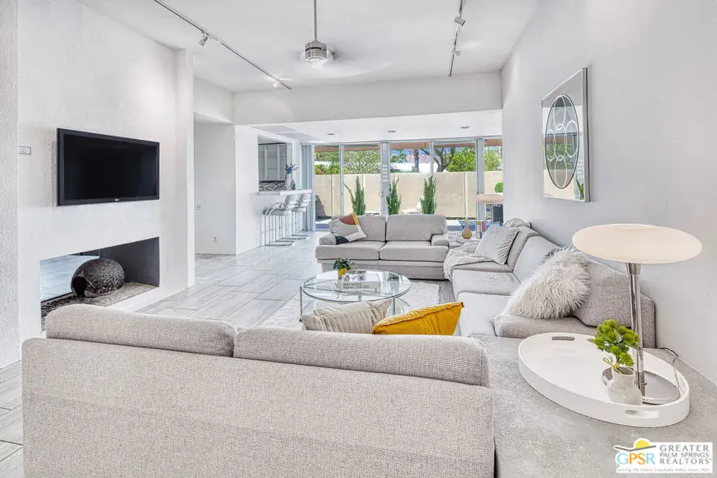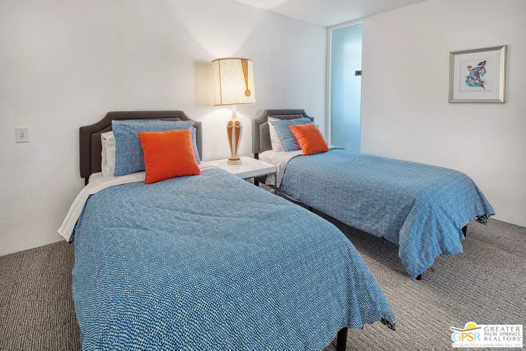 BRING OFFER!: Step into a timeless 1966 architectural home in historic Tamarisk Gardens where iconic mid-century meets modern design. Glass sliders frame dramatic western mountains while sunlight pours through skylights, highlighting tall ceilings and retro double-sided fireplace. Its TRANQUIL poolside location in the quiet 28-unit community offers the very best in privacy, convenience, and views. Designed for both Relaxation and Entertaining, the flexible floor plan offers three en suite baths plus versatile bonus spaces that adapt seamlessly to your lifestyle: (studio? home office? gym?) Recent upgrades: Wi-Fi enabled HVAC, NEW 200/220 electrical panel, dedicated EV charger in 1 of 2 deeded parking spots. Your front door opens directly to the peaceful, sparkling pool and spa, surrounded by “lushly landscaped grounds” (as described in M. Riche’s book MOD MIRAGE.) Fee-simple ownership (you own!) LOW HOA covers premium cable & wifi, garbage, grounds, roof & exterior maintenance. Only two owners in units history–never rented, this rare meticulously maintained home offers legacy alongside Greater Palm Springs luxury living. Tamarisk Country Club member bonus: enjoy a secure private cart/ walking gate entry. (Buyer & buyer’s agent to verify all information.)