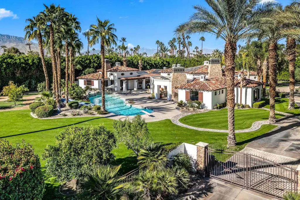 In the heart of Rancho Mirage, within the exclusive guard-gated community of The Renaissance at Clancy Lane, this extraordinary Santa Barbara inspired estate offers unmatched privacy, scale, and sophistication. Encompassing 1.5 acres framed by mature hedges, the residence unfolds behind a private gated drive, where a dramatic olive tree sets the tone for the timeless beauty within. Spanning over 7,000 sq. ft., the home blends artisan craftsmanship with modern luxury. Interiors are highlighted by soaring 15-foot beamed ceilings, marble surfaces, and designer finishes throughout. The dual-island kitchen is a showpiece, outfitted with stainless steel appliances, dual refrigerators, and abundant space for both everyday living and grand entertaining. Smart home automation, owned solar, and motorized shades bring contemporary convenience to this elegant retreat. The primary suite is a private sanctuary with dual-sided fireplace, spa-inspired bath, and separate walk-in closets. Four additional bedroom suites, each with its own bath and custom built-ins, provide comfort and privacy, while an attached casita in a separate wing welcomes guests or extended family. A generous den/media room provides versatility for work or leisure. Outdoors, the estate transforms into a true resort. Expansive covered living areas, a stone fireplace, and built-in kitchen with BBQ, refrigerator, and ice maker creates the perfect spot for gatherings. A full-sized lighted sport court, playground, turf lawn, orchard, and professional landscape lighting enhance the grounds. At the center is a spectacular 75-foot saltwater pool with waterfall, slide, diving board, and spa, all positioned for dramatic southwest mountain and sunset views. A rare offering of scale, beauty, and amenities, this home embodies the absolute pinnacle of desert living.