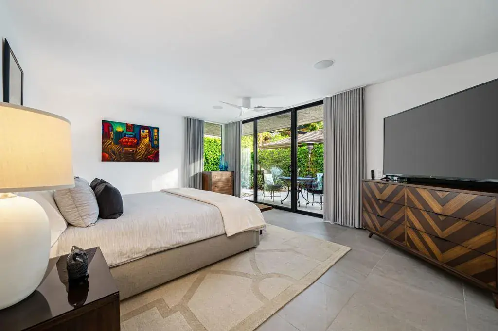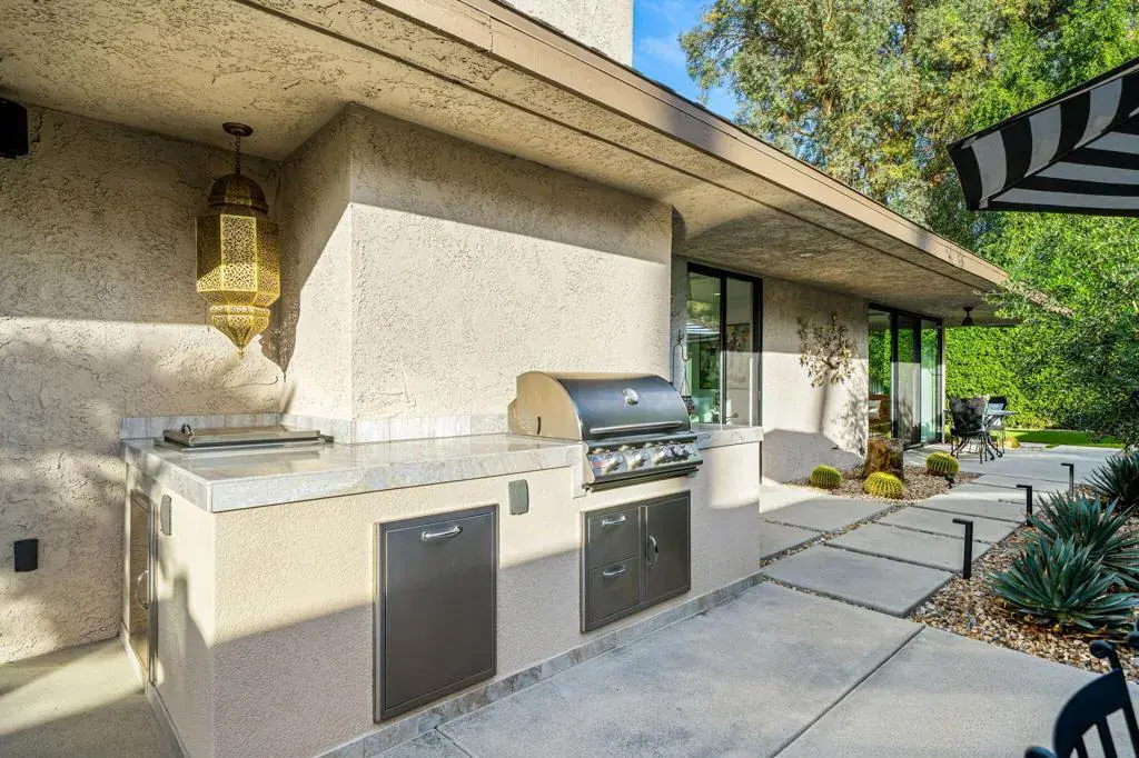 Commanding a rare perimeter position against a golf course, this extraordinary contemporary estate is a private sanctuary defined by unobstructed, cinematic views of the San Jacinto mountain range–a distinction enjoyed by no other home on the street. Completely freestanding and enveloped by mature hedges and perimeter walls, the property delivers a level of privacy, quiet, and exclusivity seldom found. Inside, the home unfolds as a masterclass in modern luxury. Expanses of glass flood the interiors with natural light, blurring the line between indoors and out. Clean architectural lines, elevated finishes, and curated design details create an atmosphere that is both striking and effortlessly livable. The living space centers around a dramatic statement fireplace, anchoring the home with warmth and visual impact while maintaining a flawless contemporary aesthetic.The kitchen is both artful and functional, featuring quartz surfaces, custom grain-matched walnut cabinetry, and a premium appliance suite designed for serious entertaining. Three luxuriously appointed en-suite bedrooms offer hotel-caliber comfort and privacy, each enhanced with sound-dampening construction, custom closets, and spa-inspired bathrooms finished with refined stone, rain showers, and designer fixtures. The primary suite elevates the experience further with an indulgent soaking tub and elevated spa amenities. Outdoors, the residence transforms into a resort-level retreat. A newly redesigned saltwater pool and spa, finished in elegant PebbleTec and controlled via mobile technology, is surrounded by expansive lounging, dining, and entertaining spaces. A custom outdoor kitchen, integrated sound system, exterior quartzite shower, multiple seating zones, and a turf area ideal for bocce ball create a setting equally suited for tranquil mornings or unforgettable evenings under the desert sky. Thoughtful modern infrastructure–including an owned 17+ kW solar system, upgraded electrical and gas capacity, advanced lighting, and refined landscaping–ensures beauty is matched by performance and efficiency. This is more than a home; it is a statement of lifestyle–where architectural intention, location, privacy, and luxury converge in rare harmony. An exceptional offering for those who demand both distinction and discretion.