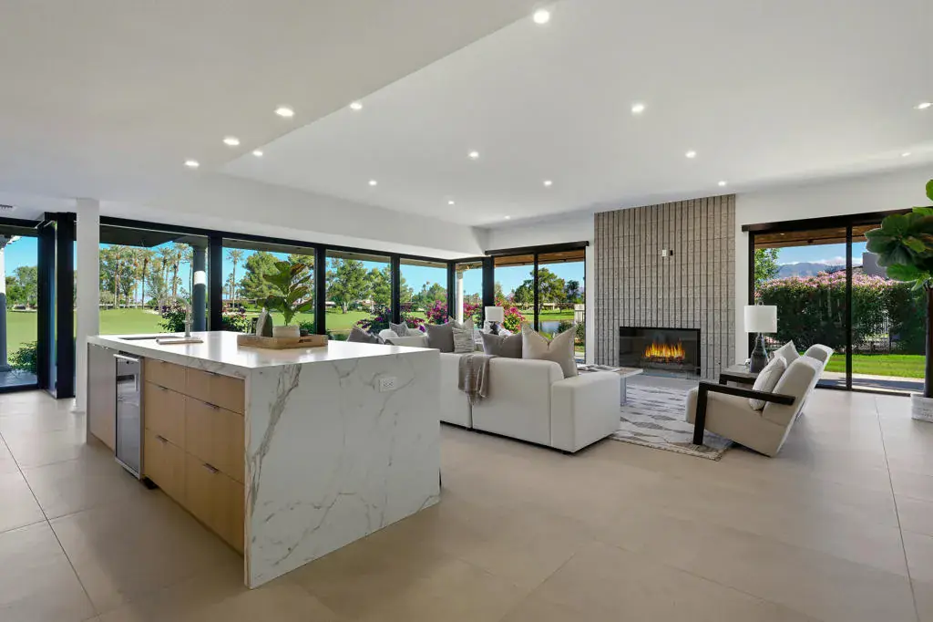 Experience elevated desert living in this stunning 3-bedroom, 3-bathroom, lakefront residence showcasing panoramic south and southwest views across the 1st and 2nd double fairways. Thoughtfully expanded and extensively remodeled in August 2025. The Shaughnessy floor plan has been transformed into a modern masterpiece where sophisticated design meets effortless indoor-outdoor living. A wall of glass wraps the morning room, kitchen, and living area, framing serene water and golf course vistas while flooding the home with natural light. The open-concept living space features 24”x48” porcelain tile flooring throughout, a striking split-face concrete slab fireplace, and seamless transitions to the expansive outdoor patio–ideal for relaxing or entertaining against a breathtaking backdrop. The chef’s kitchen is a true showpiece, boasting waterfall quartz countertops, custom soft-close cabinetry, and top-of-the-line KitchenAid appliances. Every detail was curated with luxury and functionality in mind, offering both a refined aesthetic and exceptional performance. Automatic Blinds are installed throughout the home. Each of the three spacious bedrooms offers comfort and privacy, with beautifully updated en-suite baths showcasing designer finishes and modern fixtures. The primary suite captures tranquil lake views and exudes understated elegance, while guest suites provide the perfect retreat for family and friends. Additional upgrades include two newer HVAC systems (installed 2 years ago), all-new ductwork, and a four-foot expansion off the living room, enhancing both comfort and livability. Perfectly positioned to capture morning light and glowing sunset skies, this home offers the best of golf course and waterfront living in one exquisite setting. Every inch reflects thoughtful craftsmanship and contemporary luxury–making this residence truly one of a kind. The Springs, it’s where you belong!