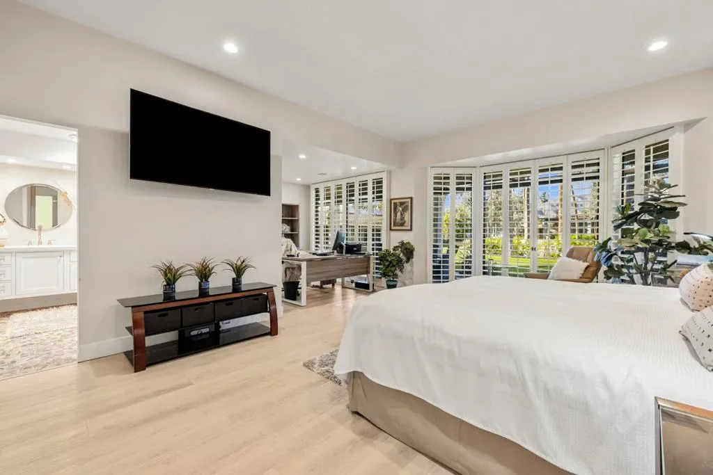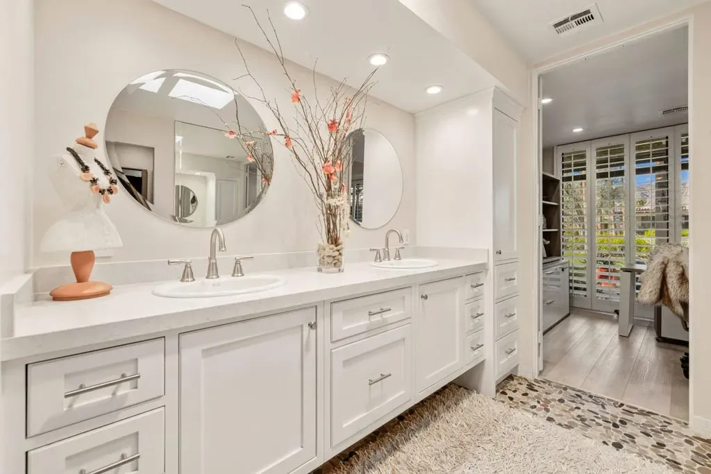 Discover this beautifully updated home nestled within The Springs Country Club in the heart of Rancho Mirage, offering the best of desert living. This sought-after Shaughnessy floor plan offers three bedrooms, three bathrooms, and a private pool and spa designed for ultimate relaxation. The open-concept layout blends modern elegance with effortless indoor-outdoor living. The kitchen features two spacious peninsulas, providing generous prep space, casual seating, and an ideal layout for both everyday living and entertaining. Multiple seating areas and stunning western mountain views enhance the home’s inviting atmosphere. The spacious primary suite serves as a peaceful retreat, featuring a generous sitting or office area, a spa-style bathroom, private sauna, and ample closet space. Two additional guest suites each offer their own private bathrooms and direct access to outdoor patios, providing comfort and privacy for family and guests. The pool and spa are ideally situated on the south side of the home, allowing for optimal sunlight year-round. A separate patio off the living room captures breathtaking western mountain views and includes a covered area, perfect for enjoying the outdoors while staying shaded from the desert sun. Additional highlights include a circular driveway and a spacious 2.5-car garage, offering ample parking and convenience.
