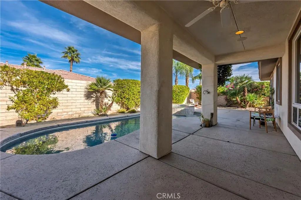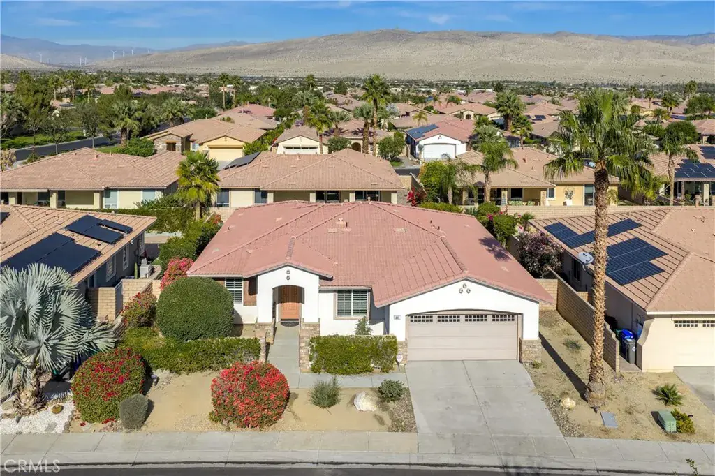 Lowest priced private pool home in the wonderful, gated community of Tuscany. Enjoy views of the San Jacinto mountain peak from your rear yard and private pool, spa, and firepit. You can even see the light at the top of the tram at night. This community boasts exceptional space, landscaping, a gated entry, dog park, playground, and stunning water fountain. The community pool and hot tub with bathrooms and BBQ equipment are across the street. The home has a practical floor plan with 3 bedrooms, 2 bathrooms and an additional flex room that would make a stately home office or den. Enjoy the surround sound speaker system, air conditioning, and convenient single level living. Also, this property was just retrofitted with all those items that insurance companies are looking for like water flow, temperature and smoke detector monitoring, a tremendous help in getting new insurance. Affordable Coachella Valley living in a fantastic community near everything that makes the Palm Springs area so desirable.