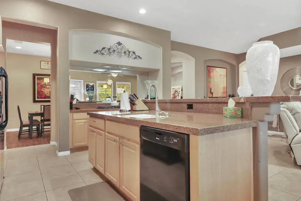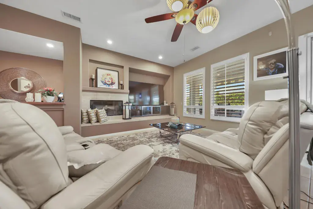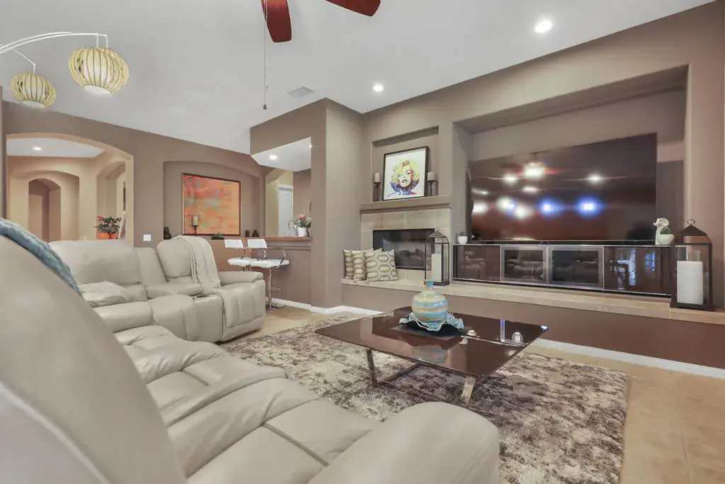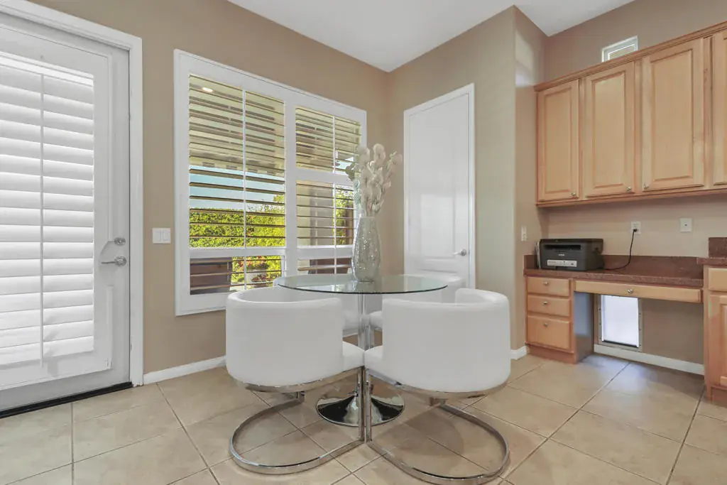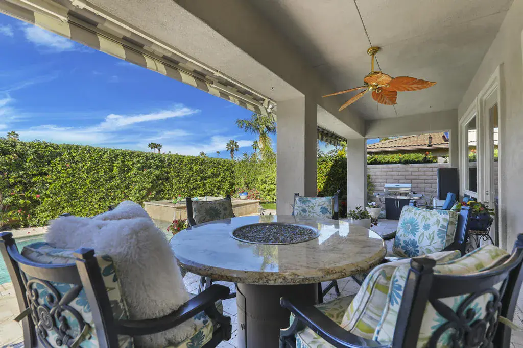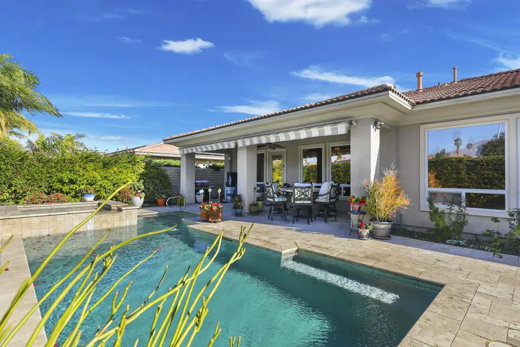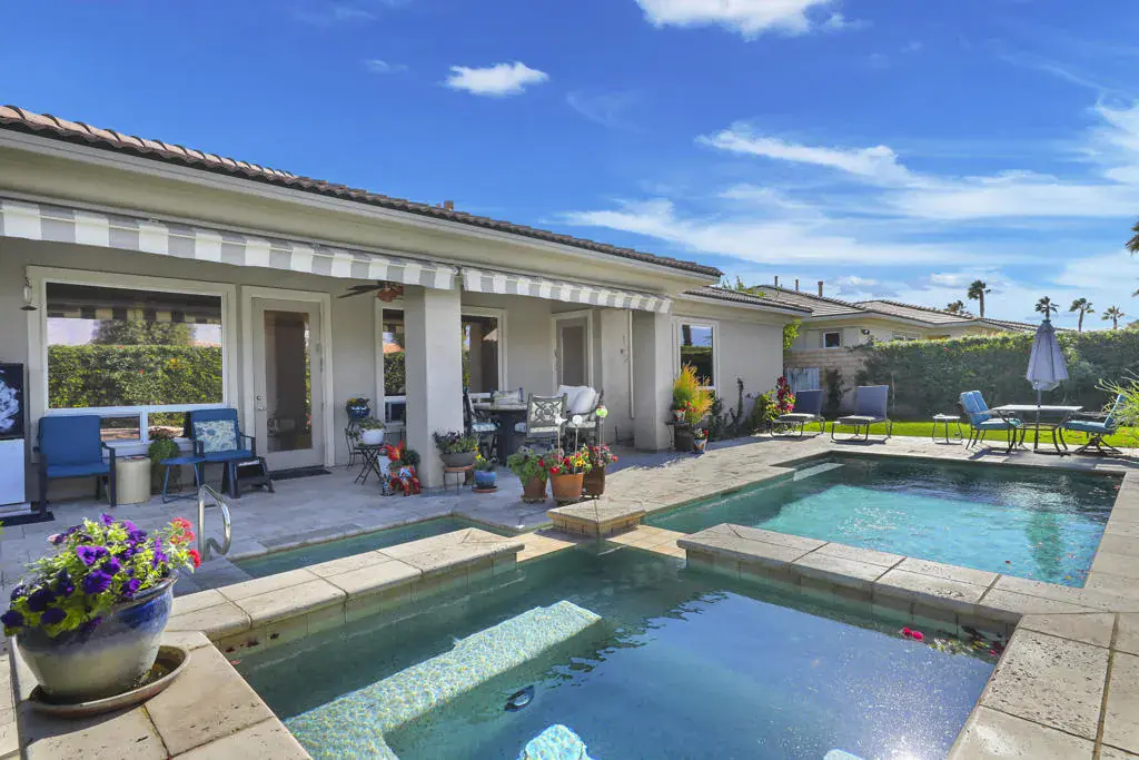 Welcome to this fabulous Tuscany Stunner! . The open layout reveals 2627sq ft of beautifully designed living space, featuring 4 spacious bedrooms and 3 full bathrooms. The gourmet kitchen is a chef’s delight, featuring granite counters, pantry, island & entertaining counter, double wall ovens and a separate designer alcove with a 5-burner gas cooktop. Beautiful formal dining room, coffered ceilings, tile and wood laminate flooring, plantation shutters, fireplace and wet bar with seating. Primary master suite has dual vanities plus a make-up table, a raised oval tub, separate glass block walk-in shower, large walk-in closet and door to the patio. Bedroom 2 and 3 share a Jack and Jill shower with dual sinks and mirrored closets. There is dedicated laundry room with sink and a 2 car garage with Epoxy floors. Outside offers a private backyard oasis, featuring a Pebble-Tec saltwater heated pool with raised spa. Only 12 years old!! Covered patio with designer limestone tiles plus an awning offers plenty of shade cover. Dual zone AC and SOLAR paid for!!!!!