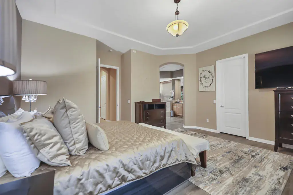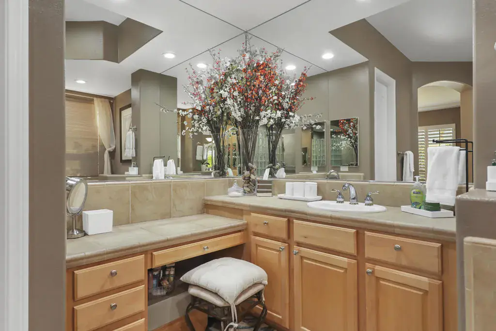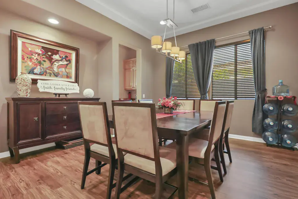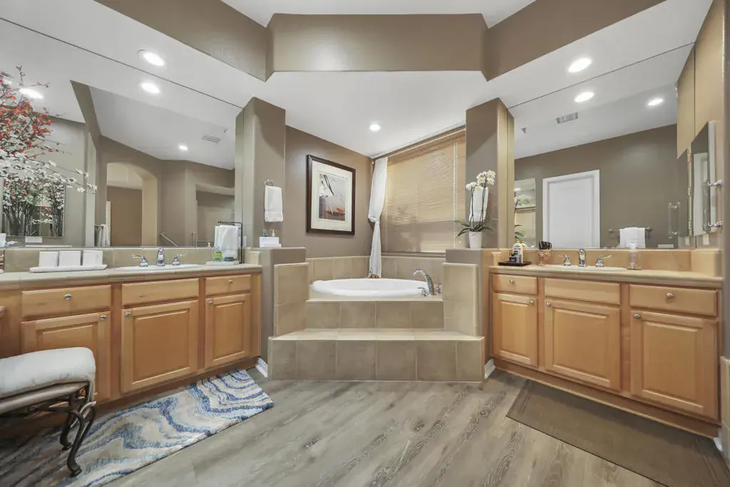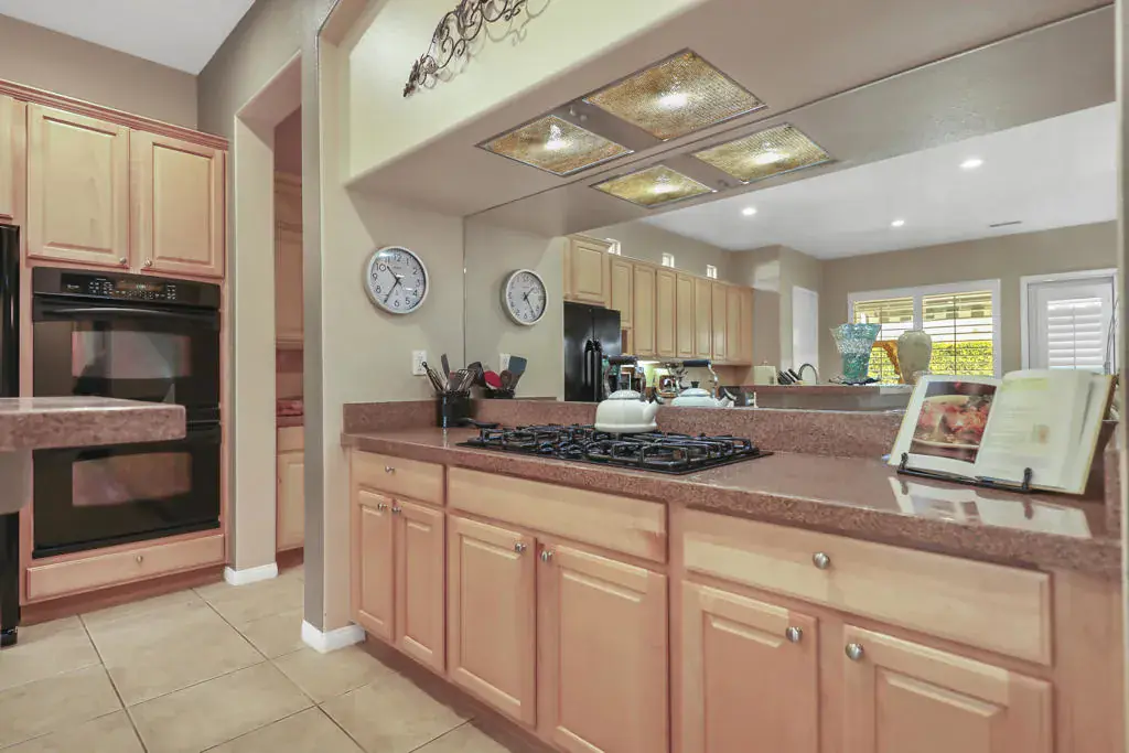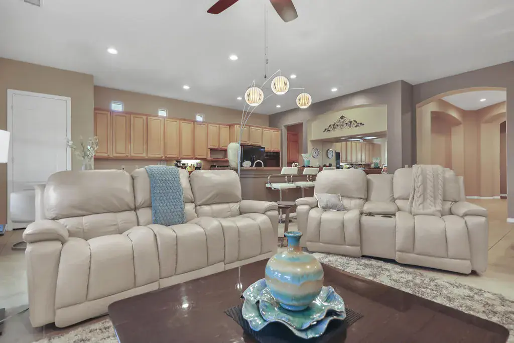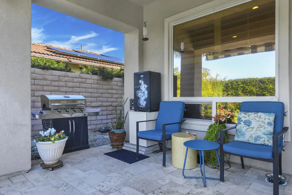 Welcome to this fabulous Tuscany Stunner! . The open layout reveals 2627sq ft of beautifully designed living space, featuring 4 spacious bedrooms and 3 full bathrooms. The gourmet kitchen is a chef’s delight, featuring granite counters, pantry, island & entertaining counter, double wall ovens and a separate designer alcove with a 5-burner gas cooktop. Beautiful formal dining room, coffered ceilings, tile and wood laminate flooring, plantation shutters, fireplace and wet bar with seating. Primary master suite has dual vanities plus a make-up table, a raised oval tub, separate glass block walk-in shower, large walk-in closet and door to the patio. Bedroom 2 and 3 share a Jack and Jill shower with dual sinks and mirrored closets. There is dedicated laundry room with sink and a 2 car garage with Epoxy floors. Outside offers a private backyard oasis, featuring a Pebble-Tec saltwater heated pool with raised spa. Only 12 years old!! Covered patio with designer limestone tiles plus an awning offers plenty of shade cover. Dual zone AC and SOLAR paid for!!!!!