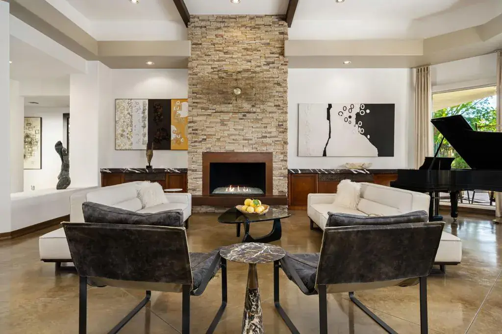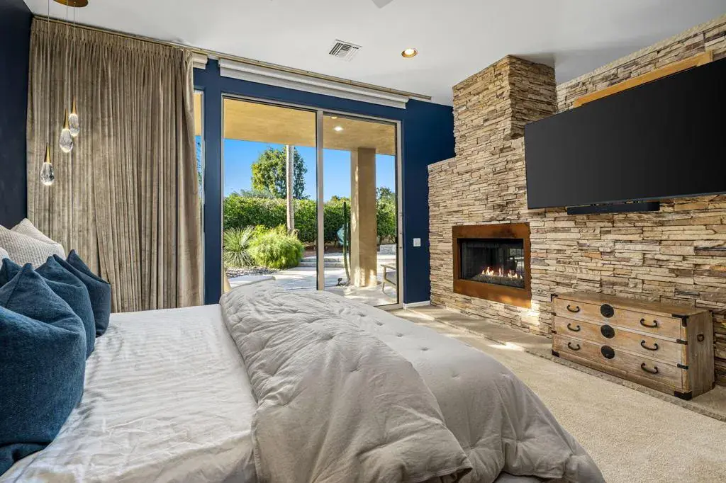 Soaring mountain views in this beautifully finished contemporary home that feels like a peaceful desert retreat. From the moment you enter, the home is designed for effortless living and elevated entertaining. The great room is spectacular–anchored by a sunken bar and opening to a newly refreshed backyard that is desert-friendly, yet surprisingly lush. Step outside and you’ll find the true showpiece: a recently renovated pool with a calming water feature that softens the outside world and creates a serene, spa-like atmosphere–quiet, zen, and resort-worthy. The primary suite is exceptional and lives like its own private sanctuary. A dramatic fireplace divides the space, creating a cozy sitting room feel, while two spa-style bathrooms provide comfort and true separation. Dual oversized walk-in closets, plus a wet bar with a mini refrigerator, complete the suite with the convenience of a luxury hotel. Guests are equally well cared for, with three en suite bedrooms, including a fourth suite currently used as an office–complete with a full bathroom and closet. The kitchen is pristine and beautifully upgraded with new stone countertops and abundant storage, and the adjoining family room looks directly out to the pool and BBQ area–perfect for relaxed, everyday desert living. Additional highlights include a newer roof and an exceptionally well-maintained interior.