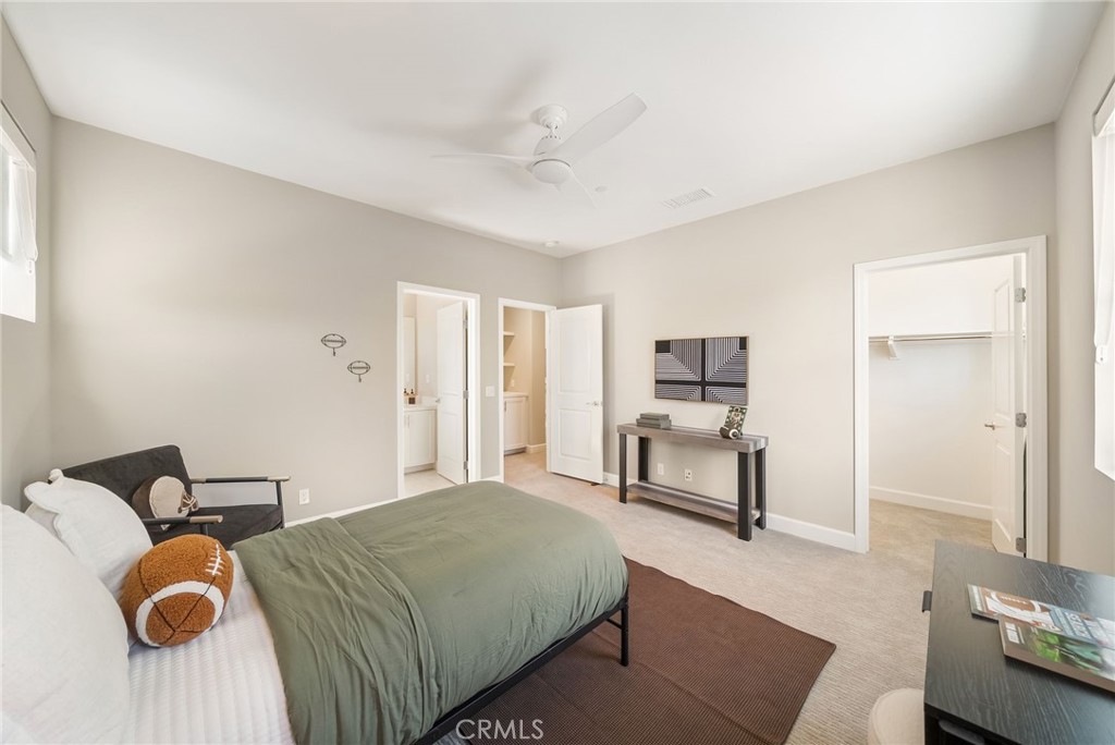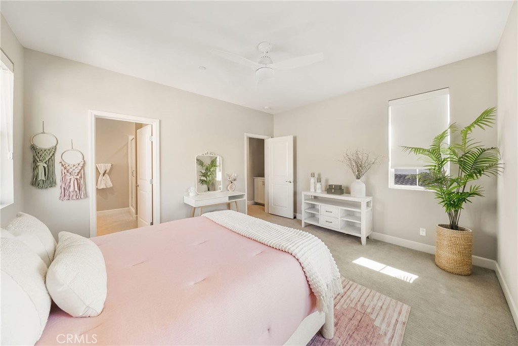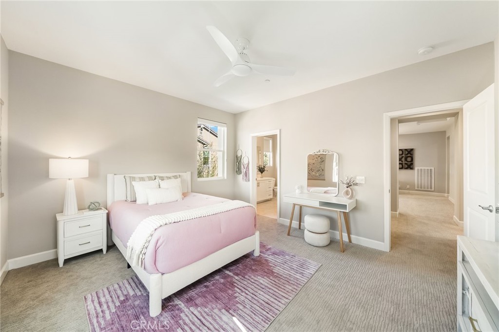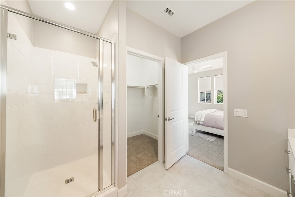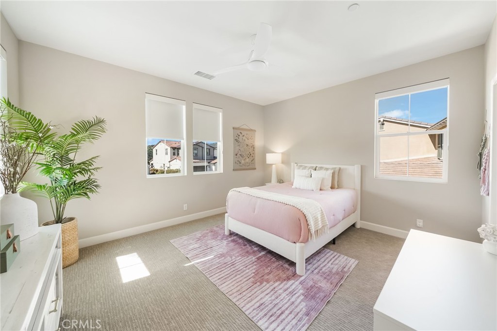 DOWNSTAIRS PRIMARY SUITE with an OPTIONAL FOURTH BEDROOM conversion available in the upstairs loft, offering flexibility for evolving needs. This thoughtfully designed Rancho Mission Viejo home features a functional layout where each bedroom includes its own walk-in closet and private ensuite full bathroom, providing comfort and privacy for both residents and guests.The open-concept living space is designed for seamless indoor-outdoor living, featuring accordion doors that open to the covered loggia, creating an inviting extension of the living area ideal for entertaining or relaxing. The primary suite includes its own sliding glass doors with direct access to the outdoor space, adding to the home’s thoughtful design and connection to the outdoors.The downstairs living areas are enhanced with Hunter Douglas electric blinds, offering both convenience and a refined finish throughout the main level.