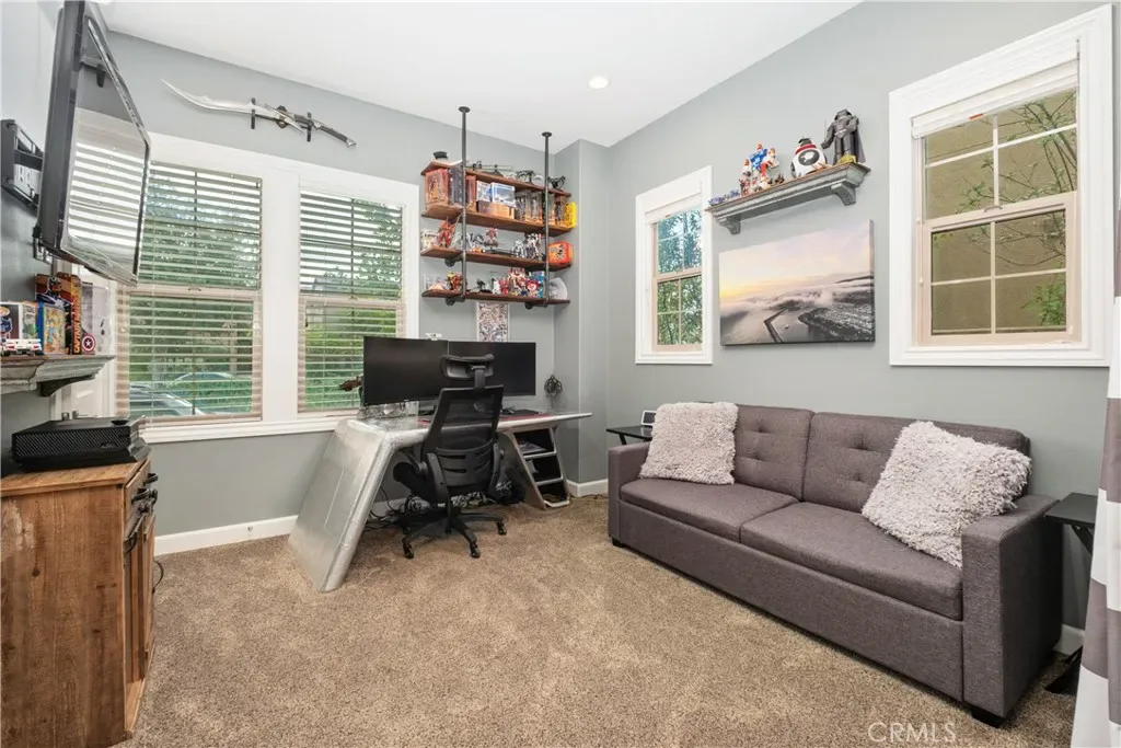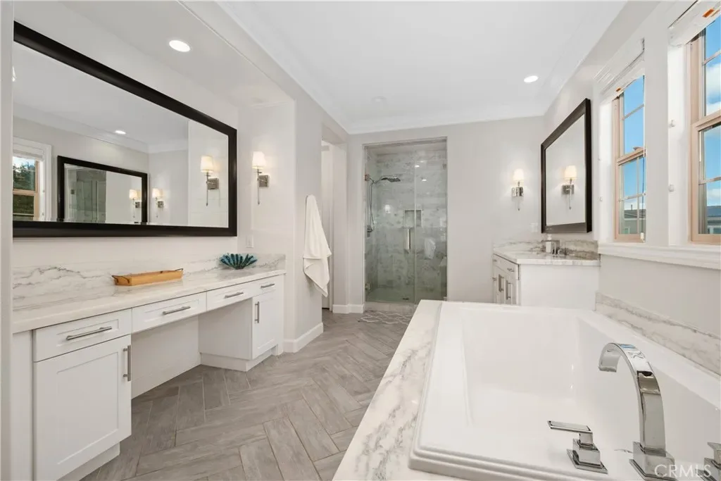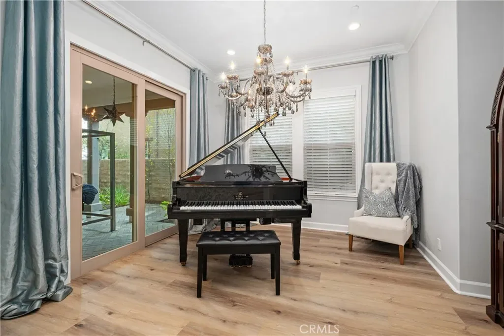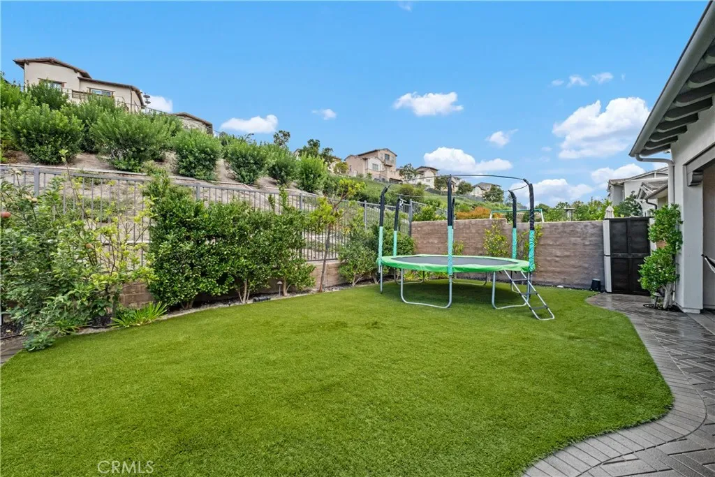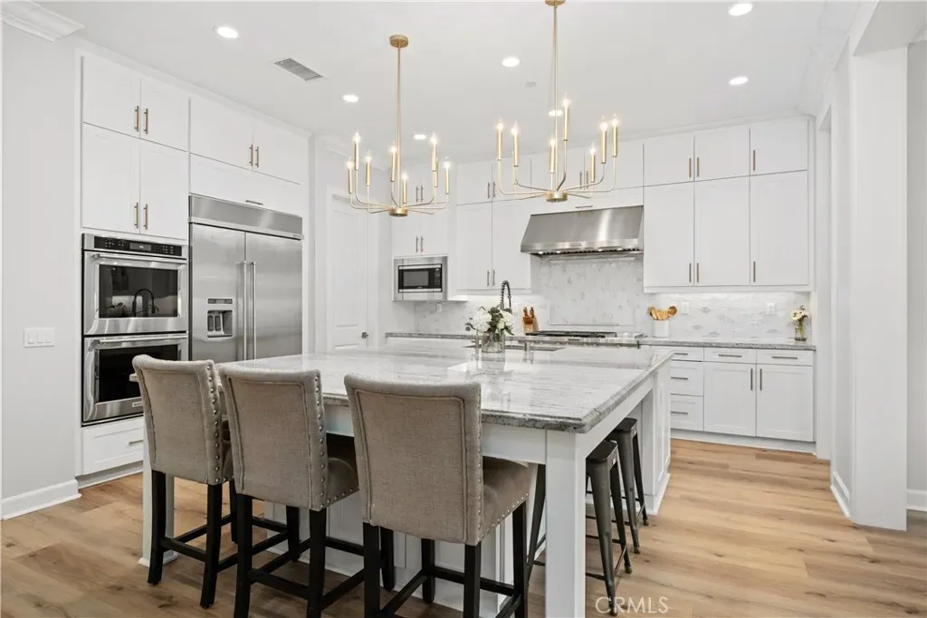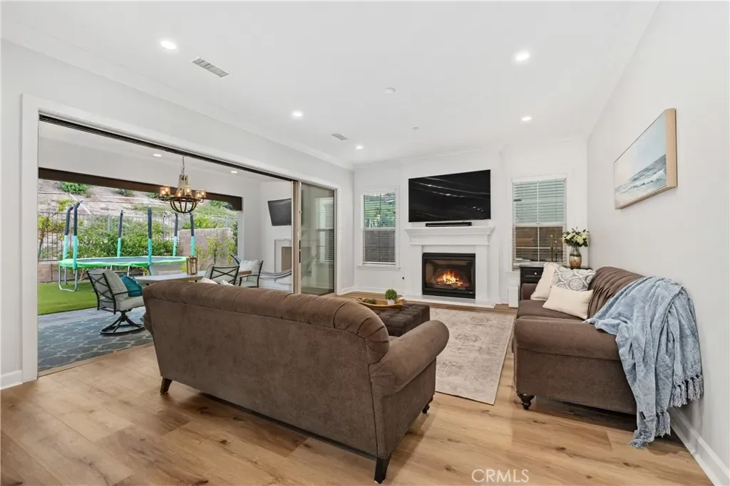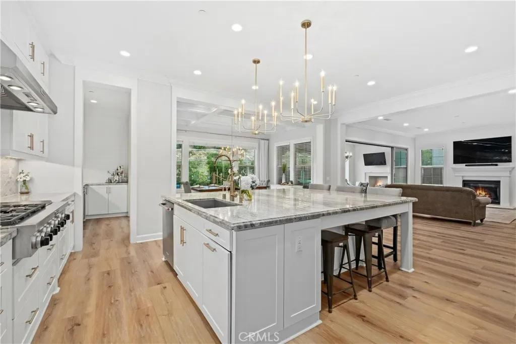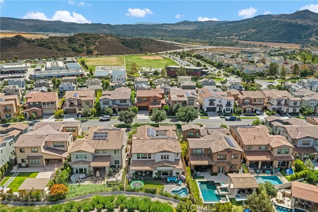 Nestled within the coveted Esencia community of Rancho Mission Viejo, this exceptional 5-bedroom, 5.5-bath Aubergine Plan 3 residence has been thoughtfully upgraded and meticulously designed. Refreshed with new exterior paint, the home offers impressive curb appeal. A charming courtyard welcomes you and separates the home from the casita, ideal as an office or guest suite with its own entrance, newer AC, and full bathroom. Inside, wainscoting frames the grand staircase and elegant foyer. Fresh interior paint and new luxury vinyl flooring on the first level create a bright, contemporary aesthetic. Every window features custom casing, complemented by 10″ crown molding and dimmable smart switches. A flexible downstairs den offers endless possibilities. The open-concept living space is the heart of the home, where the kitchen seamlessly connects to the family and dining areas. The kitchen showcases white cabinetry with new champagne gold hardware, an oversized granite island, and premium stainless-steel appliances including a built-in refrigerator, double oven, 6-burner cooktop, and microwave. Coffered ceilings and new chandeliers elevate the dining area, while the extended dry bar has dual beverage refrigerators. A walk-in pantry and timeless backsplash complete the space. Stackable sliders open to a serene California room, where you can enjoy fireplaces both inside and out. The private backyard features low-maintenance turf with app-controlled sprinklers, pavers, apple trees, and a saltwater pebble tech spool with waterfall and fire pit. Upstairs, the primary suite offers beautiful views and a coffered ceiling. The upgraded bathroom includes herringbone tile flooring, marble countertops, a soaking tub, walk-in shower, and dual walk-in closets. Three additional bedrooms—two with ensuite baths—plus a hallway bath, laundry room, and bonus/movie room complete the upper level. The bonus room includes projector wiring, 5.1 surround sound, and movie screen paint creating a 115″ viewing wall. Additional highlights include a 3-car garage with epoxy flooring, overhead storage, and two prewired EV outlets. The home also features two tankless water heaters and fully paid solar panels for energy efficiency. Residents enjoy top-rated schools and resort-style amenities including pools, spas, playgrounds, fitness centers, tennis and pickleball courts, bocce ball, an arcade, and more—offering an unparalleled lifestyle in one of Orange County’s most desirable communities.
