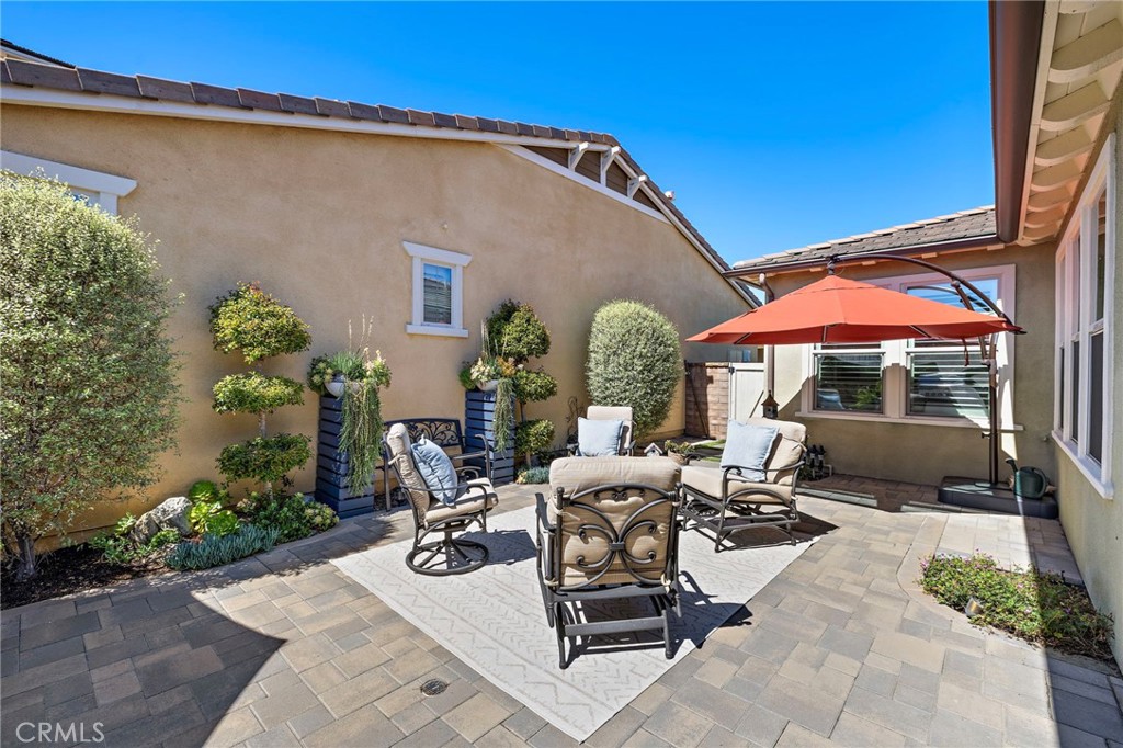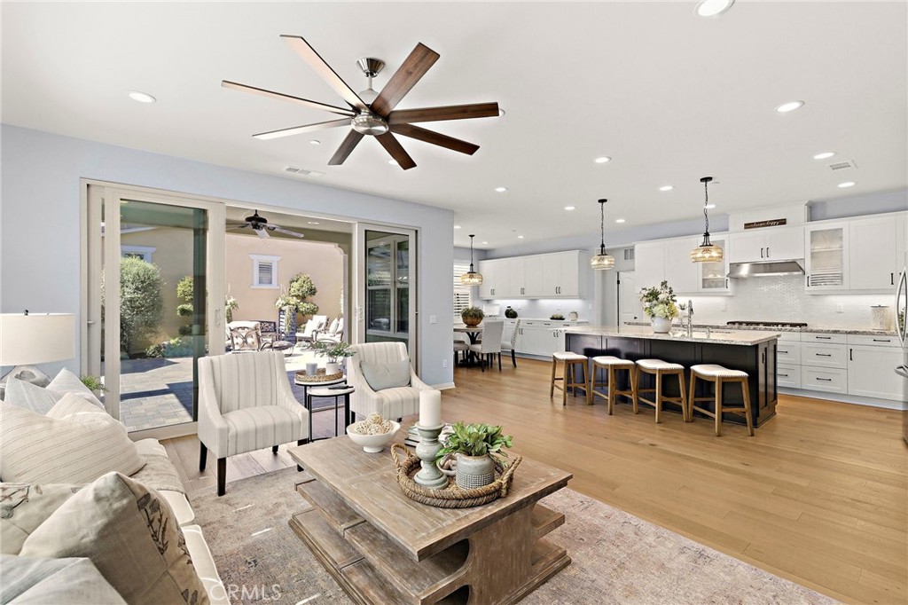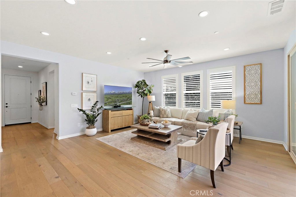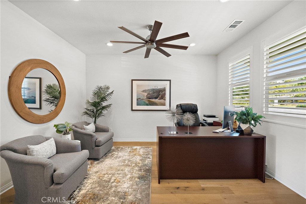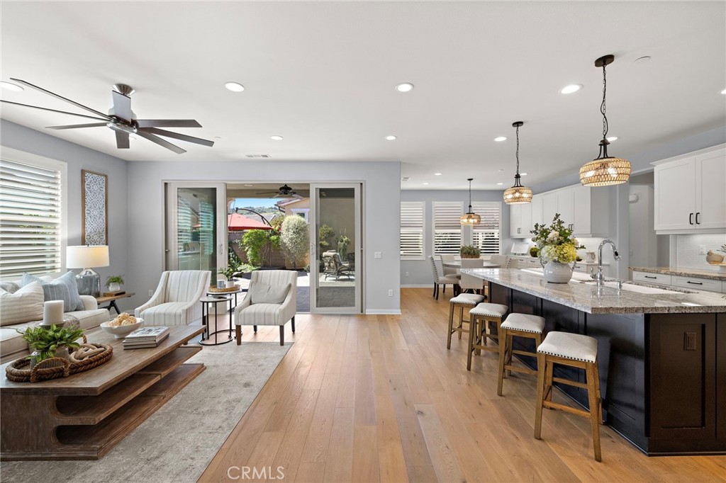 Welcome To The best in 55+ Active Living in the RESORT STYLE COMMUNITY Of Rancho Mission Viejo. This wonderful floorplan is all SINGLE LEVEL with no interior steps and 2 bedrooms plus office/den and two full bathrooms. Pull up to this Street Facing Home with PRIVATE 2 CAR DRIVEWAY and Welcoming Front Porch. Gorgeous Real Wood Floors, White Shaker Style Cabinets and Contrasting Espresso Island Cabinet, Neutral Granite Countertops, Mini White Subway Tile Backsplash, All Black Hardware Pulls, Porcelain Farm Basin Sink, Stainless Steel Appliances, and Beautiful Rattan Pendant Lights and Dining Chandelier. This Open Floorplan was Masterfully Designed with the Guest Suite, Office and Guest Bath Near the Front of the Home, Great Room at the Heart of the Home and the Master Suite Secluded at the Back of the Home for Privacy. The Guest Suite is Spacious with Wood Plank Floors, Recessed Lights and Woven Shades on the Large Windows. The Adjacent Guest Bath includes a Step-in Shower with Oversized Tile Surround and Frameless Glass Enclosure, Quartz Topped Vanity with Mosaic Tile Backsplash, Linen Style Tile Floors and Framed Mirror. Front Den/ Office Holds Endless Possibilities with Views to the Front Porch and Plenty of Room for a Working Office or a Den for Relaxing. The Master Suite is a Private Sanctuary with Plush Designer Carpeting, Plantation Shutters, Beautiful Focal Wall of “Peel and Stick” Removable Wallpaper, Recessed Lights and Peaceful Views of the Backyard. Ensuite Master Bath Doesn’t Compromise Luxury with the Spa Bath with Upgraded Quartz Countertops, Beautiful Marble Chevron Tile Backsplash at both Dual Vanity and the Tub, Step in Oversized Shower and Rain Glass Privacy Glass Windows plus walk-in Closet with Built-ins. Enjoy the View to the Backyard through the Double Wide Slider accessing the Covered Loggia with Ceiling Fan, Paver Hardscape throughout, BBQ Island with Stainless Steel BBQ, Tranquil Fountain, Turf Lawn and Beautiful Mature Low Maintenance Plants. The Two Car Garage with Overhead Racks, Whole House Water Softener, and Three Large Windows Almost Make It Feel Like An Extension of the Home. Steps from the home is one of the exclusive 55+ amenities, The Outlook Pool with resort style pool, jacuzzi spa, firepit, bbq and outdoor room with fireplace and TV. Plus access all of the amenities in RMV including 10 resort pools, fitness centers, pickleball, firepits and more. Come Experience the Best In 55+ Living in This Active Community!