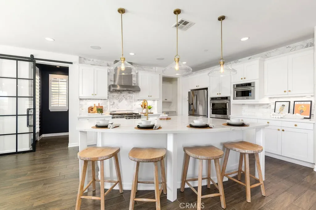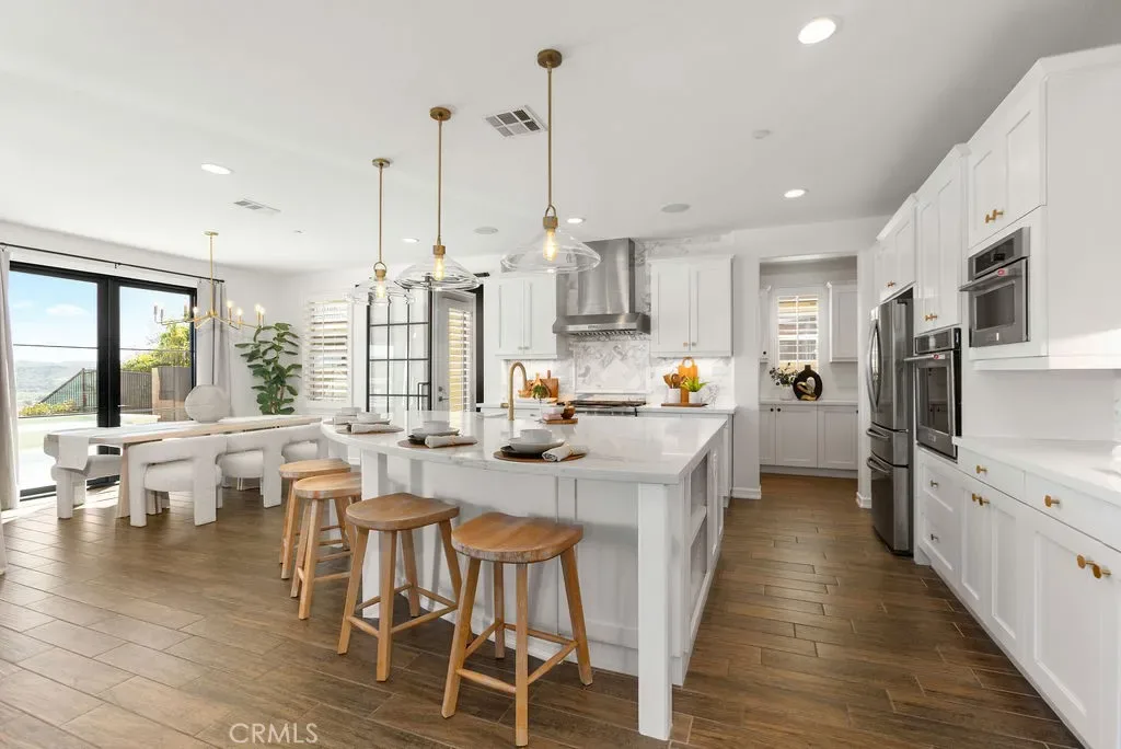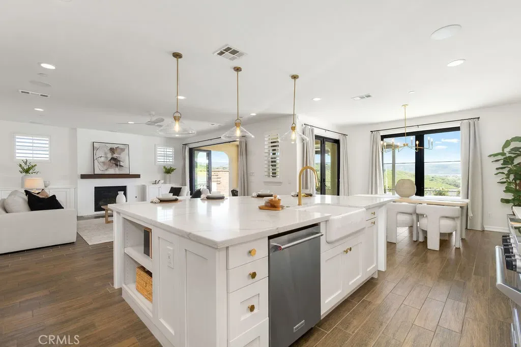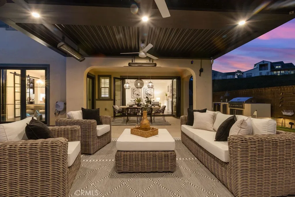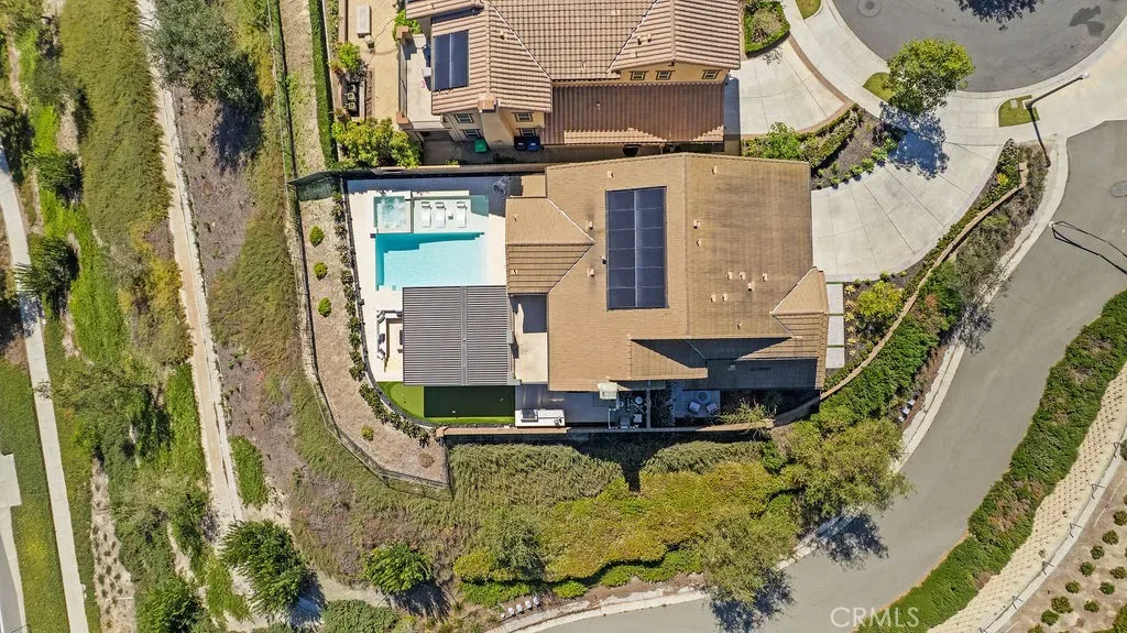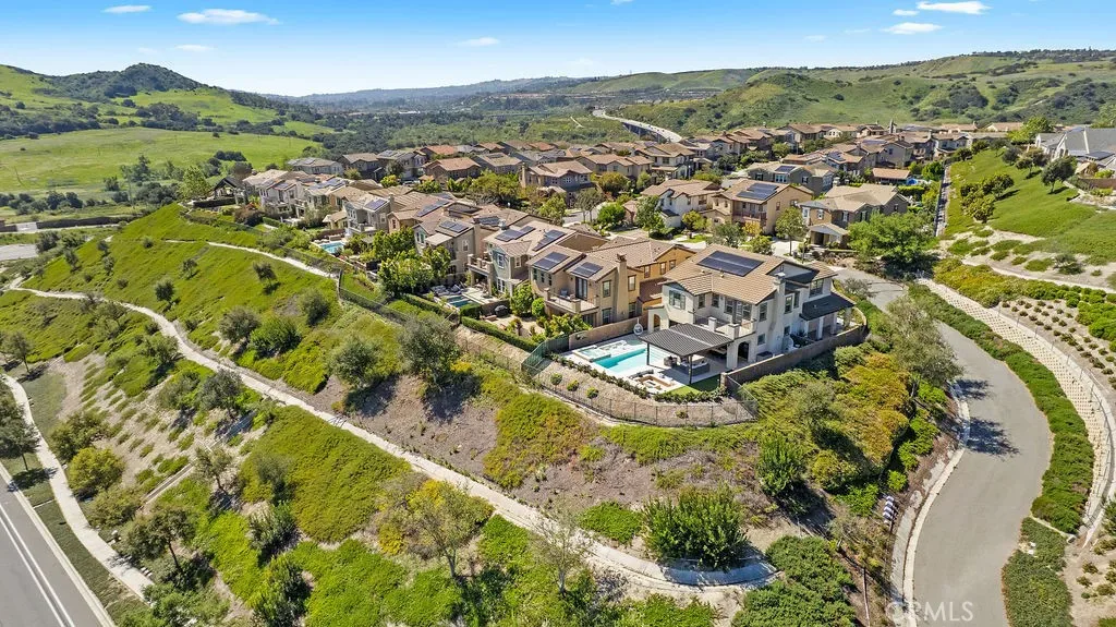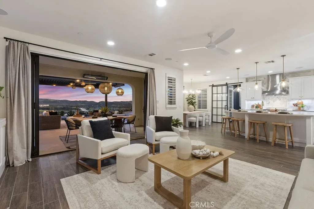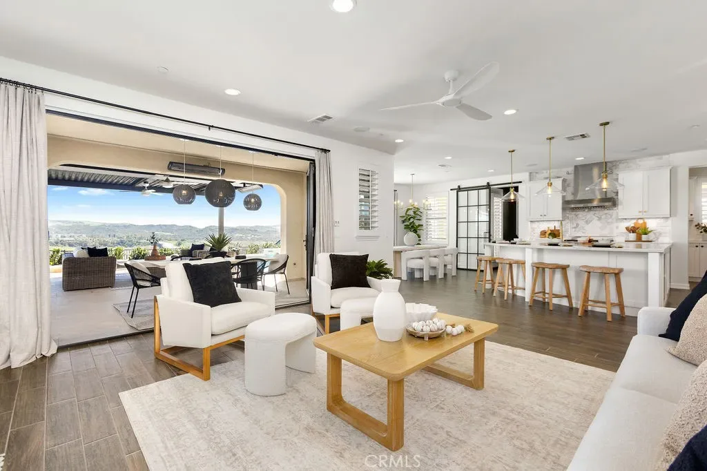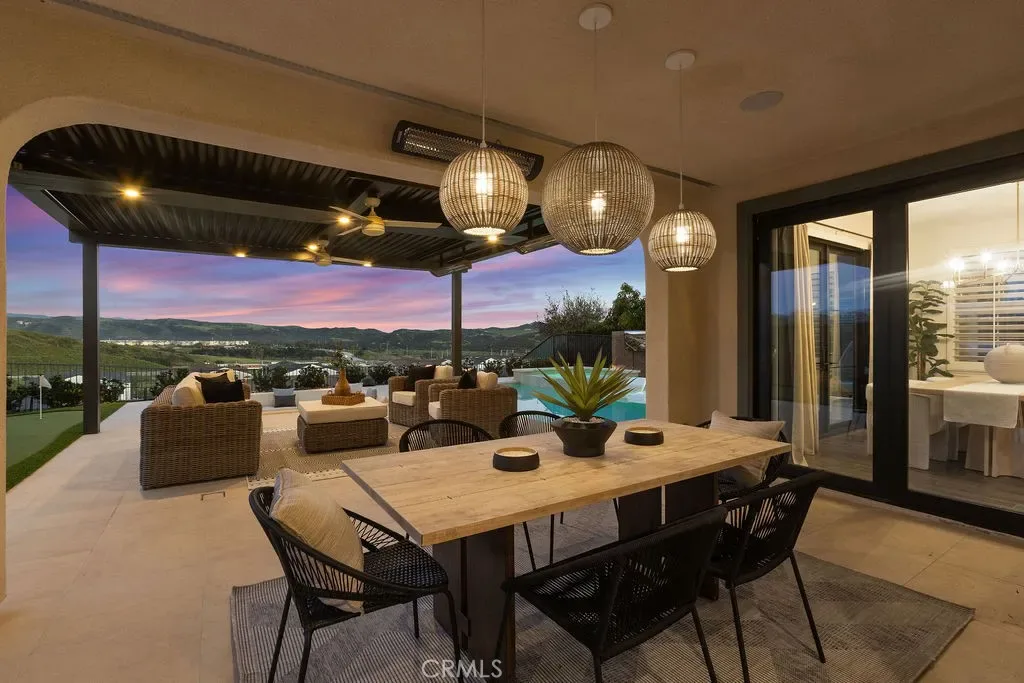 Situated at the end of a quiet cul-de-sac with only one neighboring home, this exceptional residence offers privacy, panoramic views & nearly $800k in premium upgrades. Located on the largest lot in the development with a spectacular resort-style backyard and extensive customized interior. The newly completed backyard retreat features a saltwater pool & spa with a serene spillway. An inviting sunken lounge with an integrated fire pit and ambient LED under-seat lighting, along with a 3-hole putting green- perfect for year-round enjoyment. A 12’x20’ STRUXURE Smart Patio System w/ automatic rain sensors creates a 480 sq ft extension of the CA room with 4 electric heaters. The outdoor BBQ island features a 42” grill, beverage refrigerator, and ice machine. An outdoor shower with a dedicated on-demand water heater adds a luxurious resort touch. The impressive open-concept interior showcases a beautifully designed Great room w/ expansive bifold doors that open to the backyard oasis. The Dining area w/custom iron doors frames the pool & skyline view. Opening to a chef’s dream kitchen, quartz countertops, stunning marble backsplash, spacious center island w/ countertop seating, and a custom walk-in pantry with floor-to-ceiling storage & butcher block countertops. Enter a stylish dry bar through an iron sliding door, featuring 2 beverage refrigerators and custom shelving to enhance entertaining. The main level also includes a guest bedroom w/ closet organizer and a newly redesigned powder bath with elegant marble accents and an LED backlit mirror. Upstairs, the primary suite offers custom cabinetry & a private walk-out balcony with forever views of the Cleveland National Forest. The luxurious primary bath features dual vanities, a soaking tub, a luxurious oversized marble shower & 2 spacious closets with custom built-in organizers. Two additional secondary bedrooms upstairs include walk-in closets with custom organizers (one with a walk-out balcony) and an additional bath with dual sinks. An enclosed loft with custom cabinetry & a stunning iron door provides a versatile bonus/office space. The laundry room and additional storage complete the upstairs. Additional upgrades include an integrated Sonos sound system, plantation shutters, paid-for solar, new interior paint, and updated light fixtures. RMV residents enjoy all amenities, including Clubhouses, resort-style pools/spas, Esencia K-8 school, fitness center, Pickleball, Tennis, Sports fields, and so much more!