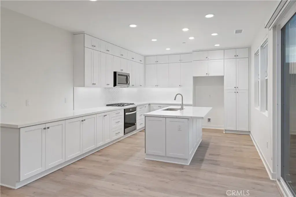 Vinyl plank flooring throughout, complemented by plush carpeting in the two secondary bedrooms for added coziness. A modern kitchen boasting a spacious island and white shaker cabinets extending to the ceiling, providing generous storage and a chic, contemporary vibe. Bright and open living spaces enhanced with recessed lighting, luxuriously designed bathrooms, and custom plantation shutters and zebra shades for privacy and style.