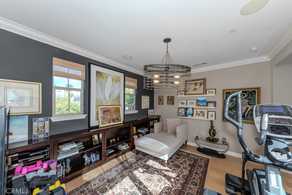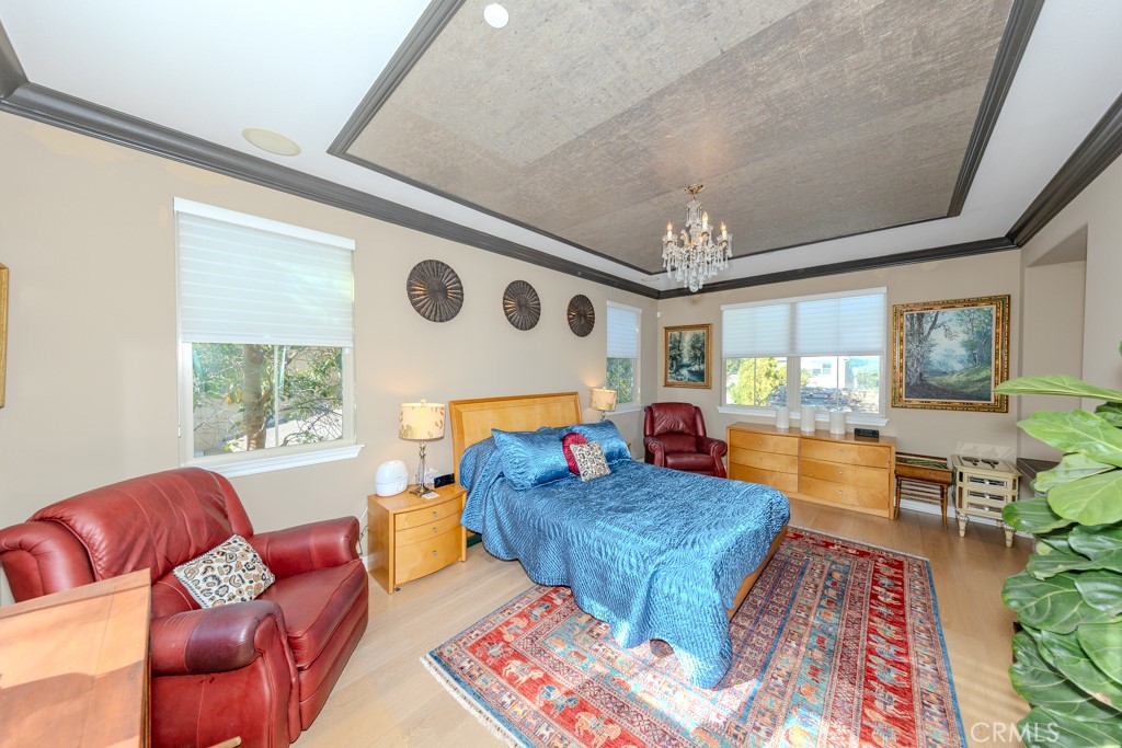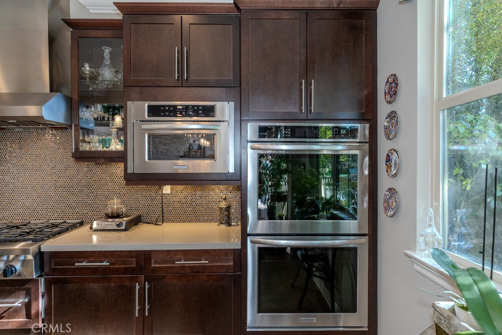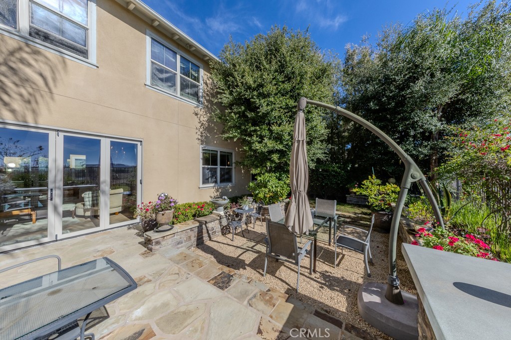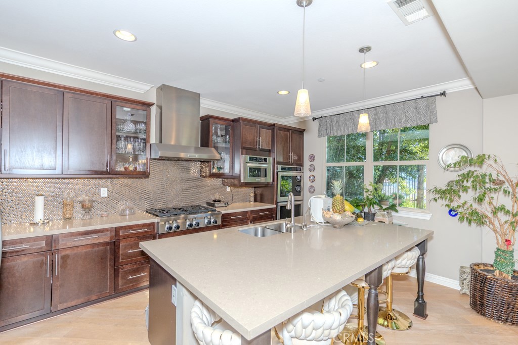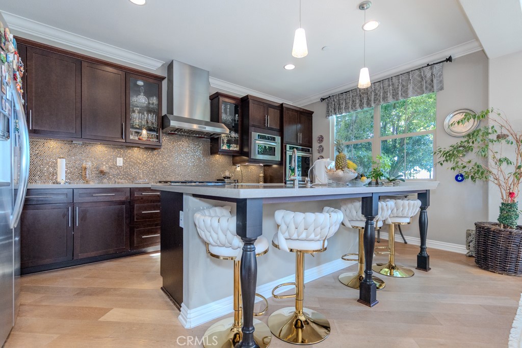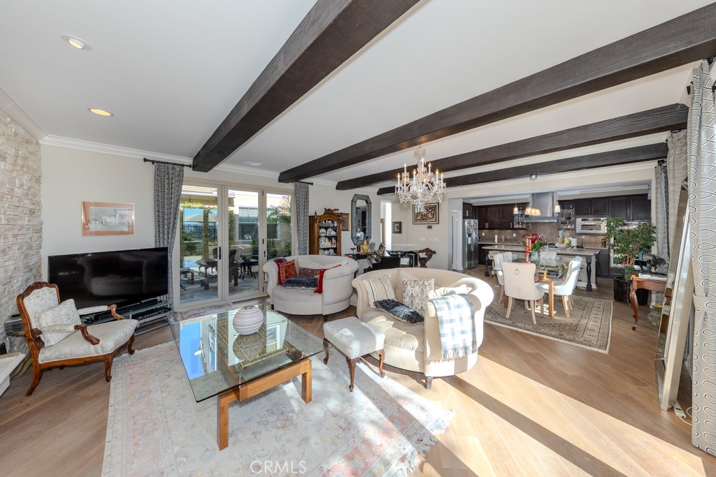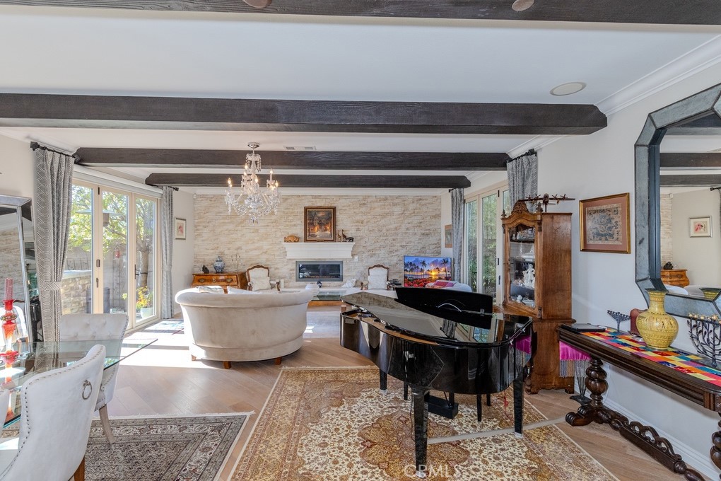 Enter via the welcoming gated courtyard with flagstone pavers, fire feature, and fountain creates a tranquil outdoor lounge. Inside, the open-concept great room showcases exposed beam ceilings, a dramatic stacked-stone fireplace with floating mantle, and La Cantina bi-fold doors opening seamlessly to the courtyard and backyard, creating true Southern California indoor-outdoor living. Chef’s kitchen designed for entertaining and everyday living featuring a large center island with seating, Caesarstone countertops, Java shaker cabinetry, custom pendant lighting, a walk-in pantry, and KitchenAid stainless appliances including a Pro-Series 36-inch gas cooktop and double ovens.