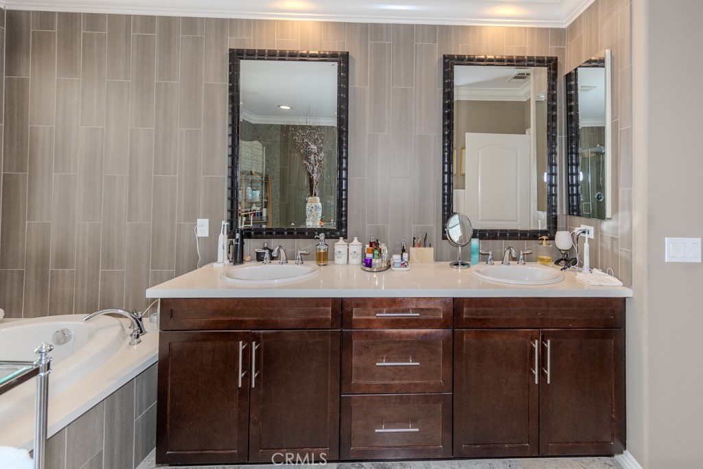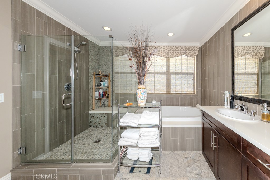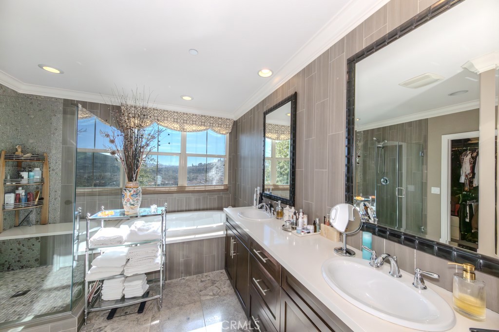 Upstairs, the primary suite is a private retreat with hillside views. A spa-inspired primary bathroom offers dual vanities, a soaking tub positioned beneath a large picture window, a walk-in shower with designer tile and bench seating, and a spacious walk-in closet with custom organizers. The upper level also includes three additional bedrooms, a versatile loft/flex space that can easily convert to a fifth bedroom, a builder option, and a convenient upstairs laundry room with sink and built-in cabinetry. Additional highlights include upgraded wood and tile flooring, custom millwork, recessed lighting, surround sound speakers, Hunter Douglas window coverings, dual-pane windows and doors, home security system, and garage parking for two cars, one via direct access.