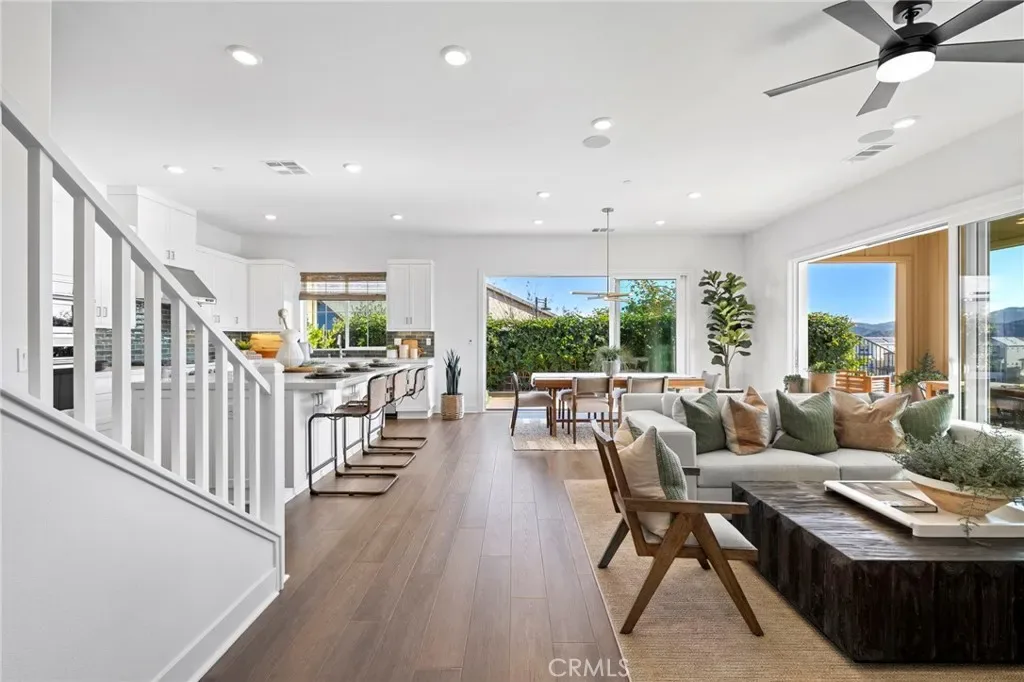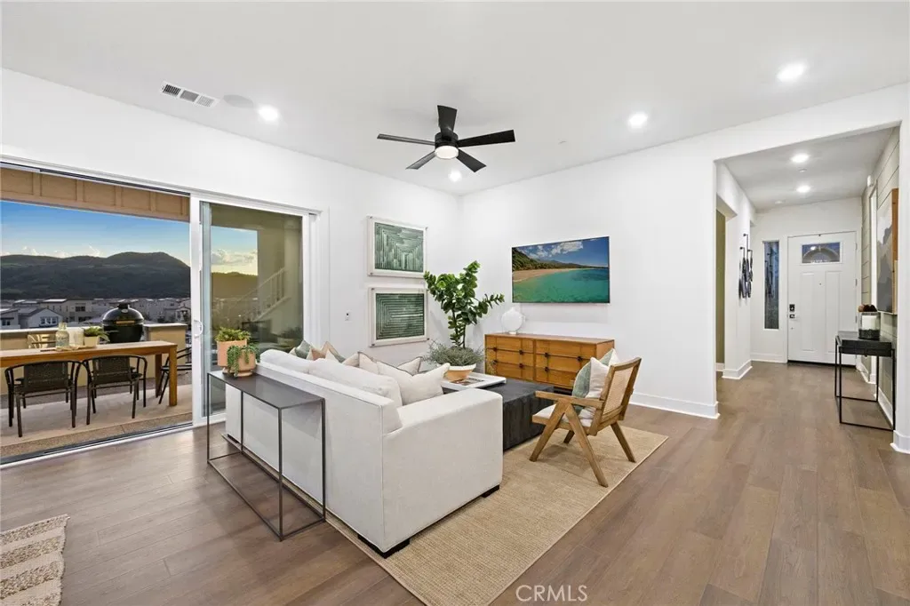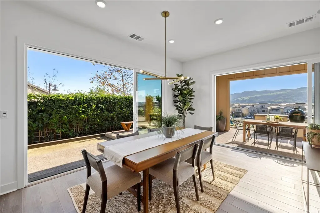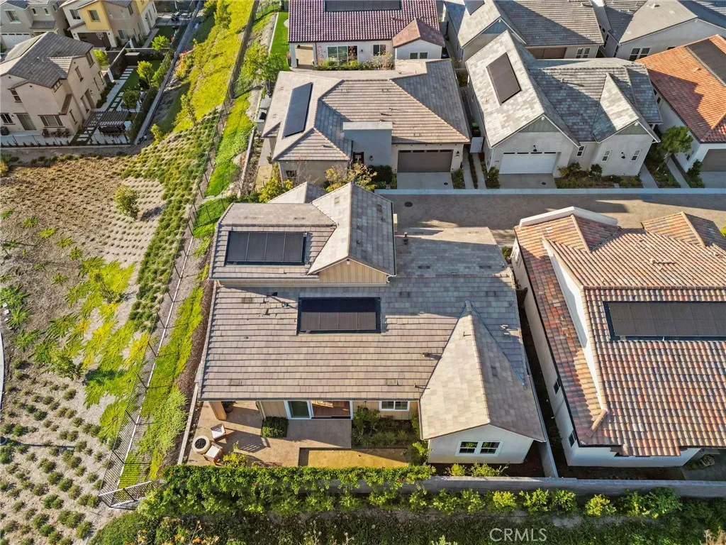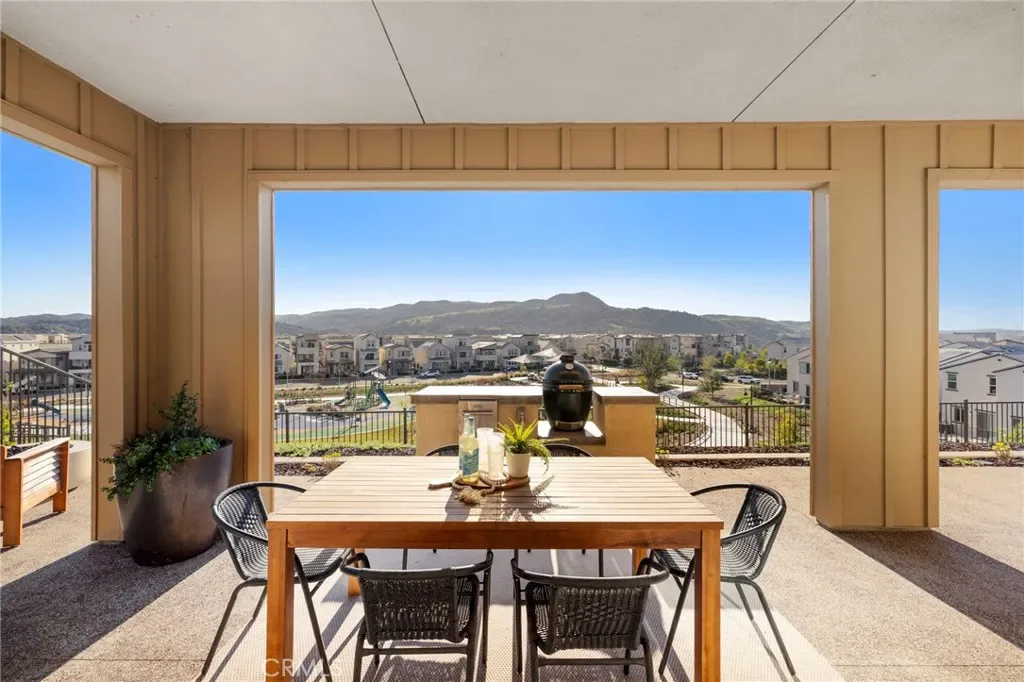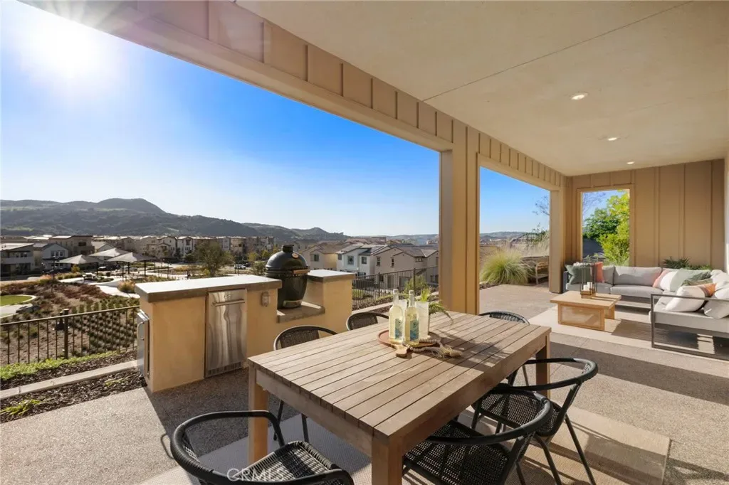 Stunning Fully Furnished Former Model Home with panoramic views and beautiful upgrades! Upon entry you are drawn in by the dual glass stacking doors opening to the stunning backyard with panoramic views of the hills and beyond. Rich wide plank luxury vinyl flooring flows throughout the main living spaces of this highly upgraded former model home. The kitchen features white cabinetry with soft close hinges, white quartz countertops, full tile backsplash and stainless steel appliances—including a large built-in refrigerator and 6 burner stove. Two bedrooms, including the primary suite and secondary suite, office, laundry room and powder bath are all on the first floor—including an attached two-car garage with epoxy flooring plus an 8 panel Solar System. Just upstairs the second floor boasts a large bonus room with full bath which can be used as a third bedroom suite, gym or game room. The spacious primary suite with beautiful limestone tile focal wall and designer chandelier. It’s generous ensuite bath has a dual sink vanity, walk-in shower with glass enclosure and bench seat and a large walk-in closet. Office with custom paint and a modern oversized brass ceiling light for a curated look. Guests will be welcomed with upgraded carpeting, a stylish wallpapered accent wall and striking gold chandelier. Plus the ensuite bath with single sink vanity and tub/shower combination makes it a luxurious space for guests. Upstairs is a oversized bonus room with wrap around windows that share the same stunning views as the backyard. With an ensuite full bath and wall of closets, this space is full of options. The home’s backyard is the star of the show! On a corner lot offering maximum privacy with only one neighbor the side and unobstructed views of open space and mountains beyond. A combination of hardscape pavers, turf and mature landscaping with ambient lighting make it a comfortable space to spend time outdoors day or night. The large covered patio with recessed lighting nearly spans the entire length of the back of the home and the wrap around yard includes a bocce ball court. A built-in BBQ bar has a Green Egg smoker and stainless steel refrigerator —convenient for outdoor entertaining. Steps from the home is the Perch 55+ Pool complex plus you have access to all of the amenities that both Gavilan and Rancho Mission Viejo have to offer which include ten community pools and clubhouses, tennis and pickleball courts, walking trails, coffee shop, gyms and more.