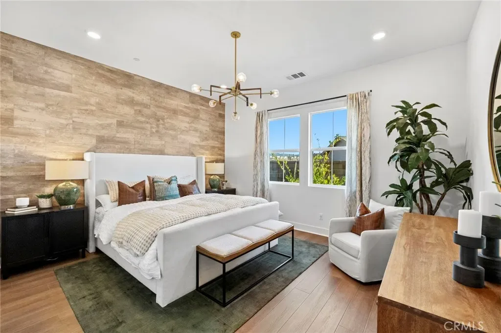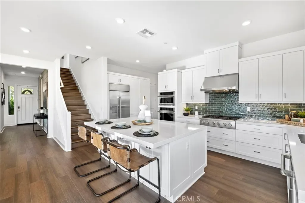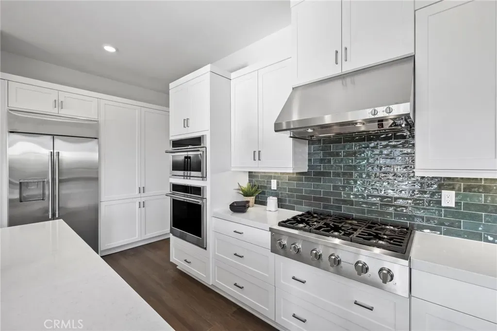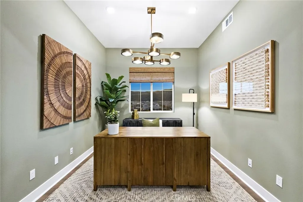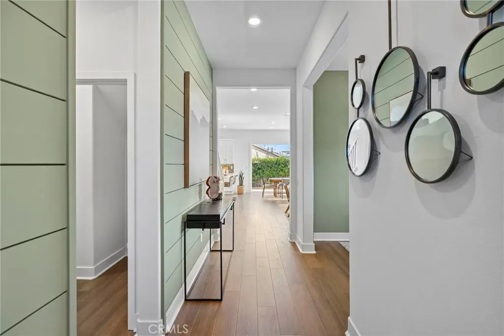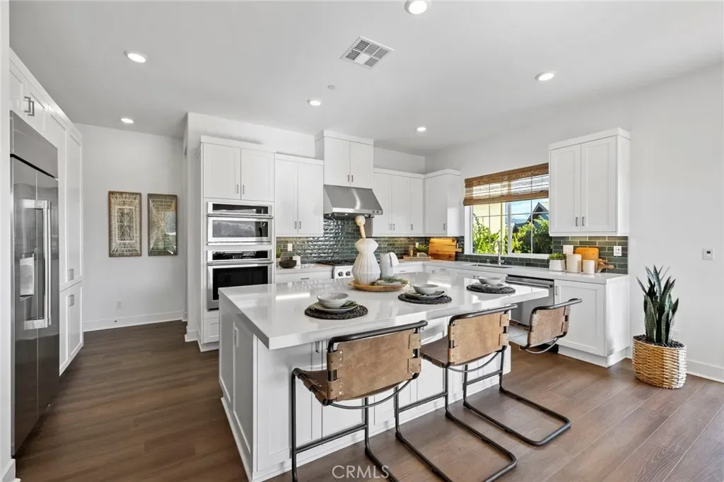 Stunning Fully Furnished Former Model Home with panoramic views and beautiful upgrades! Upon entry you are drawn in by the dual glass stacking doors opening to the stunning backyard with panoramic views of the hills and beyond. Rich wide plank luxury vinyl flooring flows throughout the main living spaces of this highly upgraded former model home. The kitchen features white cabinetry with soft close hinges, white quartz countertops, full tile backsplash and stainless steel appliances—including a large built-in refrigerator and 6 burner stove. Two bedrooms, including the primary suite and secondary suite, office, laundry room and powder bath are all on the first floor—including an attached two-car garage with epoxy flooring plus an 8 panel Solar System. Just upstairs the second floor boasts a large bonus room with full bath which can be used as a third bedroom suite, gym or game room. The spacious primary suite with beautiful limestone tile focal wall and designer chandelier. It’s generous ensuite bath has a dual sink vanity, walk-in shower with glass enclosure and bench seat and a large walk-in closet. Office with custom paint and a modern oversized brass ceiling light for a curated look. Guests will be welcomed with upgraded carpeting, a stylish wallpapered accent wall and striking gold chandelier. Plus the ensuite bath with single sink vanity and tub/shower combination makes it a luxurious space for guests. Upstairs is a oversized bonus room with wrap around windows that share the same stunning views as the backyard. With an ensuite full bath and wall of closets, this space is full of options. The home’s backyard is the star of the show! On a corner lot offering maximum privacy with only one neighbor the side and unobstructed views of open space and mountains beyond. A combination of hardscape pavers, turf and mature landscaping with ambient lighting make it a comfortable space to spend time outdoors day or night. The large covered patio with recessed lighting nearly spans the entire length of the back of the home and the wrap around yard includes a bocce ball court. A built-in BBQ bar has a Green Egg smoker and stainless steel refrigerator —convenient for outdoor entertaining. Steps from the home is the Perch 55+ Pool complex plus you have access to all of the amenities that both Gavilan and Rancho Mission Viejo have to offer which include ten community pools and clubhouses, tennis and pickleball courts, walking trails, coffee shop, gyms and more.