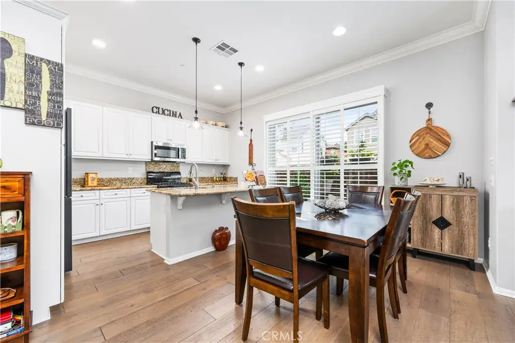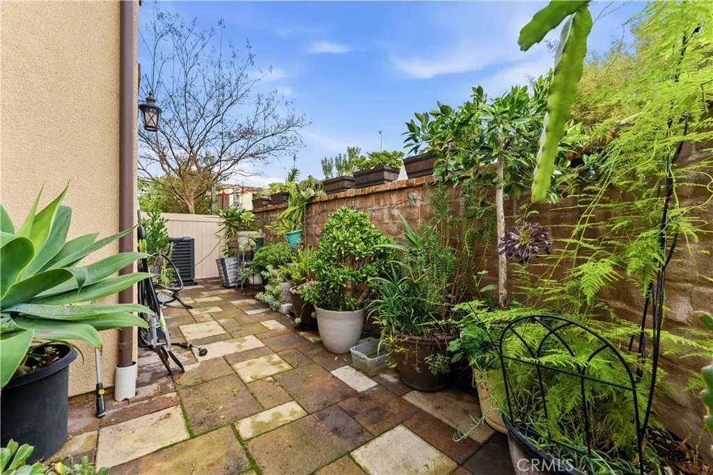 The kitchen is appointed with granite countertops and opens to the dining area and living room which are highlighted by beautiful wood laminate flooring throughout the downstairs. The main level includes a versatile den and a convenient half bath, ideal for a home office, guest space, or flex room. Plantation shutters throughout the home offer another touch of class, even on the slider that leads to the outdoor patio area! Enjoy a low-maintenance patio ideal for outdoor relaxation.