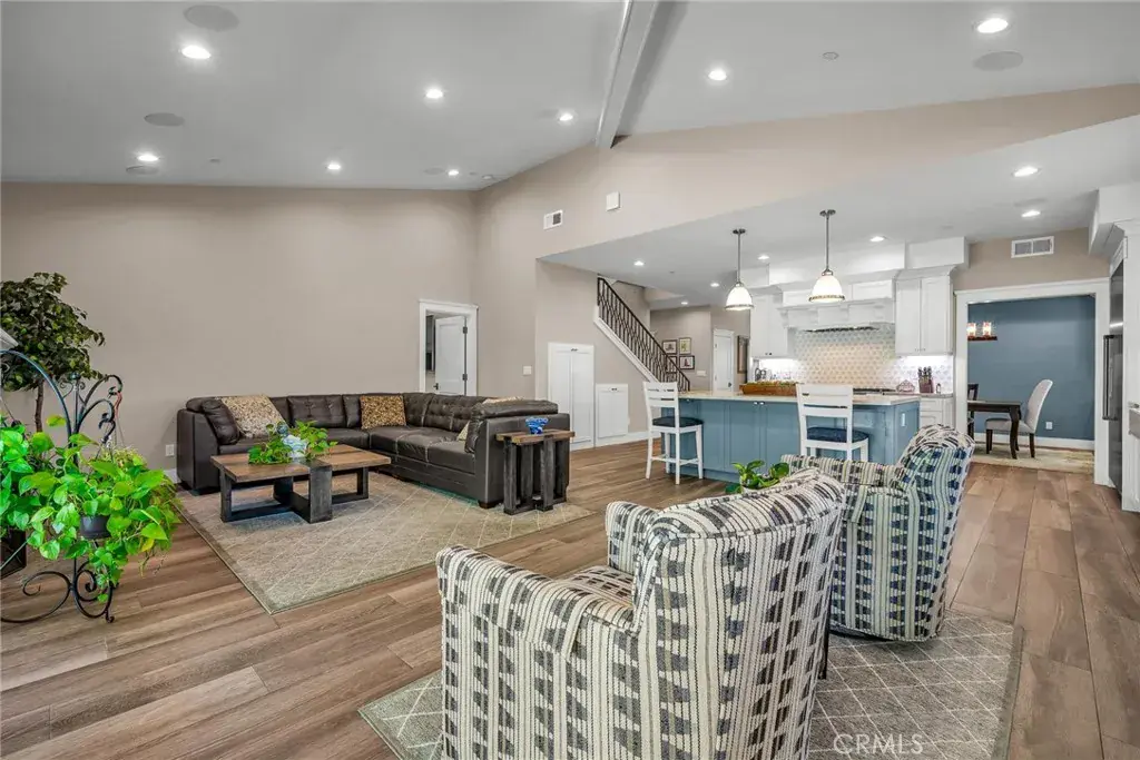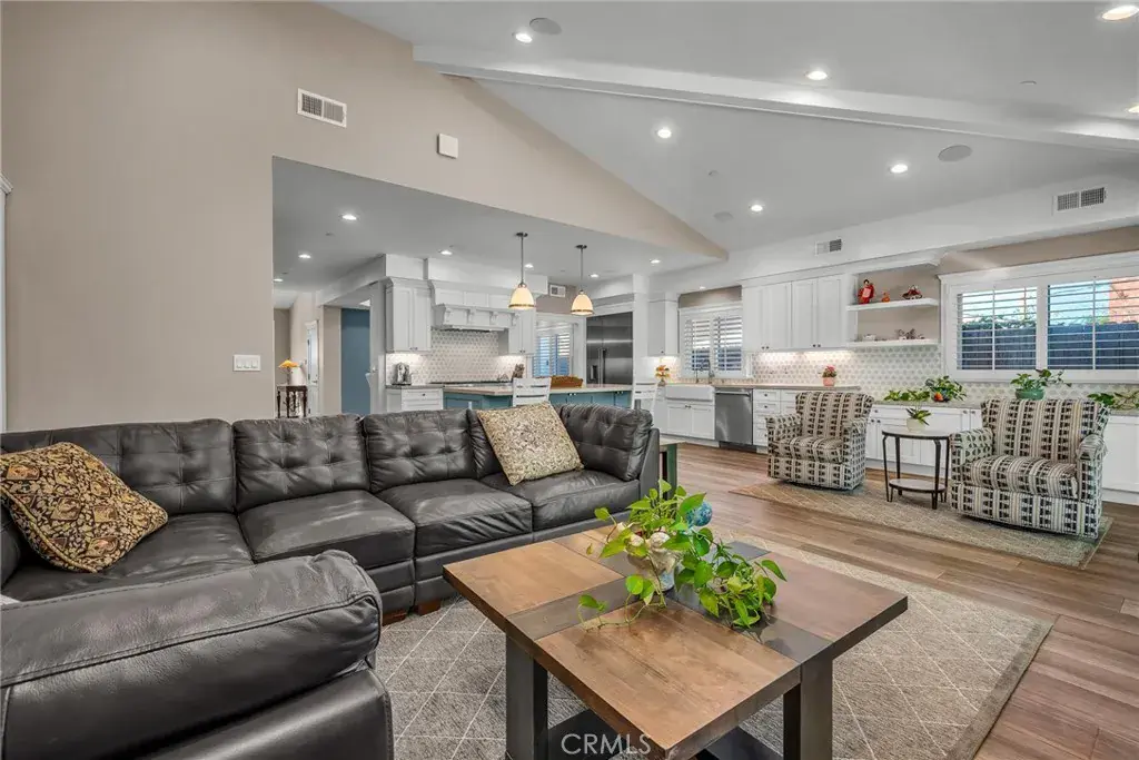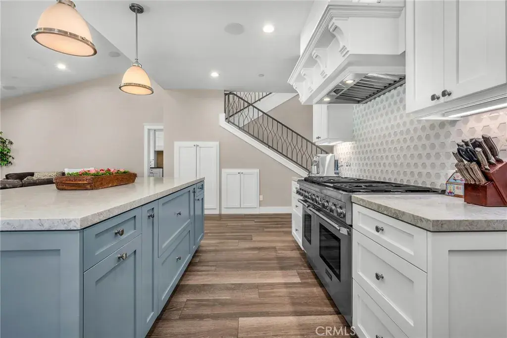 countertops and custom backsplash. Open family room with gas fireplace, TV and with soaring vaulted