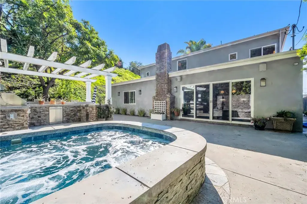 and patio area with a custom oversized spa with waterfall accent, propane gas firepit, custom built-in out