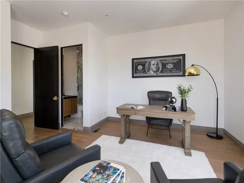 Four pocket sliders create seamless indoor-outdoor living, connecting to a 375 sq. ft. California room with built-in BBQ. The backyard features a pool, spa, firepit, and detached guest suite ideal as a studio, office, or pool house. Downstairs also includes a guest bedroom with ensuite bath, a powder room, and an additional private room with bath off the pool area—perfect for guests or a home office.