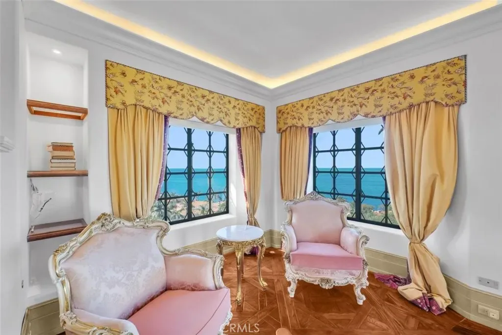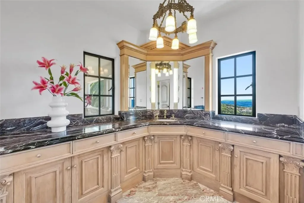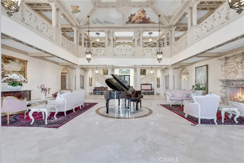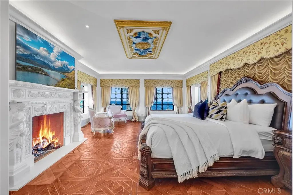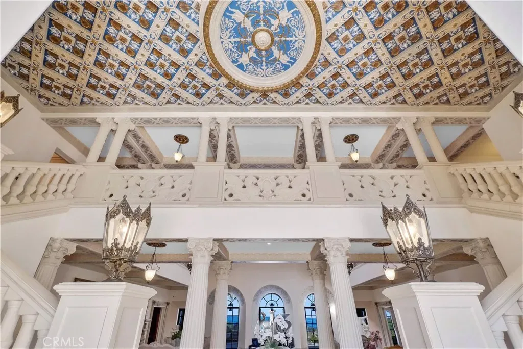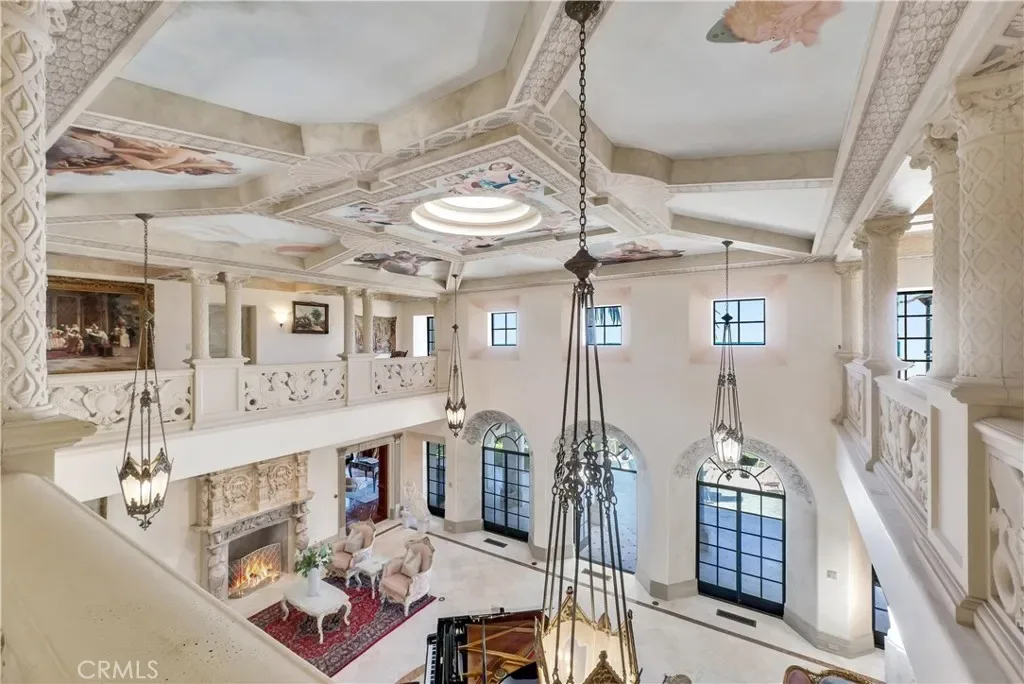 Hand-carved and coffered decorative ceilings; Elegant European-style fireplaces; A richly appointed wood-paneled study; A dramatic double-height grand hall; Expansive windows capturing sweeping Pacific views.