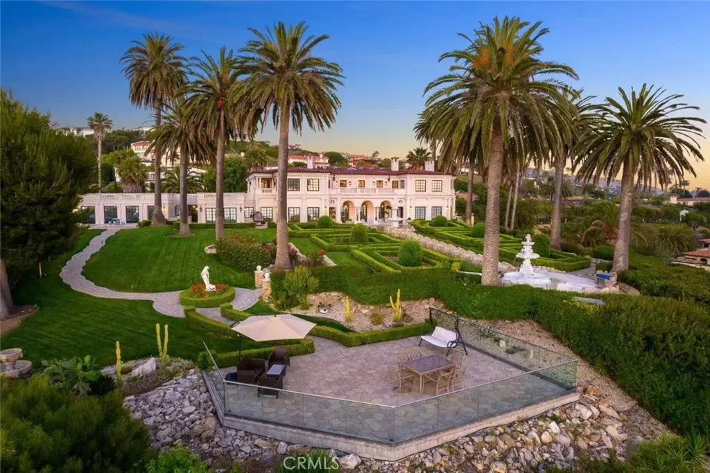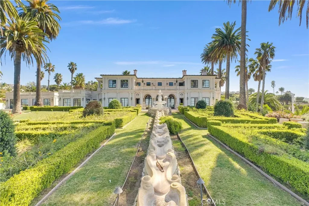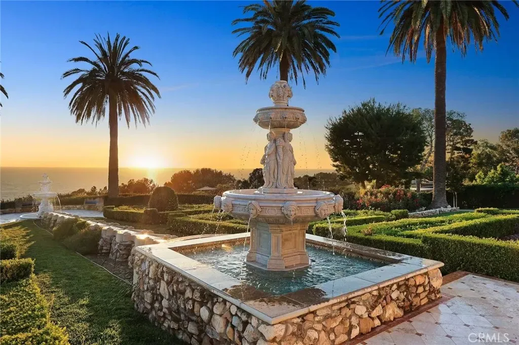 The estate grounds feature a beautifully composed formal garden with axial water elements, a tradition rooted in classic European design. Such compositions are exceptionally rare in coastal Palos Verdes and contribute significantly to the estate’s character and collectibility. Framed by manicured landscaping and ocean vistas, the grounds offer both privacy and sophistication.